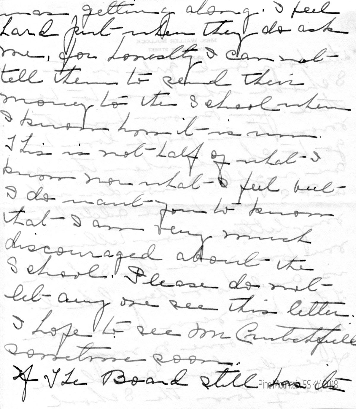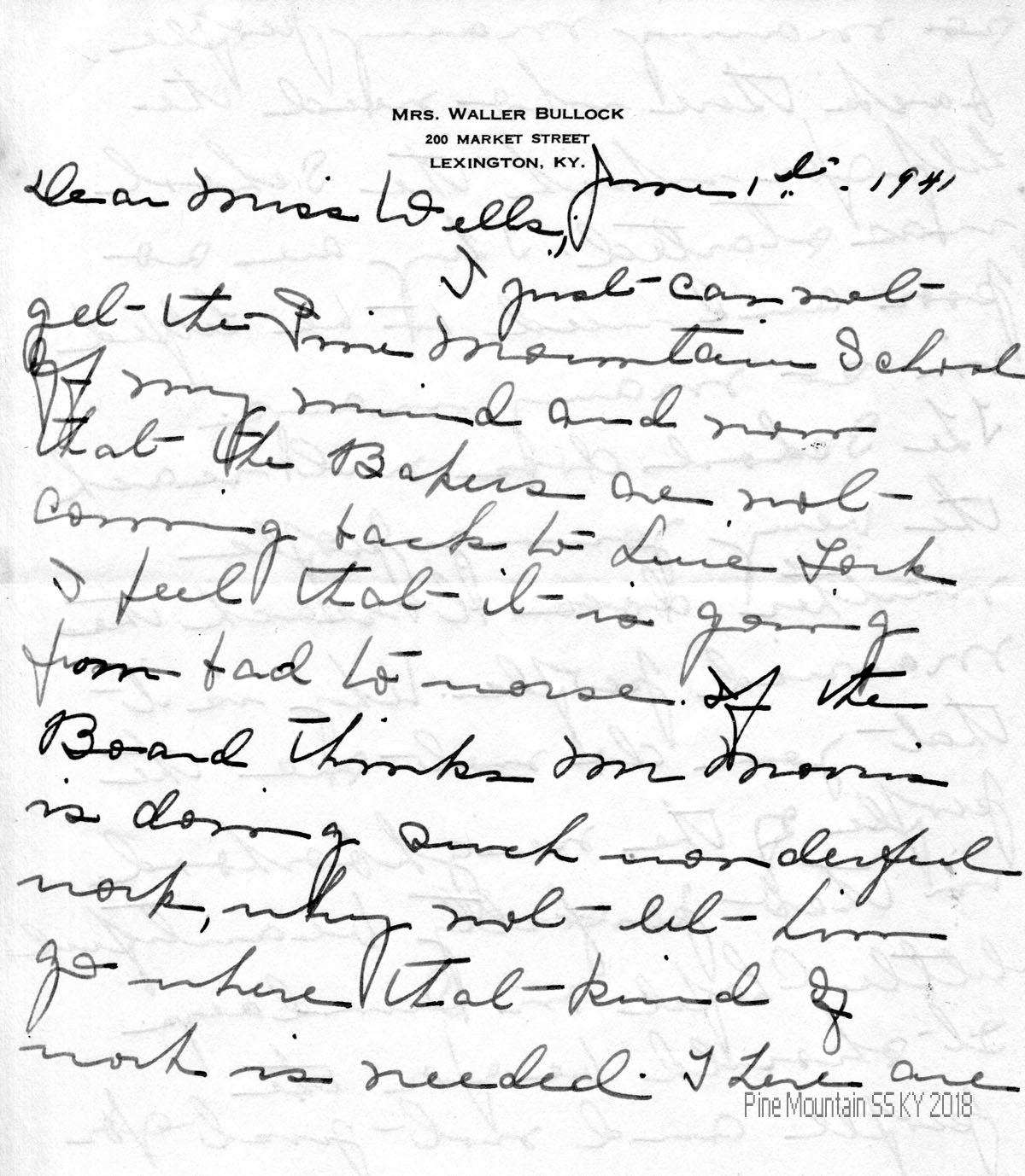 004-004d June 1, 1941. Five-page handwritten letter to Wells from Bullock in Lexington, KY, 004 who feels that the School “is going from bad to worse,” now that the Bakers are not returning to Line Fork. Morris should be allowed to “go where that kind of work is needed.” 004a She describes how many of the people “back there” need help. She feels that “The School does not reach the very young people …[nor] the married people”; the Chapel should be used by all, not just for 004b the students. 004c Bullock is “very much discouraged about the School” and asks that no-one sees her letter. She hopes to see [J.S.] Crutchfield soon. 004d She hopes that the board has “an ear to the ground [and that] it is not a deaf one.”