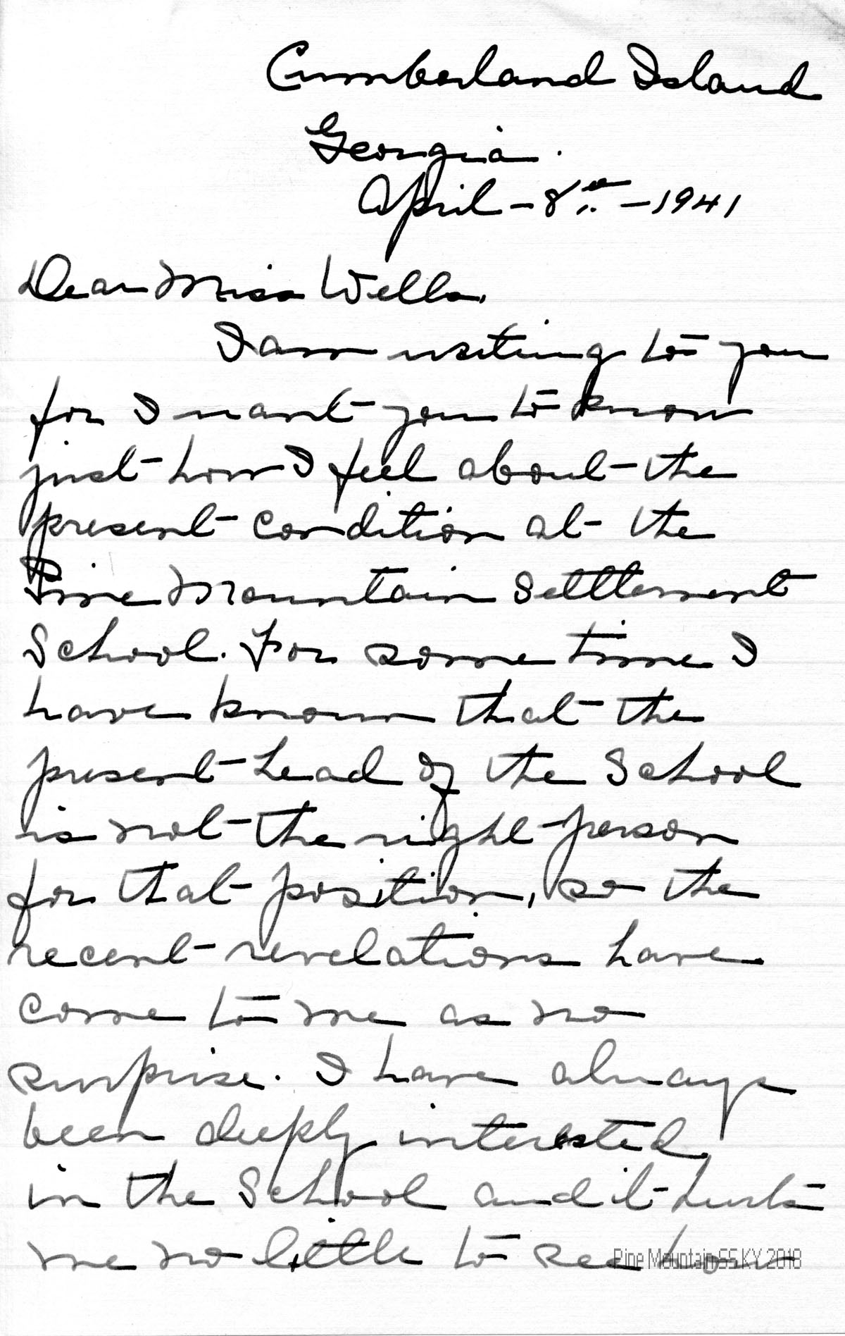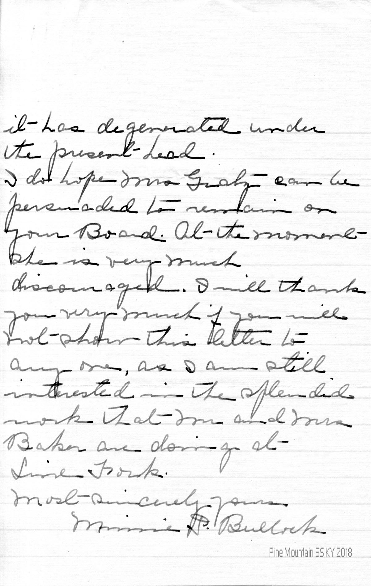 006-006a April 8, 1941. Two-page handwritten letter to Miss [Evelyn K.] Wells from MInnie P. [Mrs. Waller] Bullock at Cumberland Island, GA, 006 who writes of her disappointment with the “present head of the School” and recent developments at the School. 006a She hopes that Mrs. [Fannie] Gratz, who is also discouraged, will stay on the Board; she asks that no-one else sees this letter, as she is “still interested in the splendid work that Mr. and Mrs. [Richard] Baker are doing at Line Fork.”