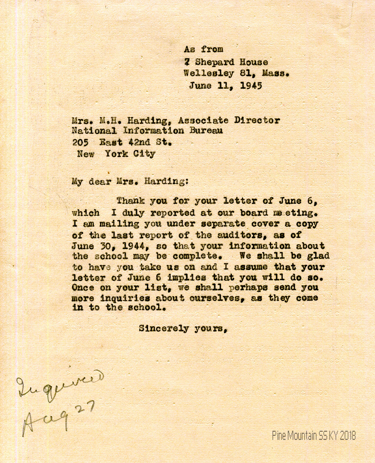 | [04] June 11, 1945 | Evelyn Wells to Mrs. M.H. Harding concerning the mailing of the school’s last auditors report. | 1 |