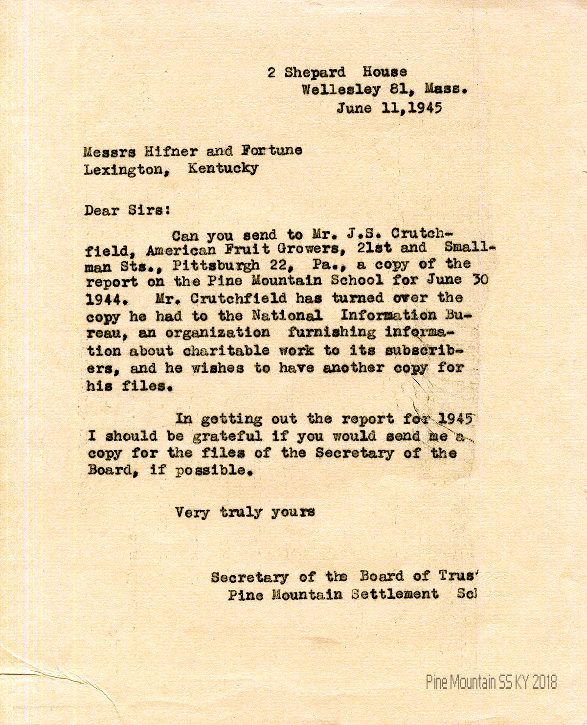 | [05] June 11, 1945 | Evelyn Wells to Messrs Hifner and Fortune (auditors) requesting they send a copy of the school’s June 30, 1944, auditors report to J.S. Crutchfield | |