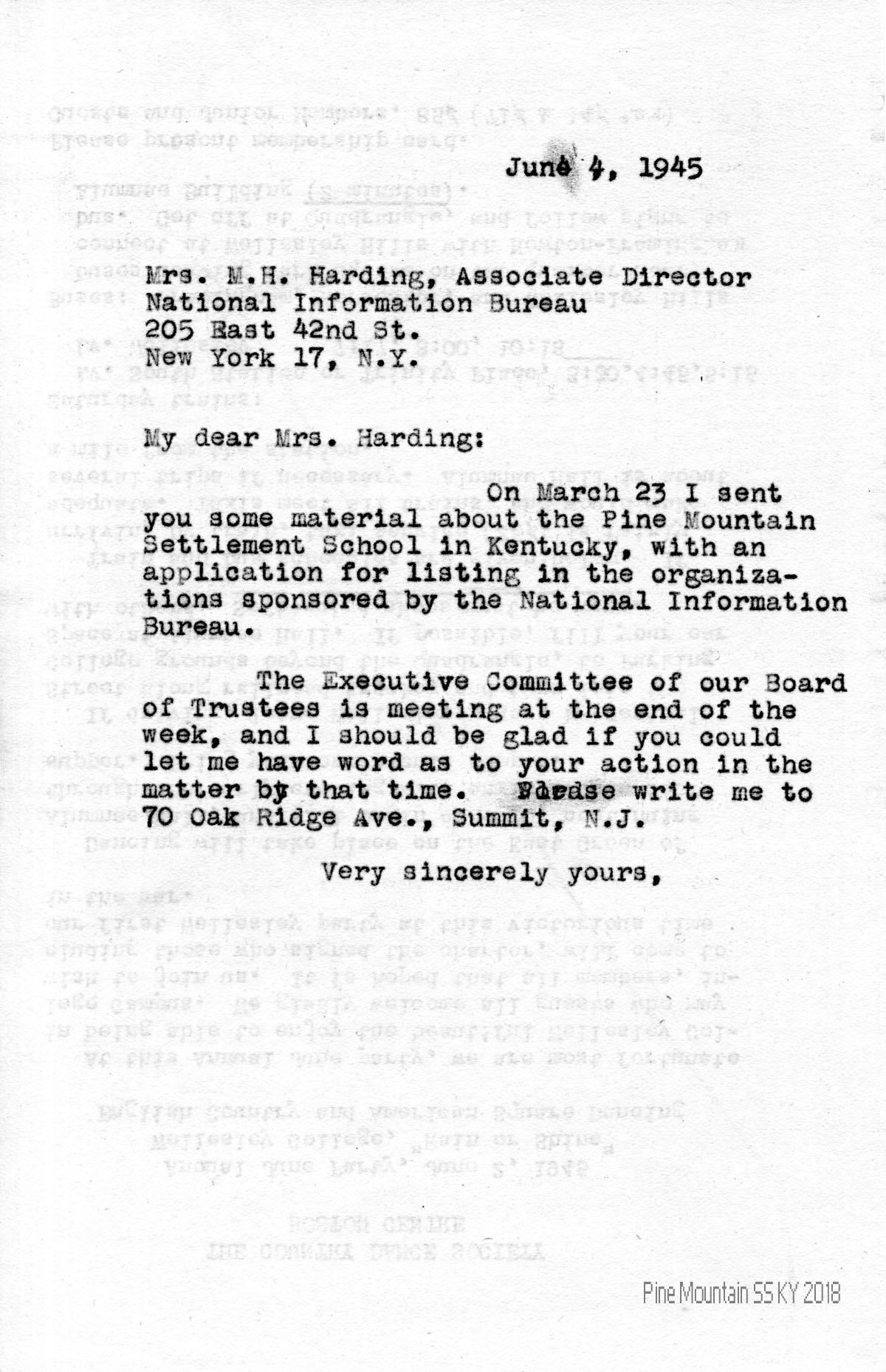 | [06] June 4, 1945 | Evelyn Wells to M.H. Harding, Associate Director of National Information Bureau, concerning an application for “listing in the Bureau’s sponsored organizations.” Note: the National Information Bureau was an organization that furnished information about charitable work to its subscribers. | 1 |