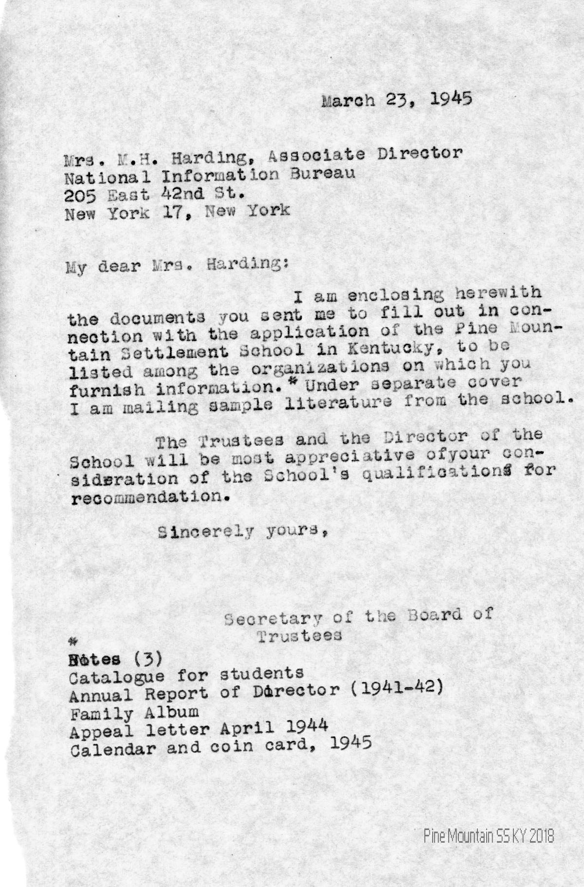 | [07] March 23, 1945 | Evelyn Wells to M.H. Harding, Associate Director of National Information Bureau, enclosing information for the school’s application to be listed among the organizations on which the Bureau furnishes information. | 1 |