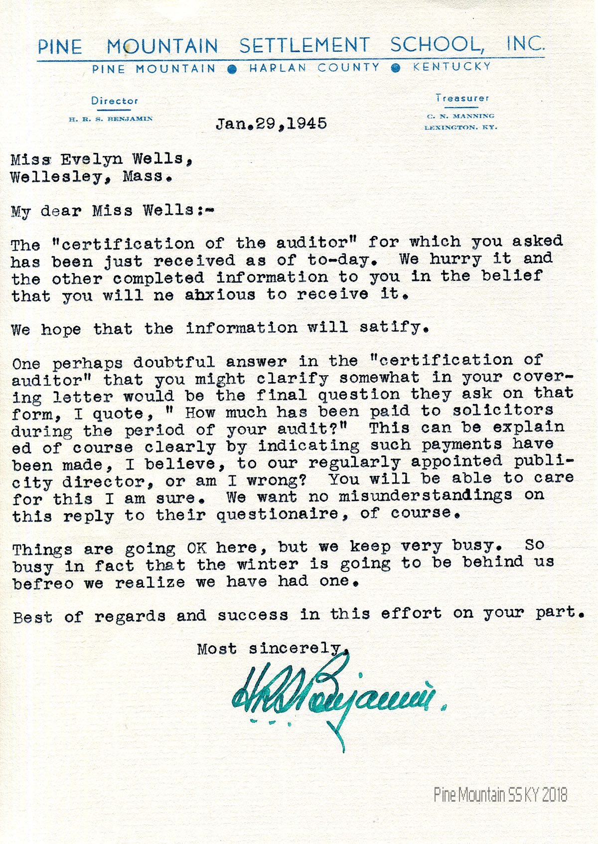TAGS: BOT 1945 Correspondence, Board of Trustees of Pine Mountain Settlement School, H.R.S. Benjamin, Evelyn K. Wells, Burton Rogers, J.S. Crutchfield, Dr. Alfred L. Swift Jr., auditors, Glyn Morris, Dorothy Bolles, Dr. Van Vleck, Mrs. Elsmith, National Information Bureau, Council of the Southern Mountains