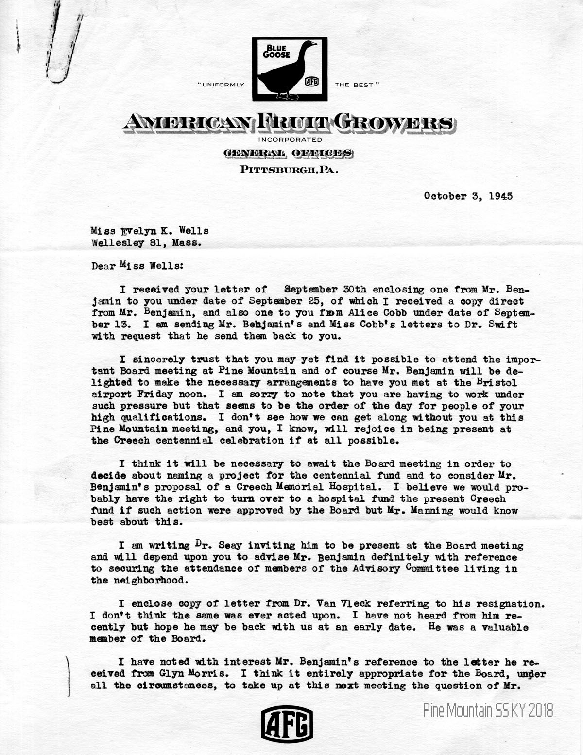 | [09] October 3, 1945 | J.S. Crutchfield to Evelyn Wells concerning upcoming board meeting, Creech centennial celebration, and Creech Memorial Hospital. Dr. Van Vleck resignation from Board. Glyn Morris being considered for directorship. Mrs. Elsmith‘s resignation from Board. [Image of page 2 is missing.] | 2 |