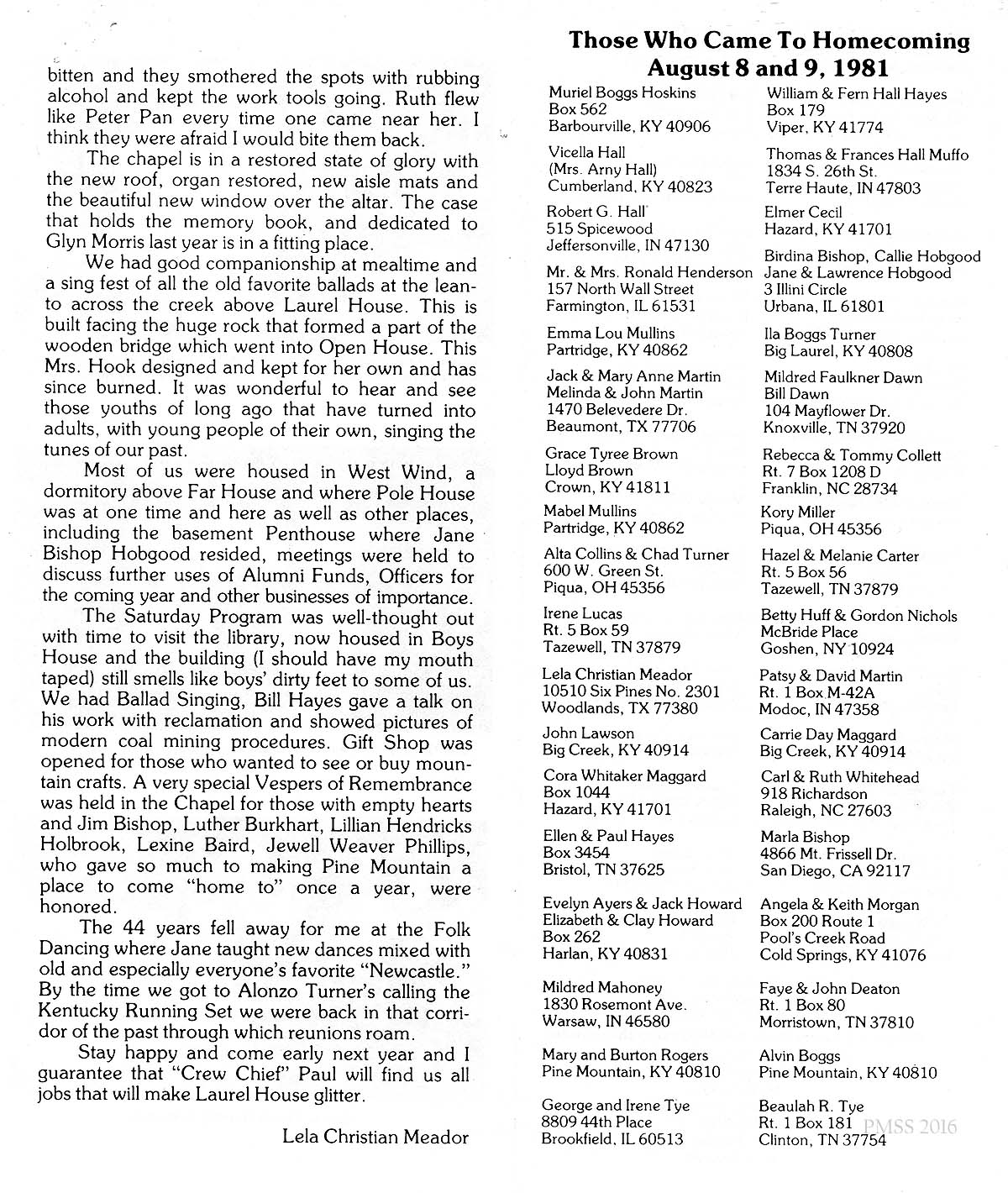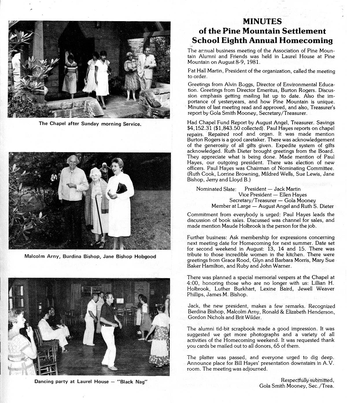 The annual business meeting of the Association of Pine Mountain Alumni and Friends was held in Laurel House at Pine Mountain on August 8-9, 1981.