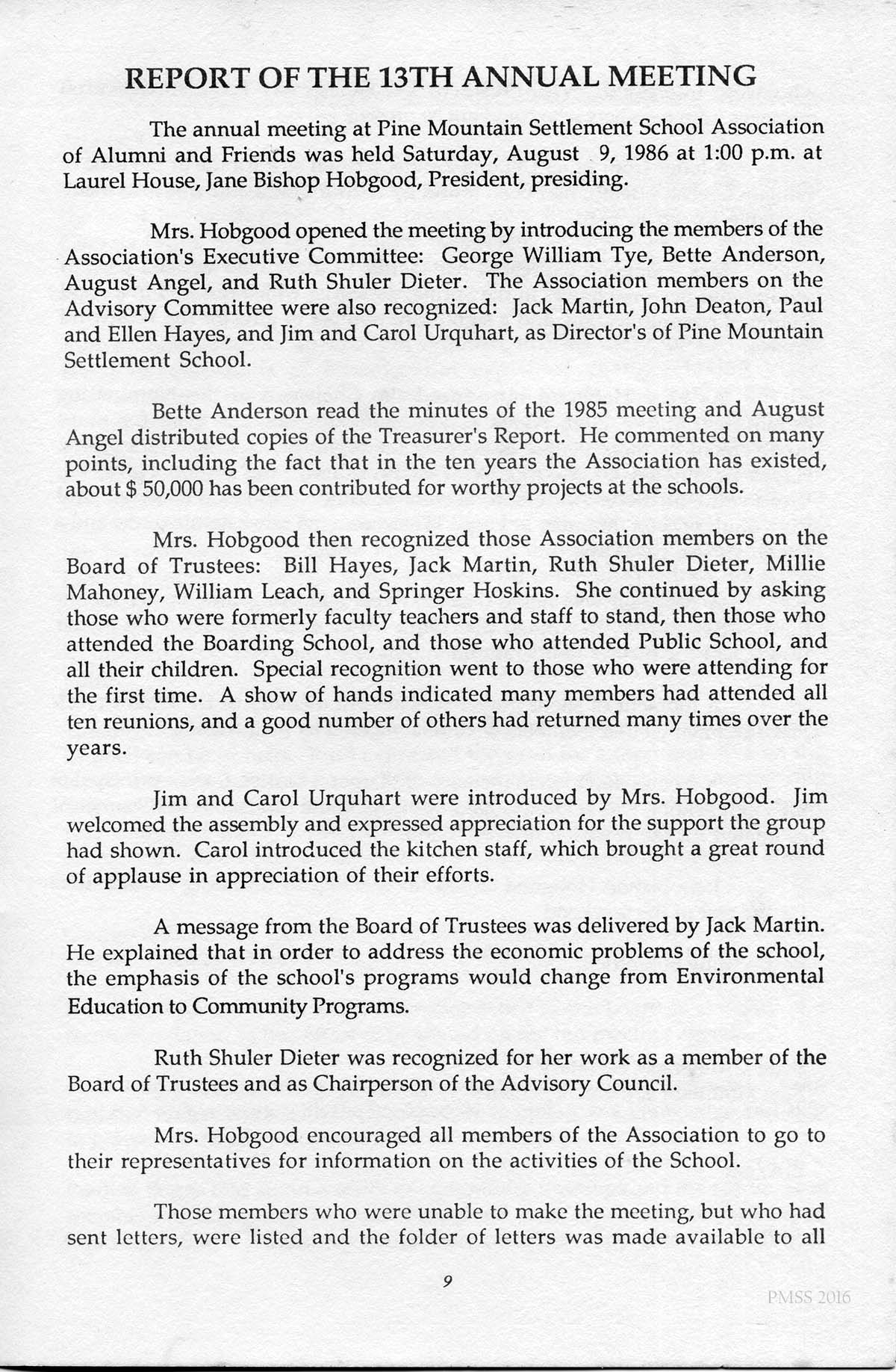 The annual meeting at Pine Mountain Settlement School Association of Alumni and Friends was held Saturday, August 9, 1986, at 1:00 p.m. at Laurel House, Jane Bishop Hobgood, President, presiding.