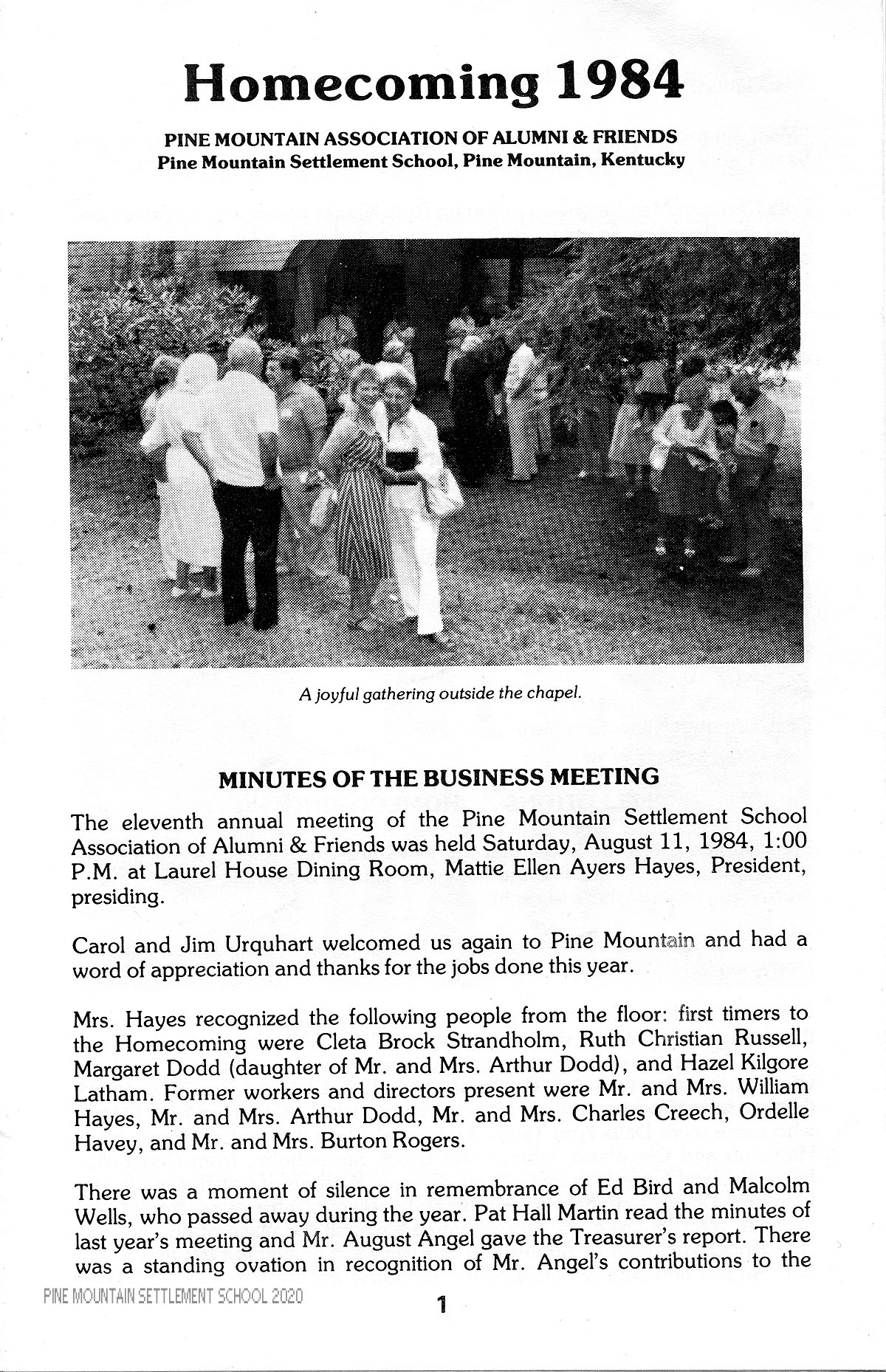 The eleventh annual meeting of the Pine Mountain Settlement School Association of Alumni & Friends was held Saturday, August 11, 1984, 1:00 P.M. at Laurel House Dining Room, Mattie Ellen Ayers Hayes, President, presiding.