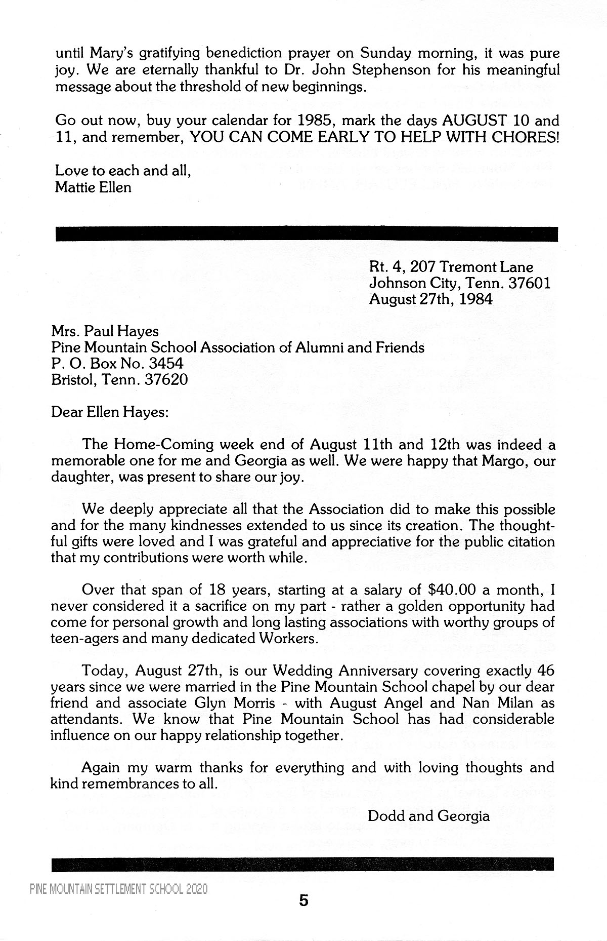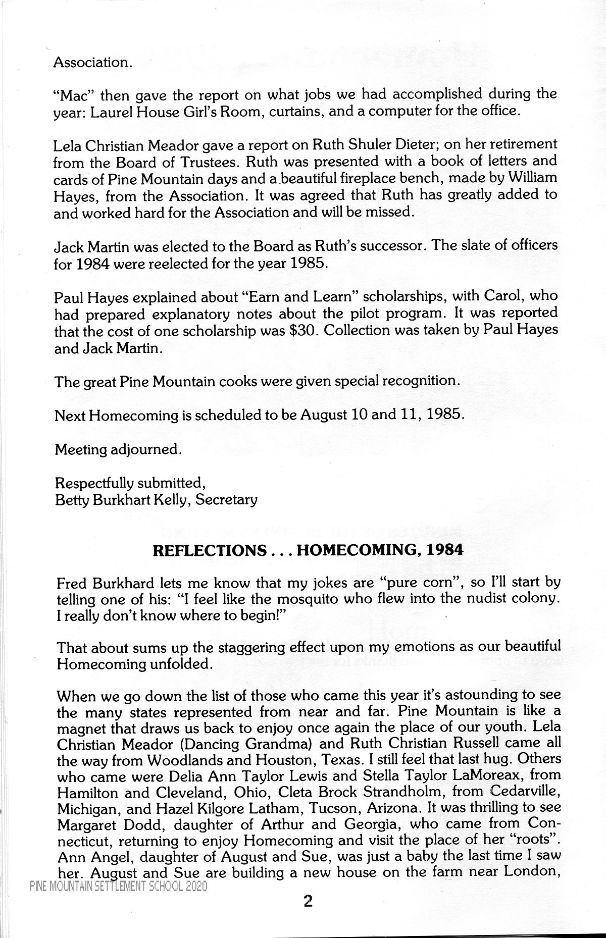 TAGS: Alumni Relations 1984 Newsletter, Pine Mountain Association of Alumni & Friends, alumni homecoming meeting, “Earn and Learn” scholarships, PMSS Octet, Arthur Dodd, Ruth Shuler Dieter, Chapel marriage, country dancing revival