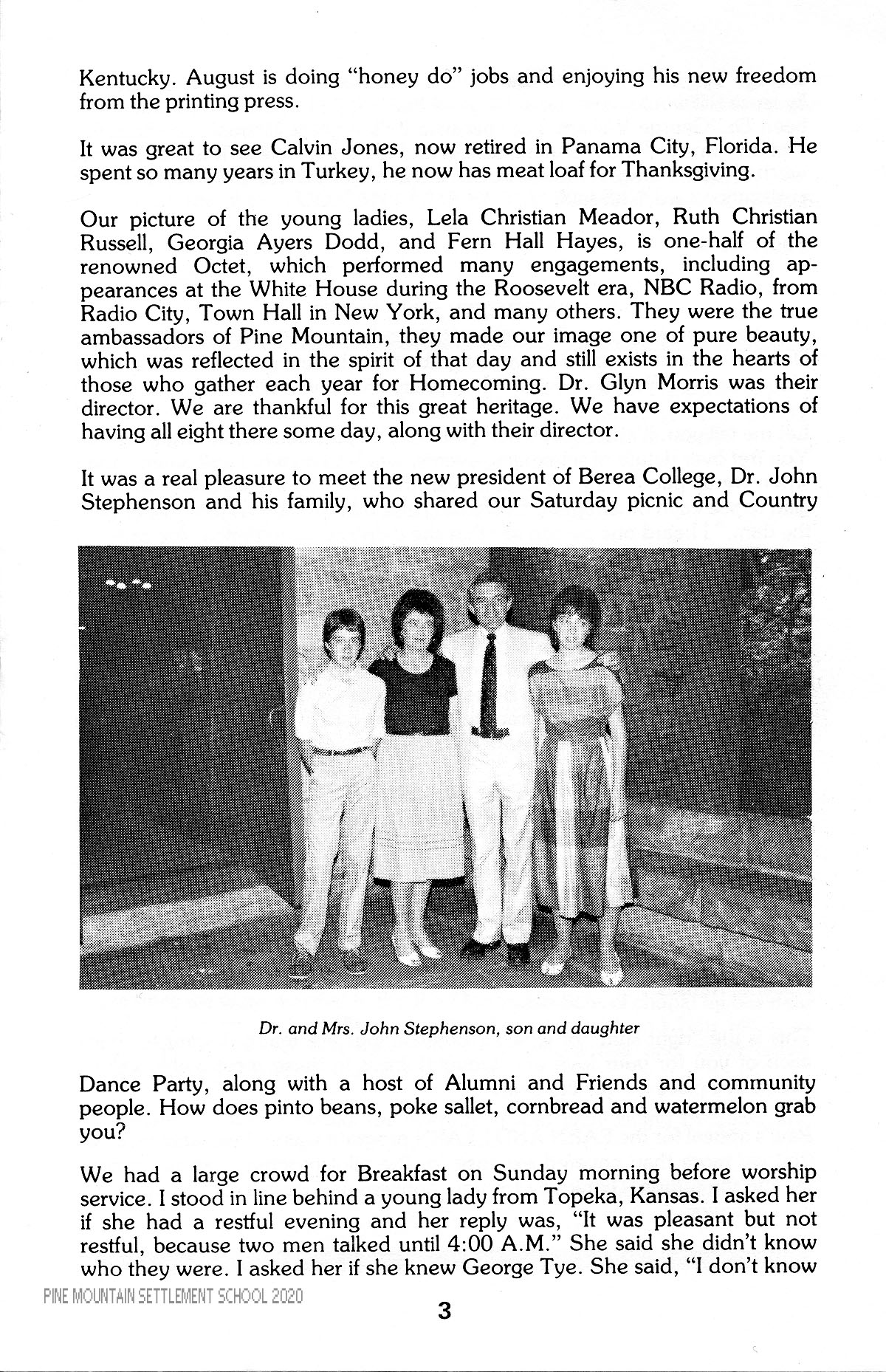 Our picture of the young ladies, Lela Christian Meador, Ruth Christian Russell, Georgia Ayers Dodd, and Fern Hall Hayes, is one-half of the renowned Octet, which performed many engagements, including appearances at the White House during the Roosevelt era. NBC Radio, from Radio City, Town Hall in New York, and many others. They were the true ambassadors of Pine Mountain, they made our image one of pure beauty, which was reflected in the spirit of that day and still exists in the hearts of those who gather each year for Homecoming. Dr. Glyn Morris was their director. We are thankful for this great heritage. We have expectations of having all eight there some day, along with their director.