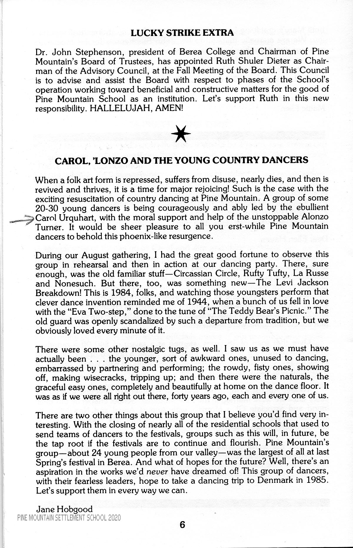 When a folk art form is repressed, suffers from disuse, nearly dies, and then is revived and thrives, it is a time for major rejoicing! Such is the case with the exciting resuscitation of country dancing at Pine Mountain. A group of some 20-30 young dancers is being courageously and ably led by the ebullient Carol Urquhart, with the moral support and help of the unstoppable Alonzo Turner. It would be sheer pleasure to all you erst-while Pine Mountain dancers to behold this phoenix-like resurgence.
