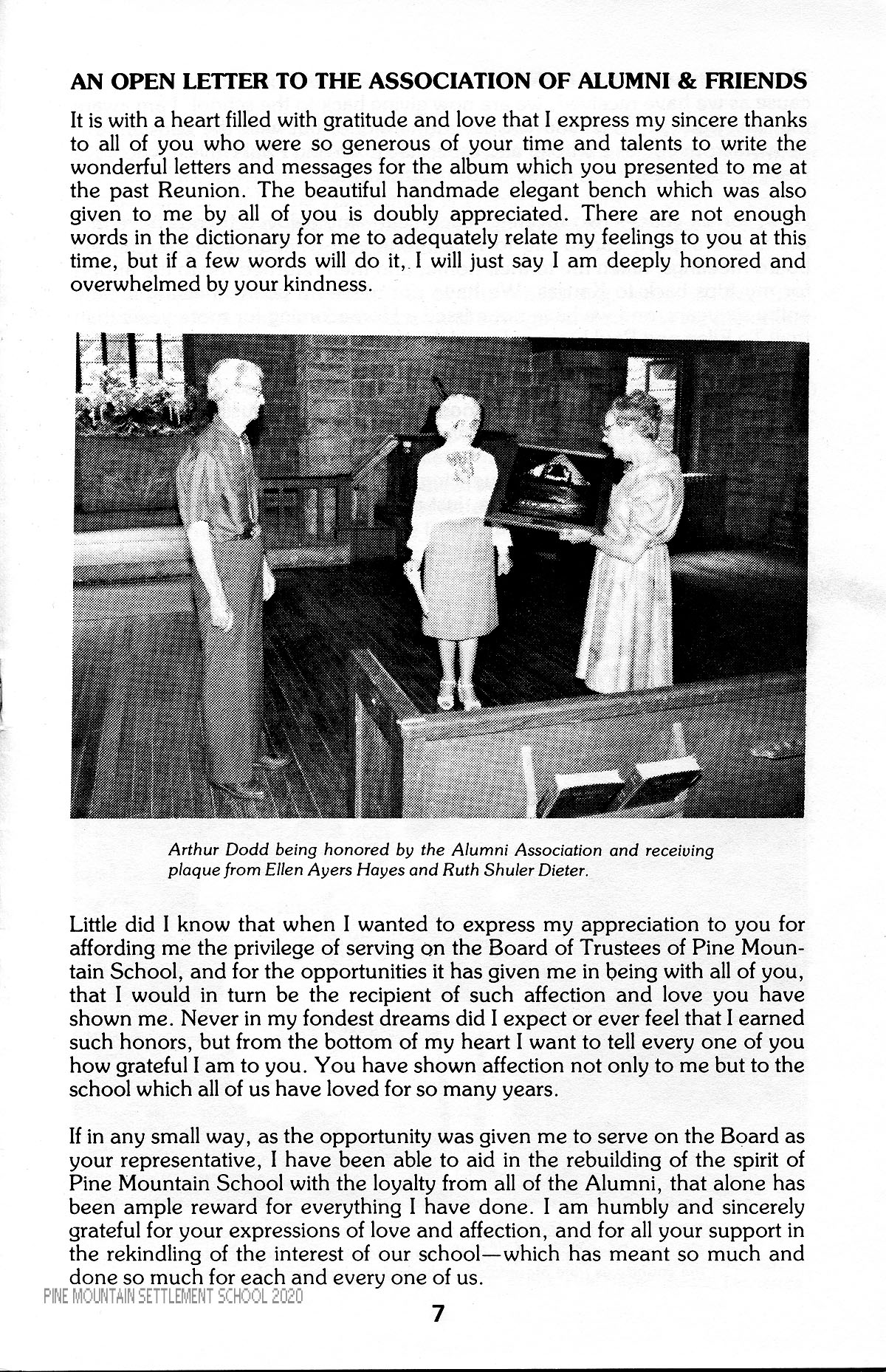 If in any small way, as the opportunity was given me to serve on the Board as your representative, I have been able to aid in the rebuilding of the spirit of Pine Mountain School with the loyalty from all of the Alumni, that alone has been ample reward for everything I have done. I am humbly and sincerely grateful for your expressions of love and affection, and for all your support in the rekindling of the interest of our school-which has meant so much and done so much for each and every one of us.