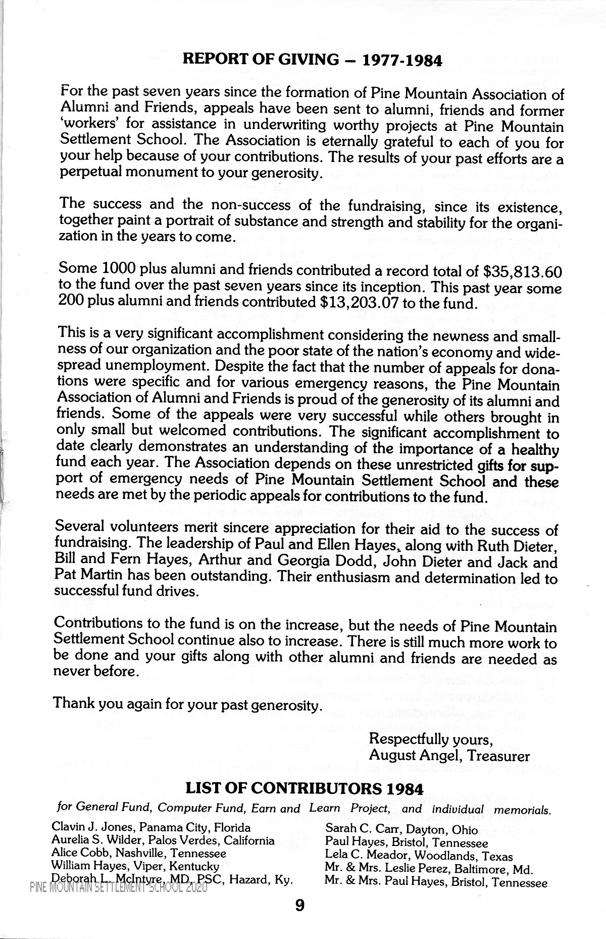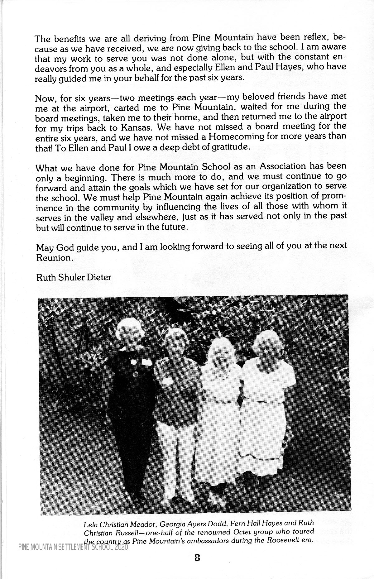 The benefits we are all deriving from Pine Mountain have been reflex, because as we have received, we are now giving back to the school. I am aware that my work to serve you was not done alone, but with the constant endeavors from you as a whole, and especially Ellen and Paul Hayes, who have really guided me in your behalf for the past six years.