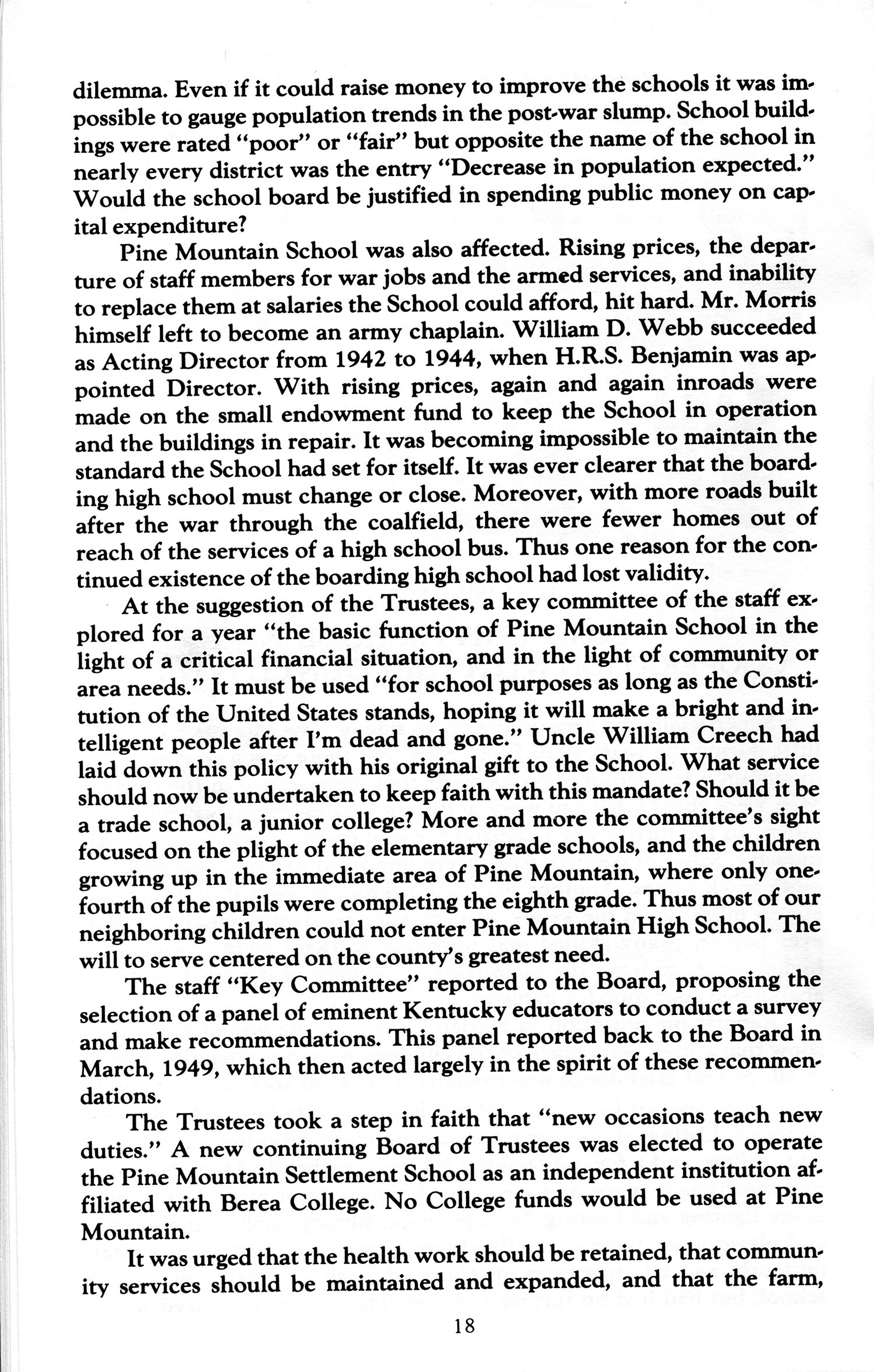 Pine Mountain School was also affected. Rising prices, the departure of staff members for war jobs and the armed services, and inability to replace them at salaries the School could afford, hit hard. Mr. [Glyn] Morris himself left to become an army chaplain. William D. Webb succeeded as Acting Director from 1942 to 1944, when H.R.S. Benjamin was appointed Director. With rising prices, again and again inroads were made on the small endowment fund to keep the School in operation and the buildings in repair. It was becoming impossible to maintain the standard the School had set for itself. It was ever clearer that the boarding high school must change or close. Moreover, with more roads built after the war through the coalfield, there were fewer homes out of reach of the services of a high school bus. Thus one reason for the continued existence of the boarding high school had lost validity.