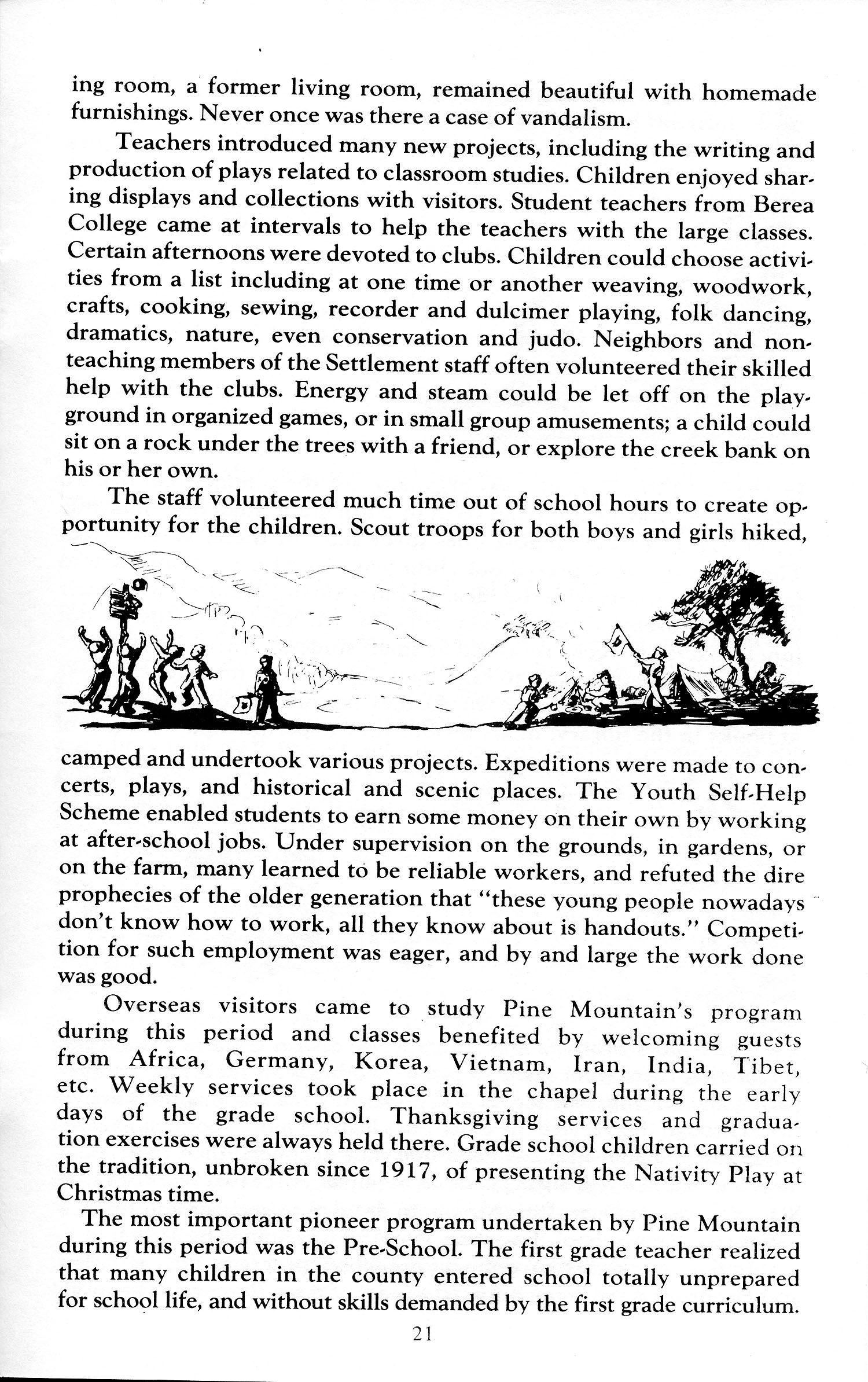 The most important pioneer program undertaken by Pine Mountain during this period was the Pre-School. The first grade teacher realized that many children in the county entered school totally unprepared for school life, and without skills demanded by the first grade curriculum.