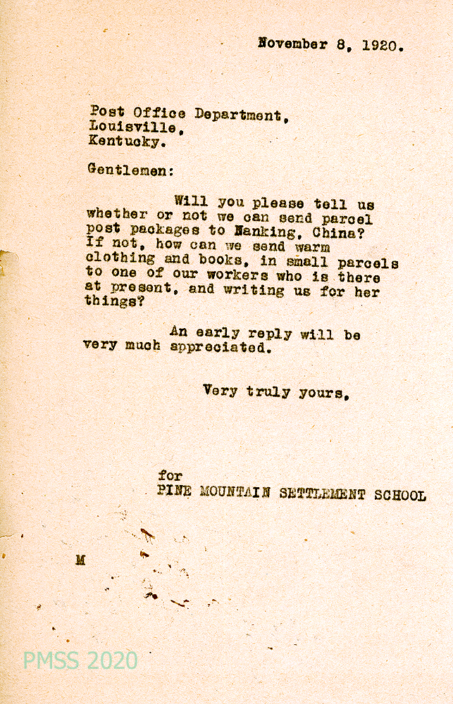 03 November 8, 1920. Carbon copy of typewritten letter to Gentlemen, Post Office Department, Louisville, Kentucky, from [unsigned] for Pine Mountain Settlement School, asking if it is possible to “send parcel post packages to Nanking, China? If not, how can we send warm clothing and books in small parcels to one of our workers who is there at present and writing us for her things?”