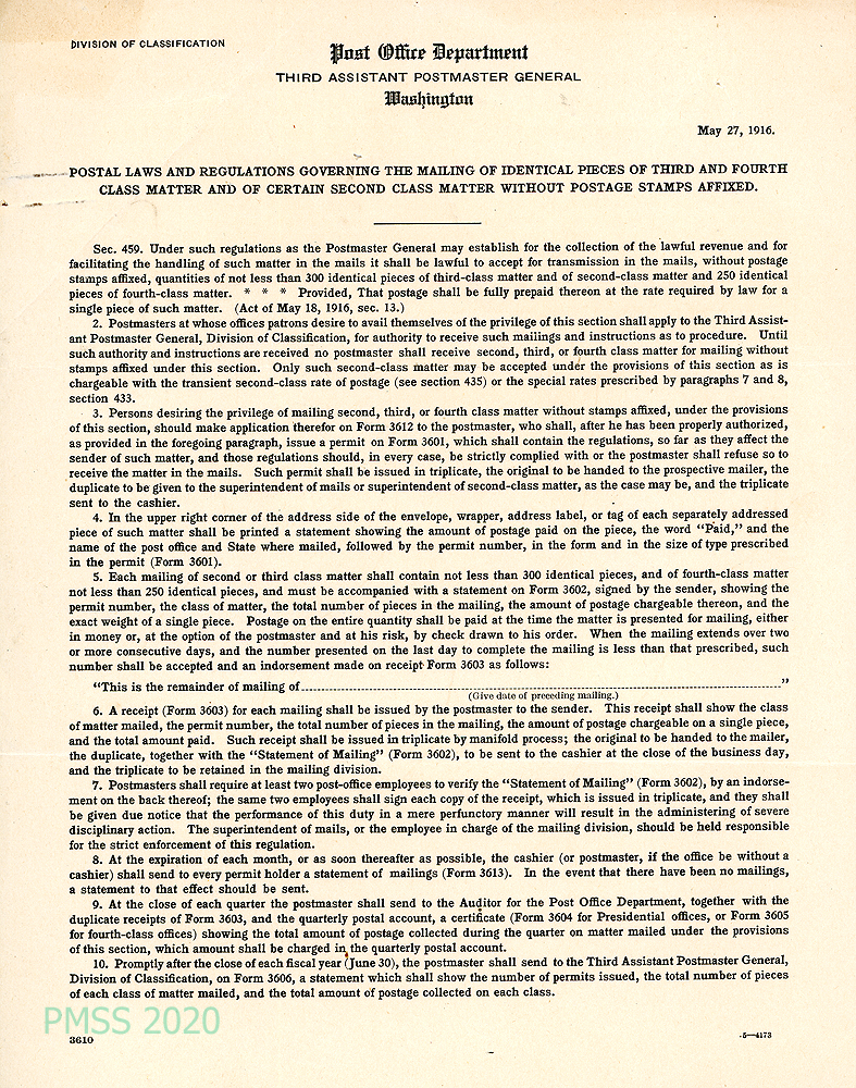 01 May 27, 1916. Original copy of notice from “Post Office Department, Division of Classification, Third Assistant Postmaster General, Washington, [concerning] [p]ostal laws and regulations governing the mailing of identical pieces of third and fourth class matter and of certain second class matter without postage stamps affixed.”