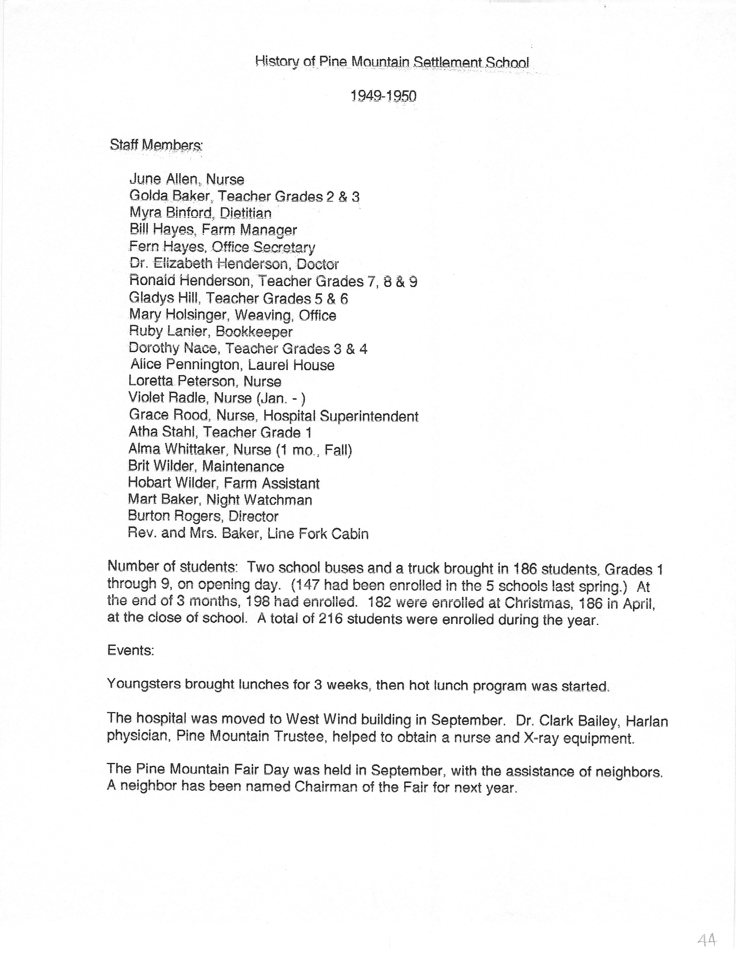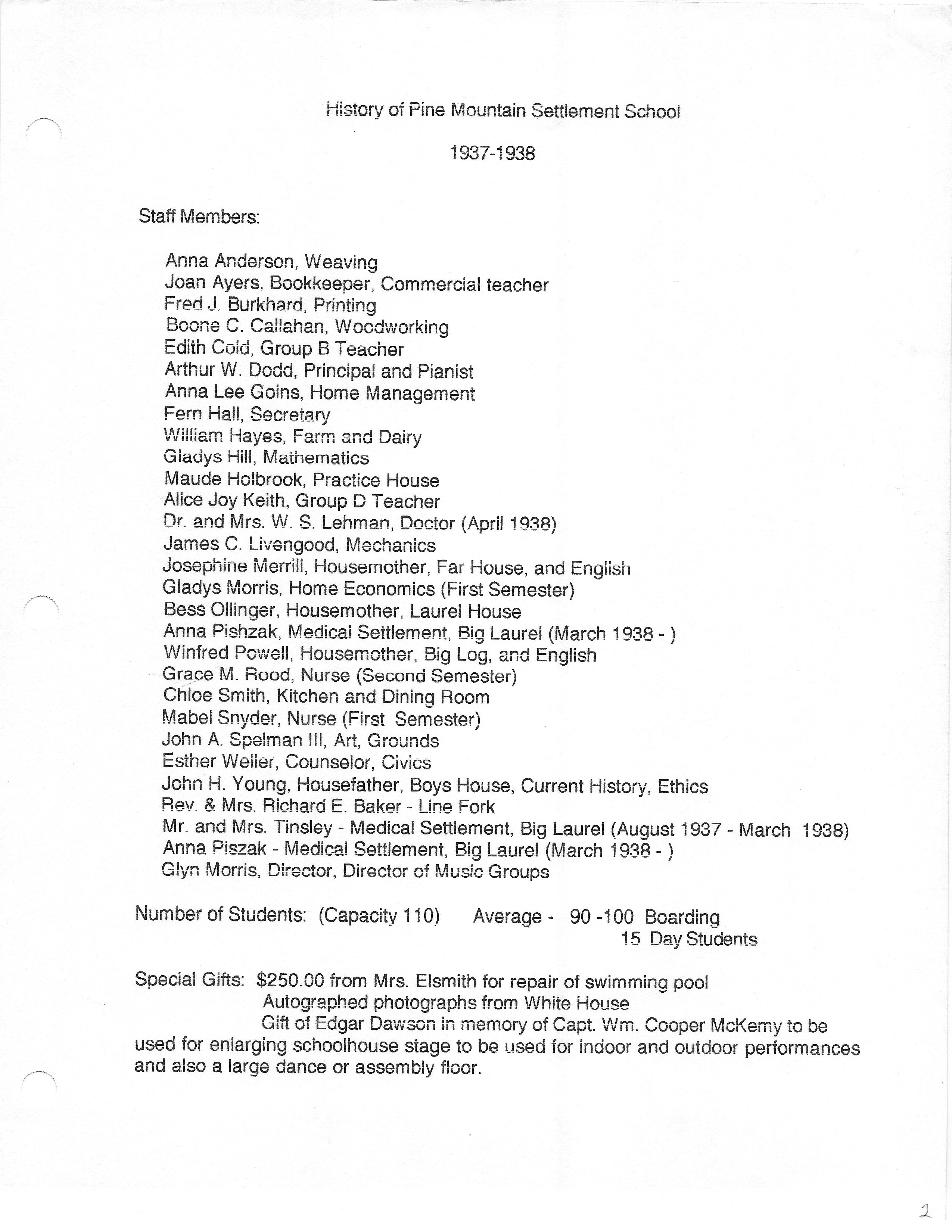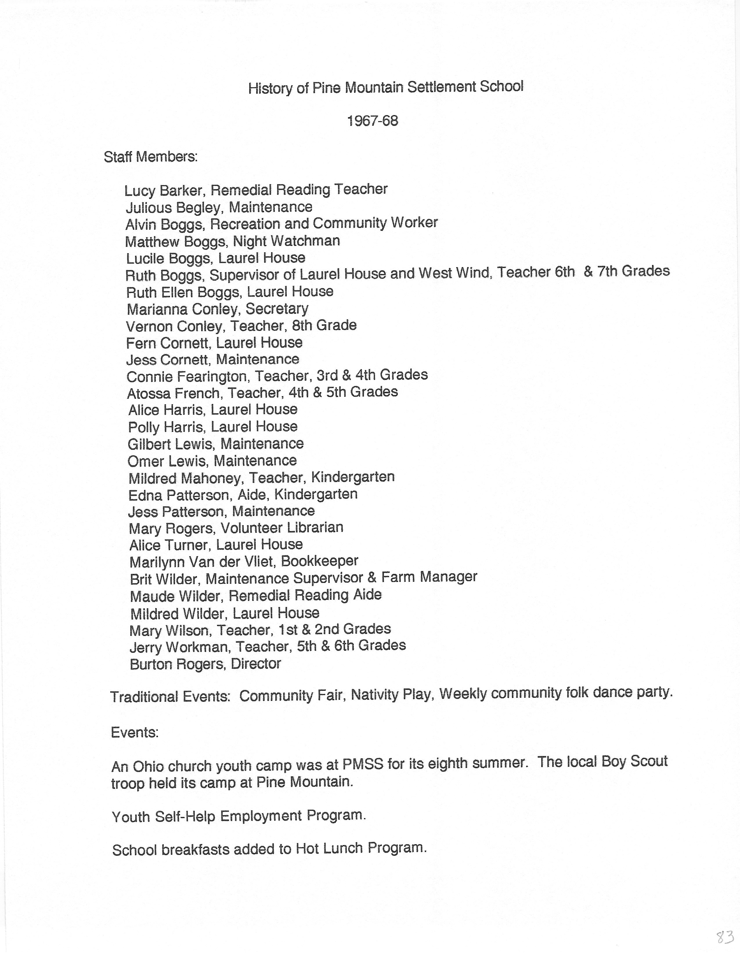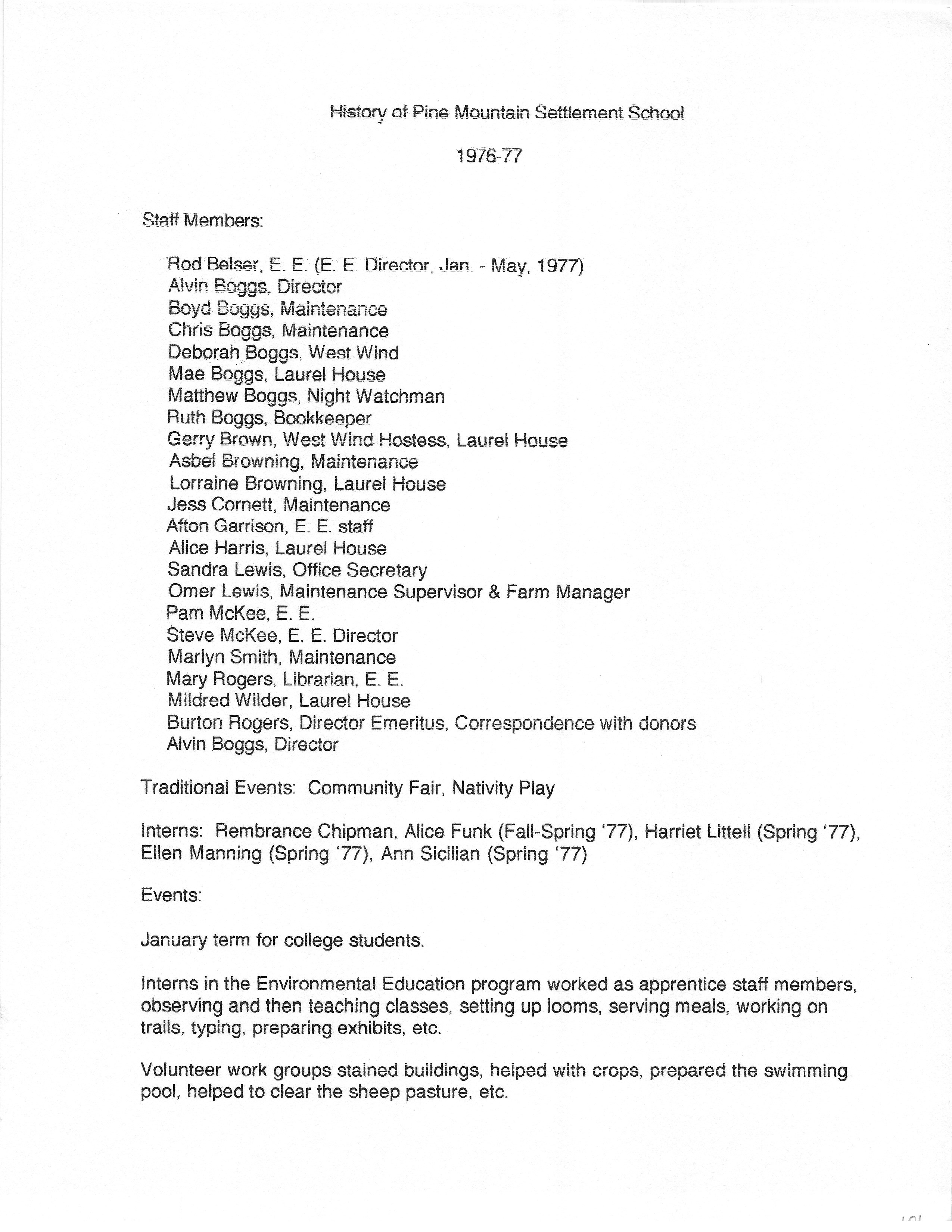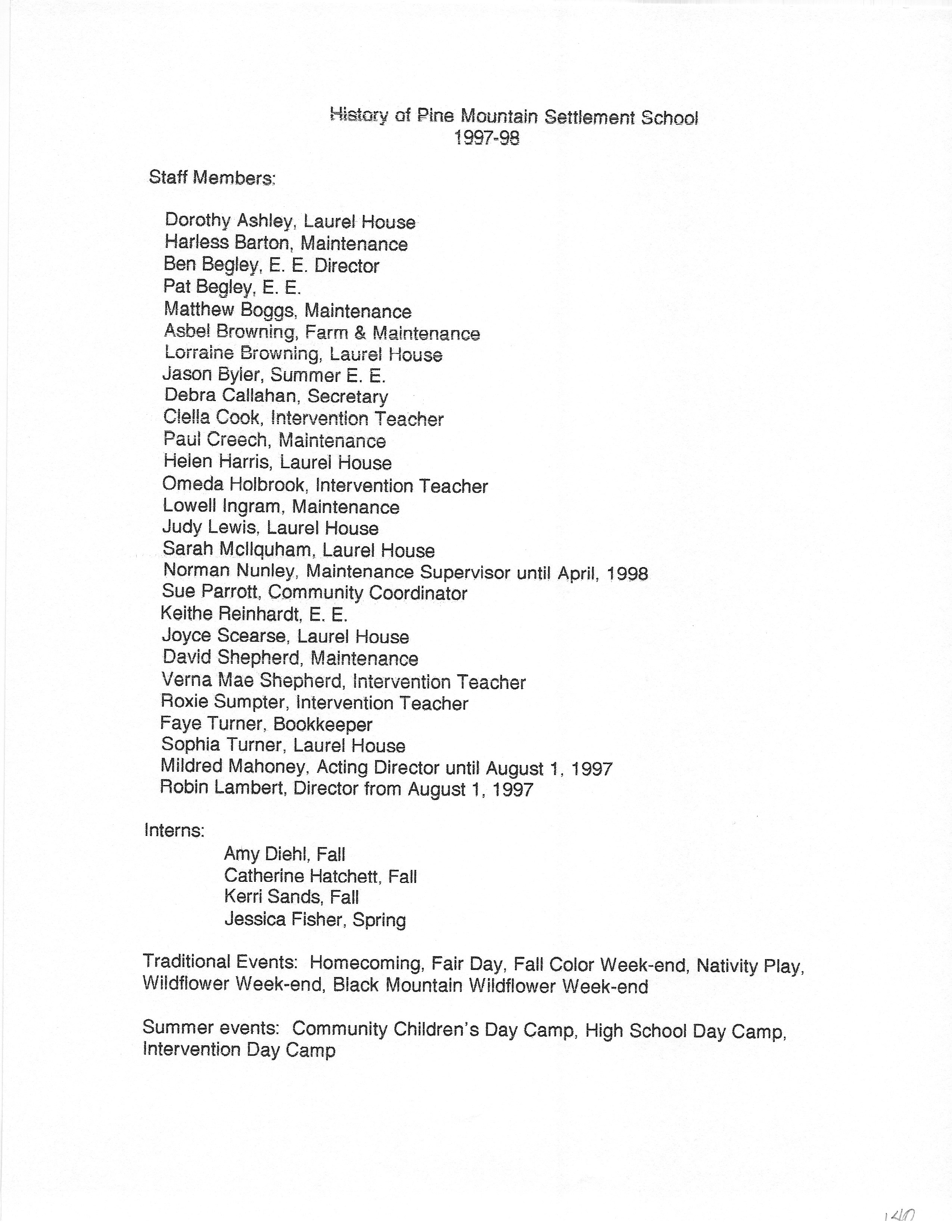 The HISTORY PMSS 1937-2000 GALLERY displays images of the file containing summaries of the employees, activities and visitors at Pine Mountain Settlement School between the years of 1937 until 2000. The author is unknown but it appears to be the work of Mildred Mahoney while she was Interim Director of the School from October 1996 through August 1997.