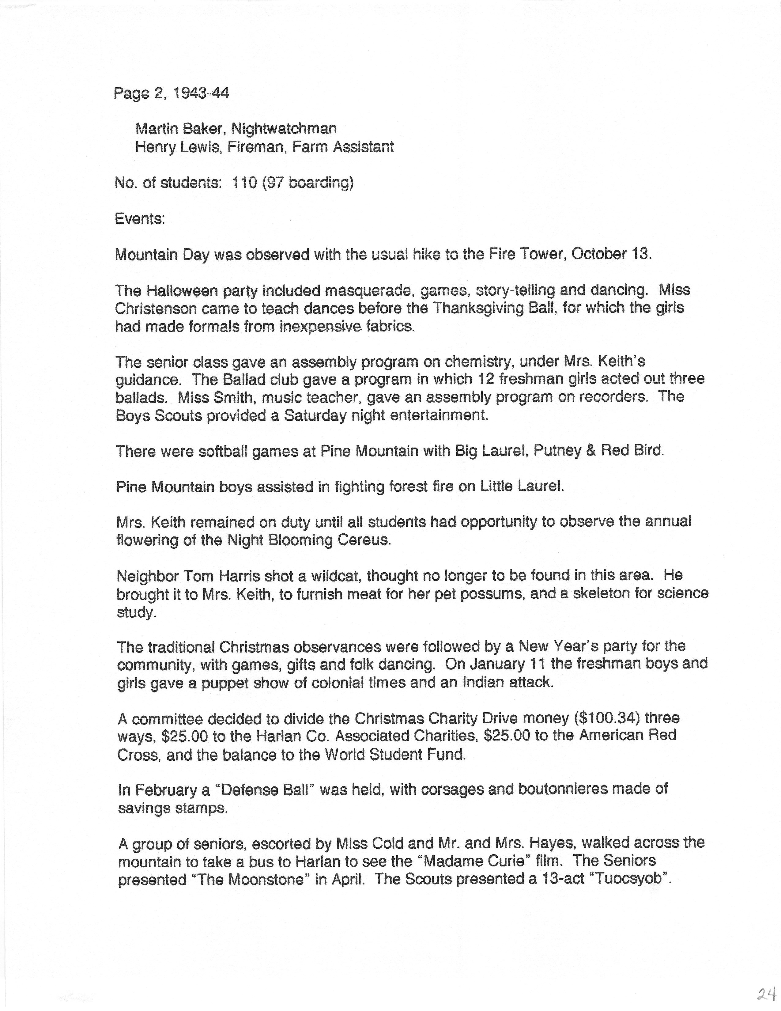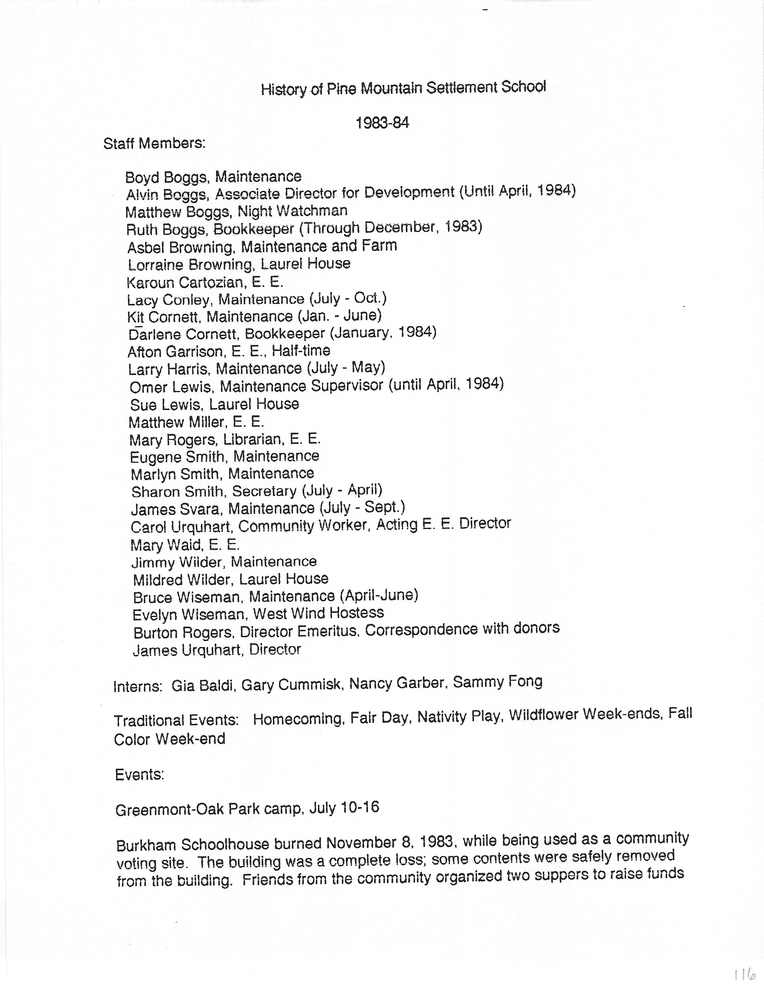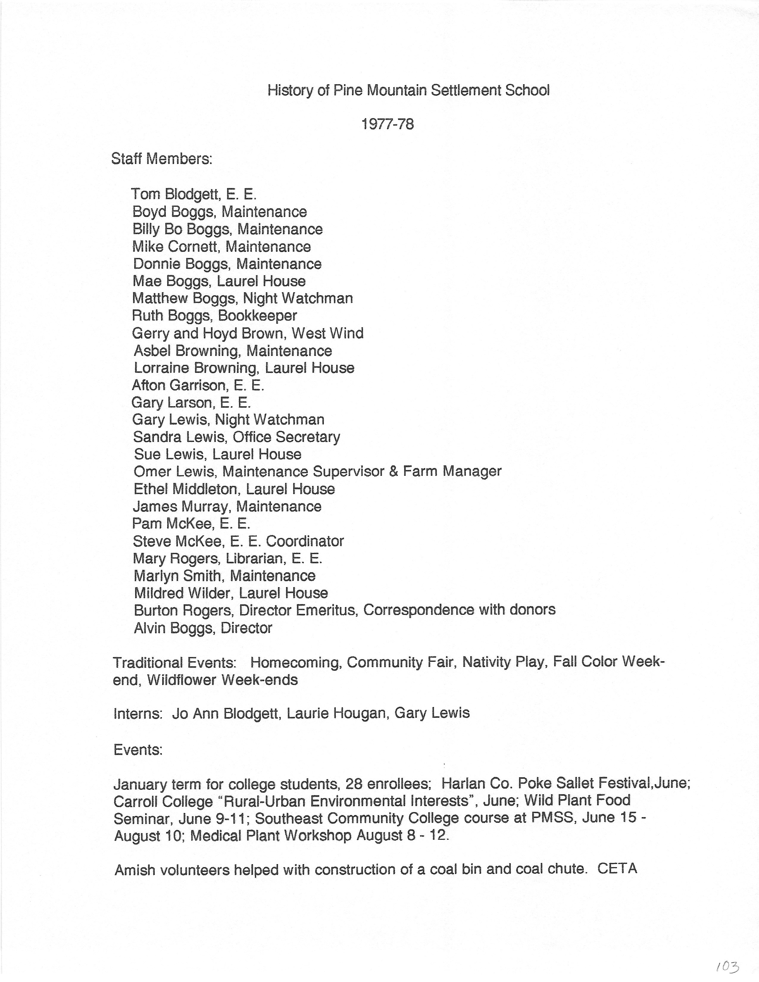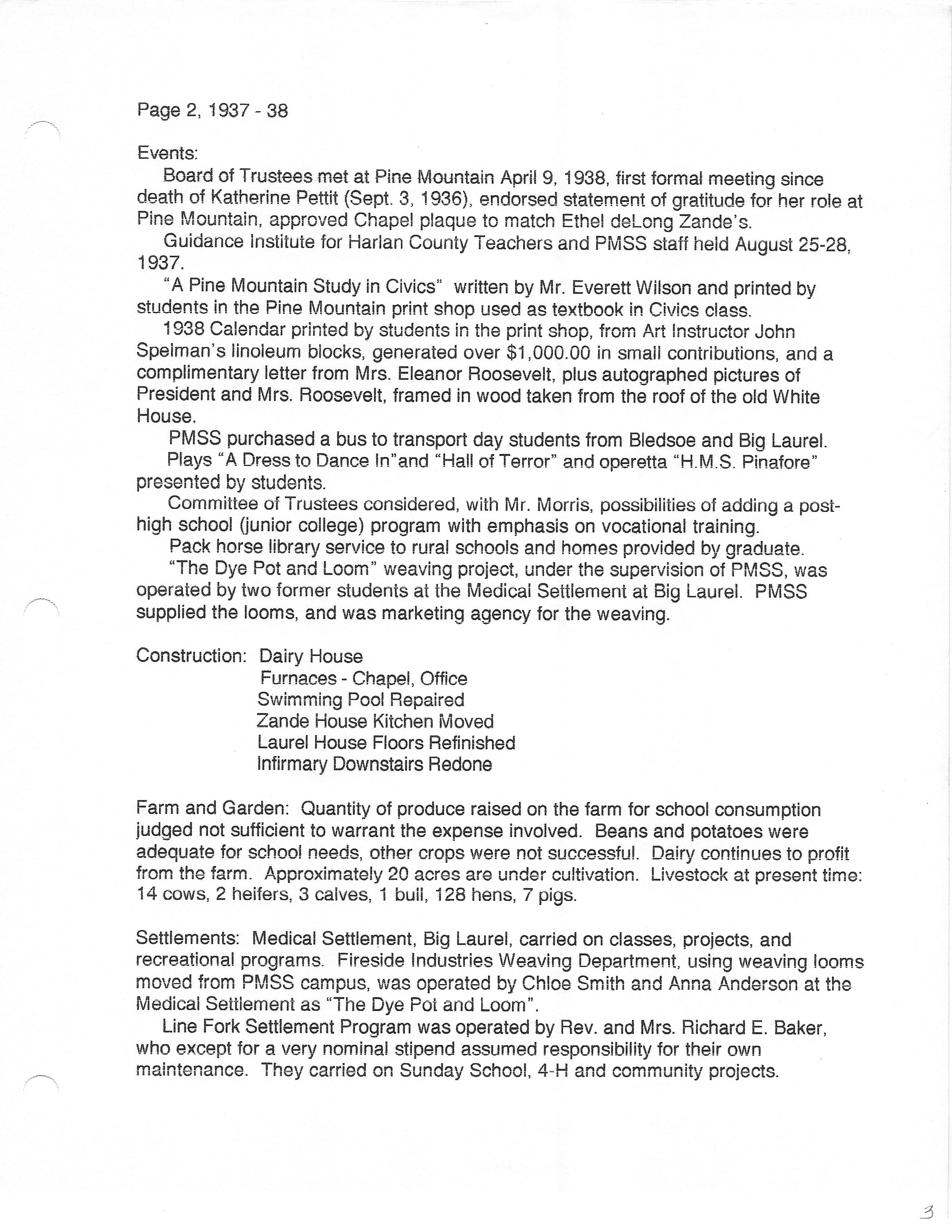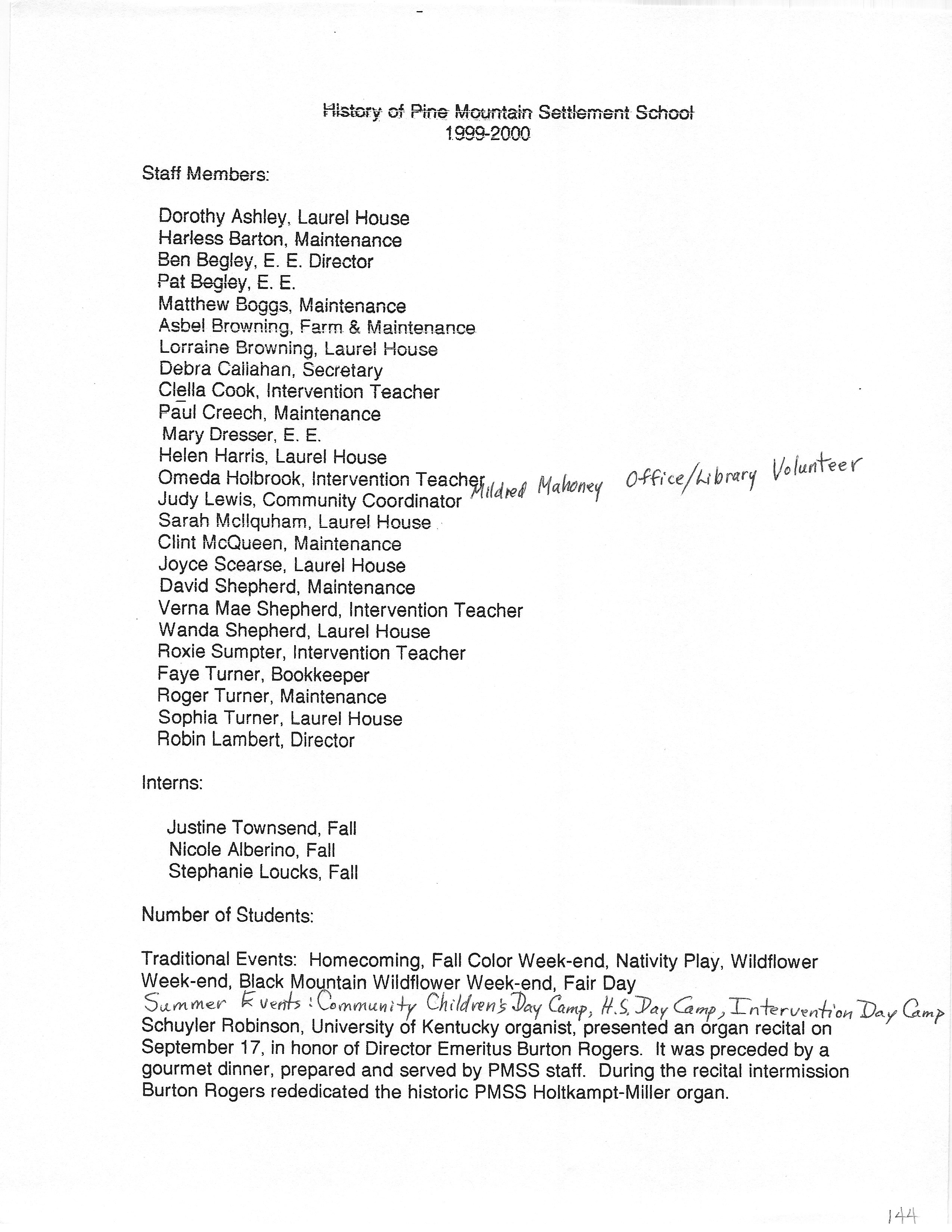 The HISTORY PMSS 1937-2000 GALLERY displays images of the file containing summaries of the employees, activities and visitors at Pine Mountain Settlement School between the years of 1937 until 2000. The author is unknown but it appears to be the work of Mildred Mahoney while she was Interim Director of the School from October 1996 through August 1997.