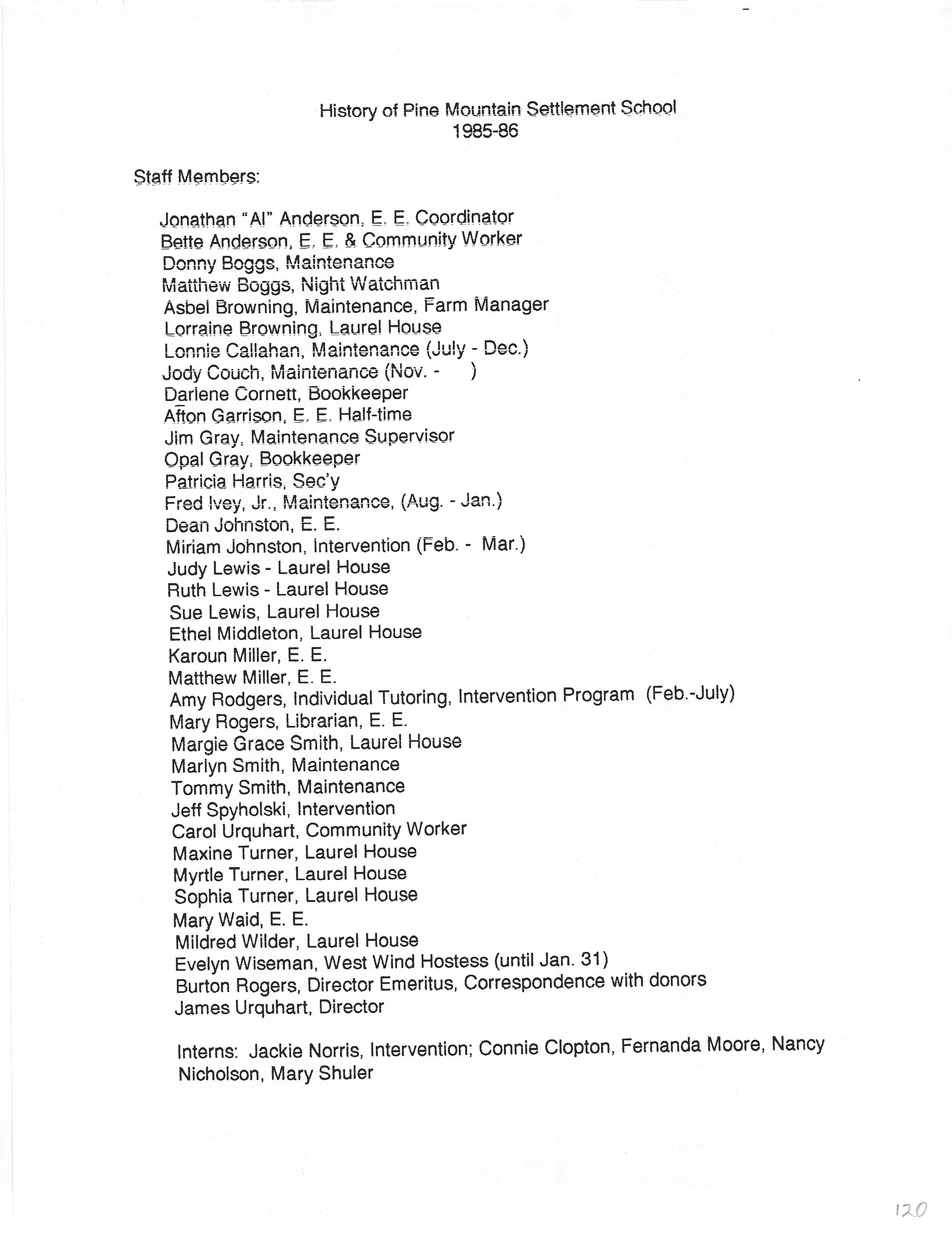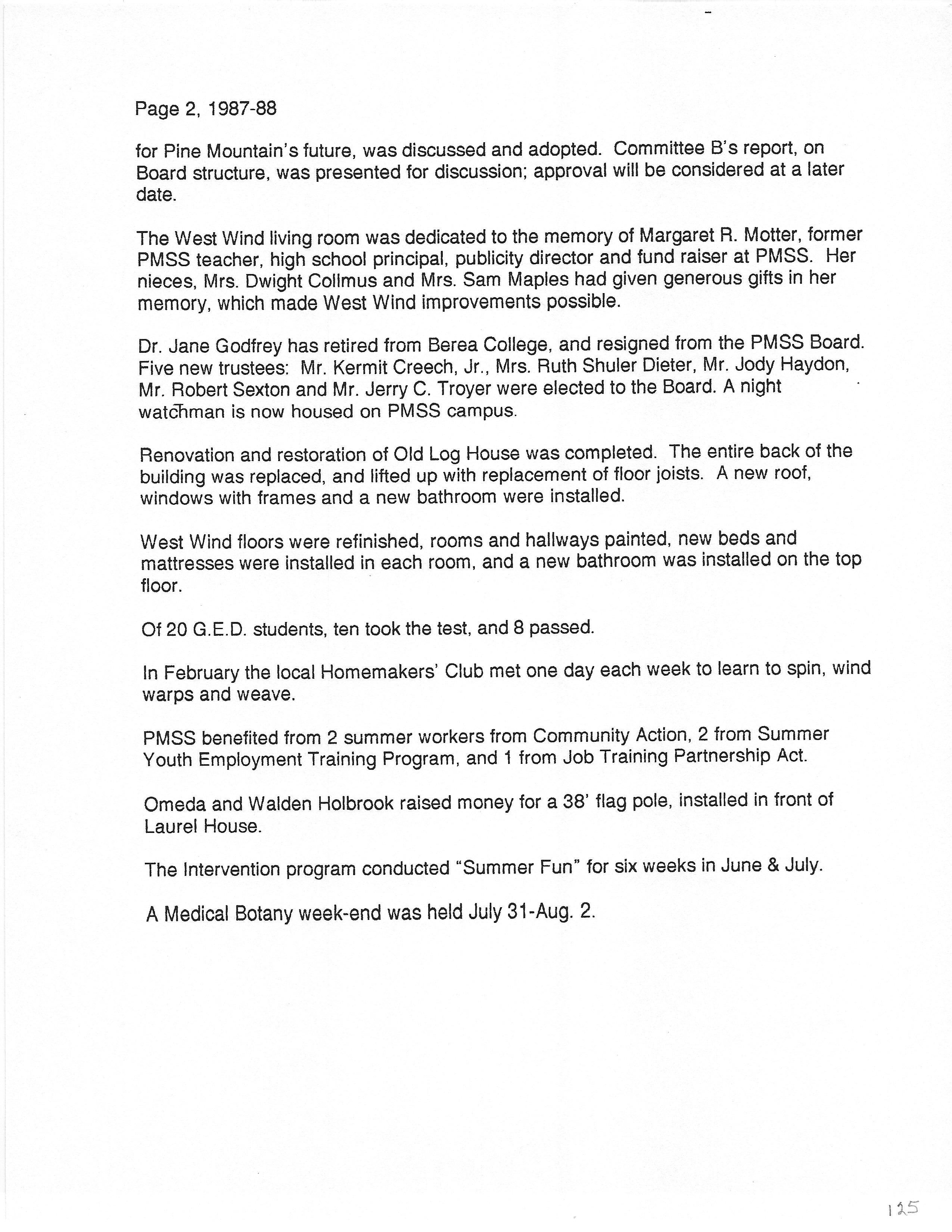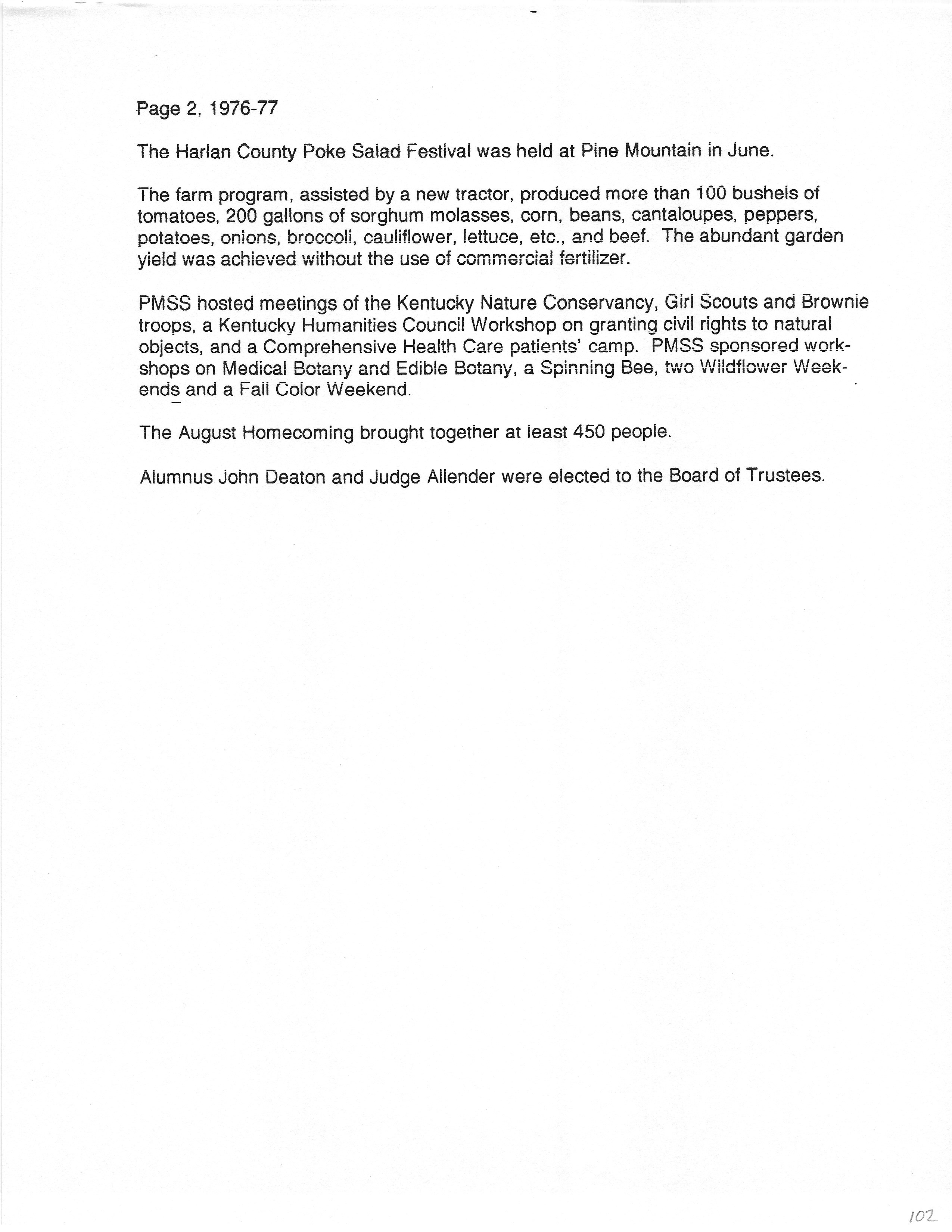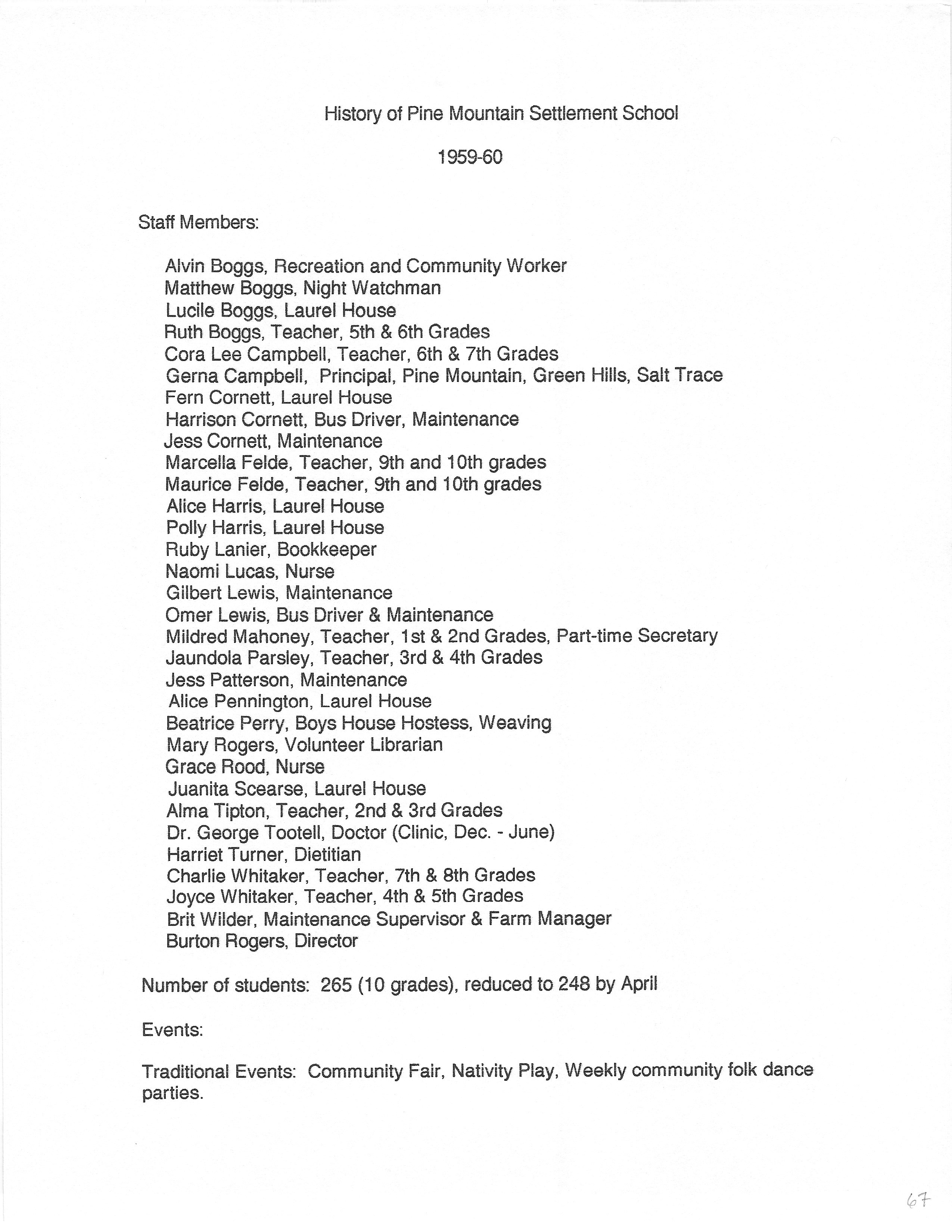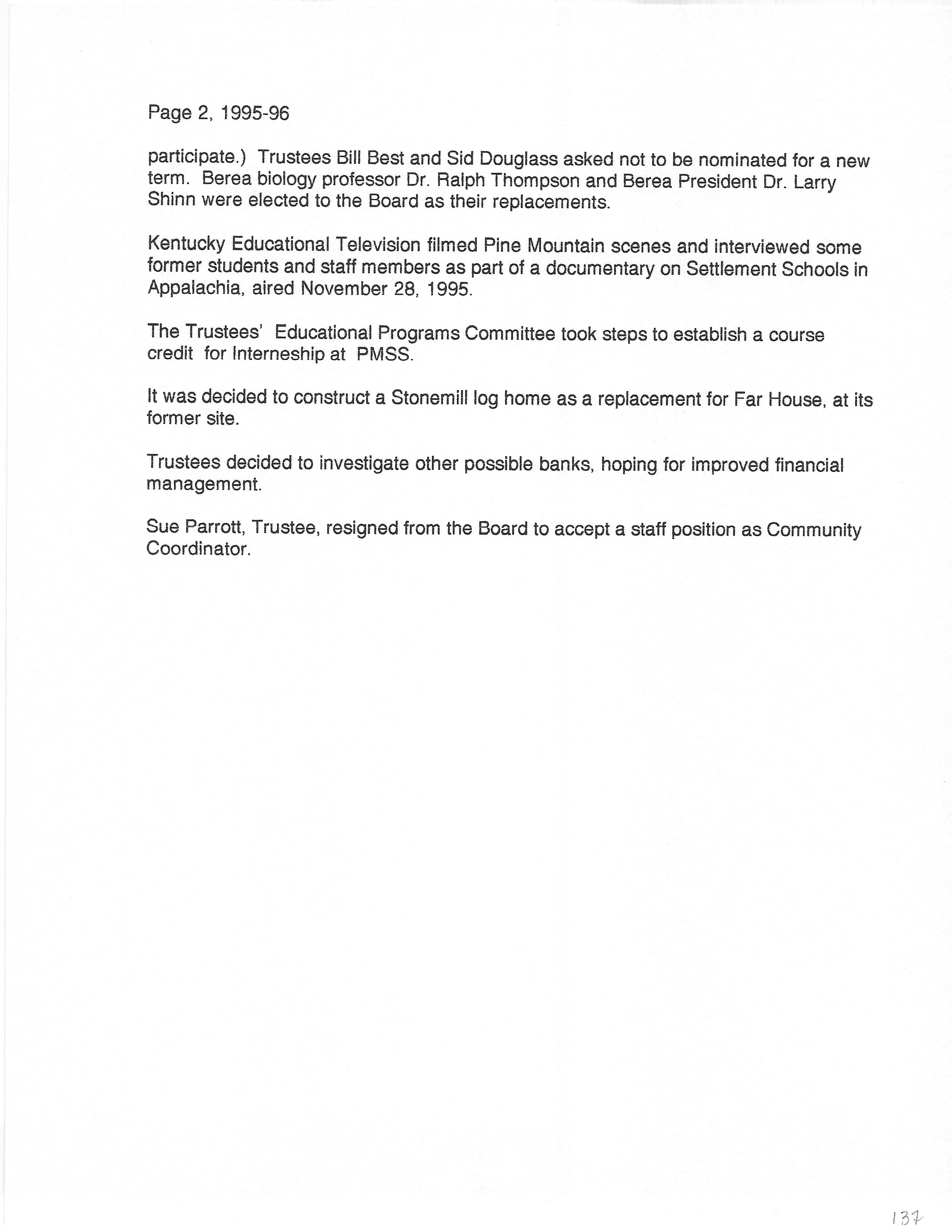 The HISTORY PMSS 1937-2000 GALLERY displays images of the file containing summaries of the employees, activities and visitors at Pine Mountain Settlement School between the years of 1937 until 2000. The author is unknown but it appears to be the work of Mildred Mahoney while she was Interim Director of the School from October 1996 through August 1997.