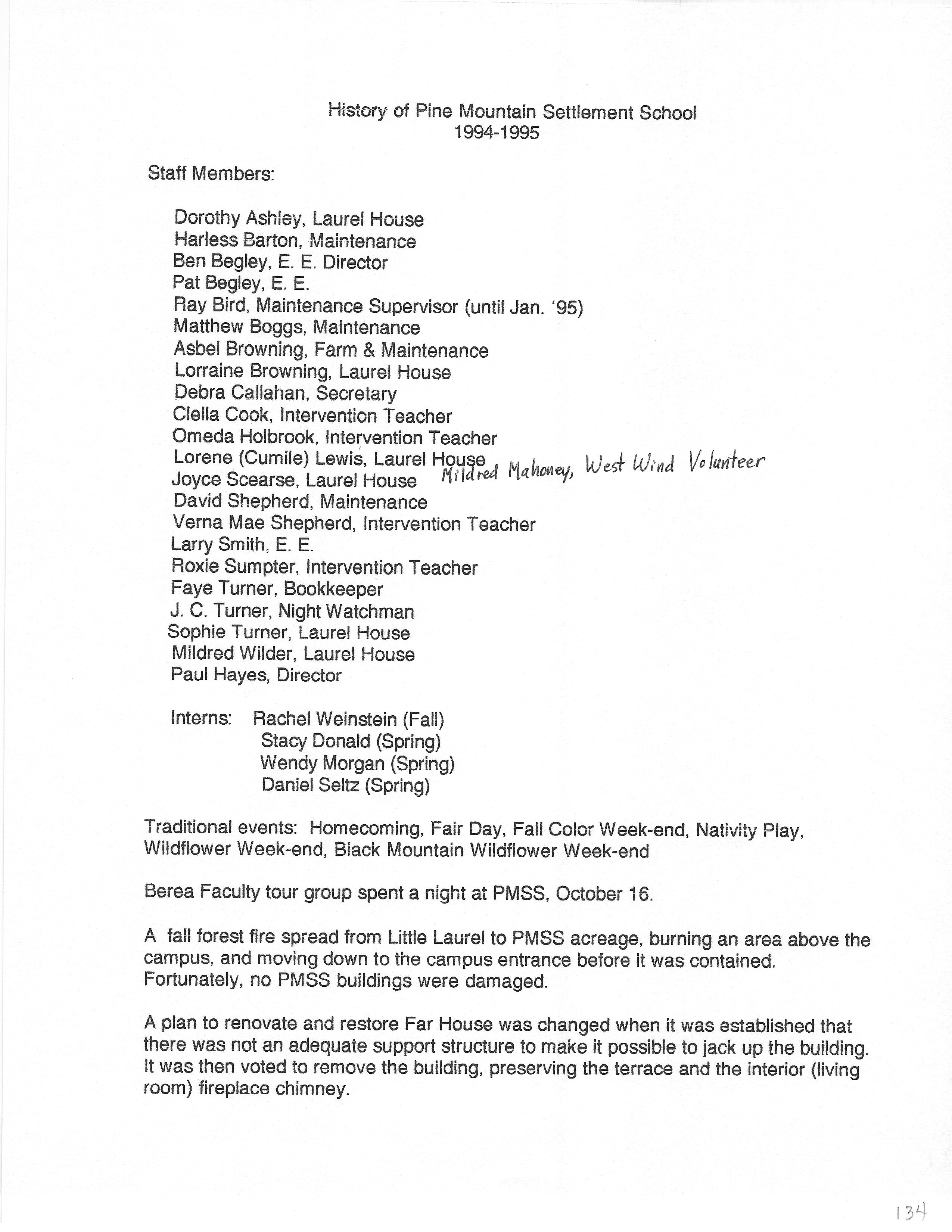 Tags: History PMSS Summary 1994-1995, staff members, interns, traditional events, other events, Berea faculty, forest fires, Far House I