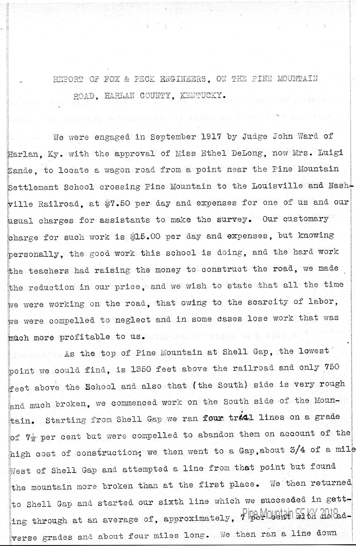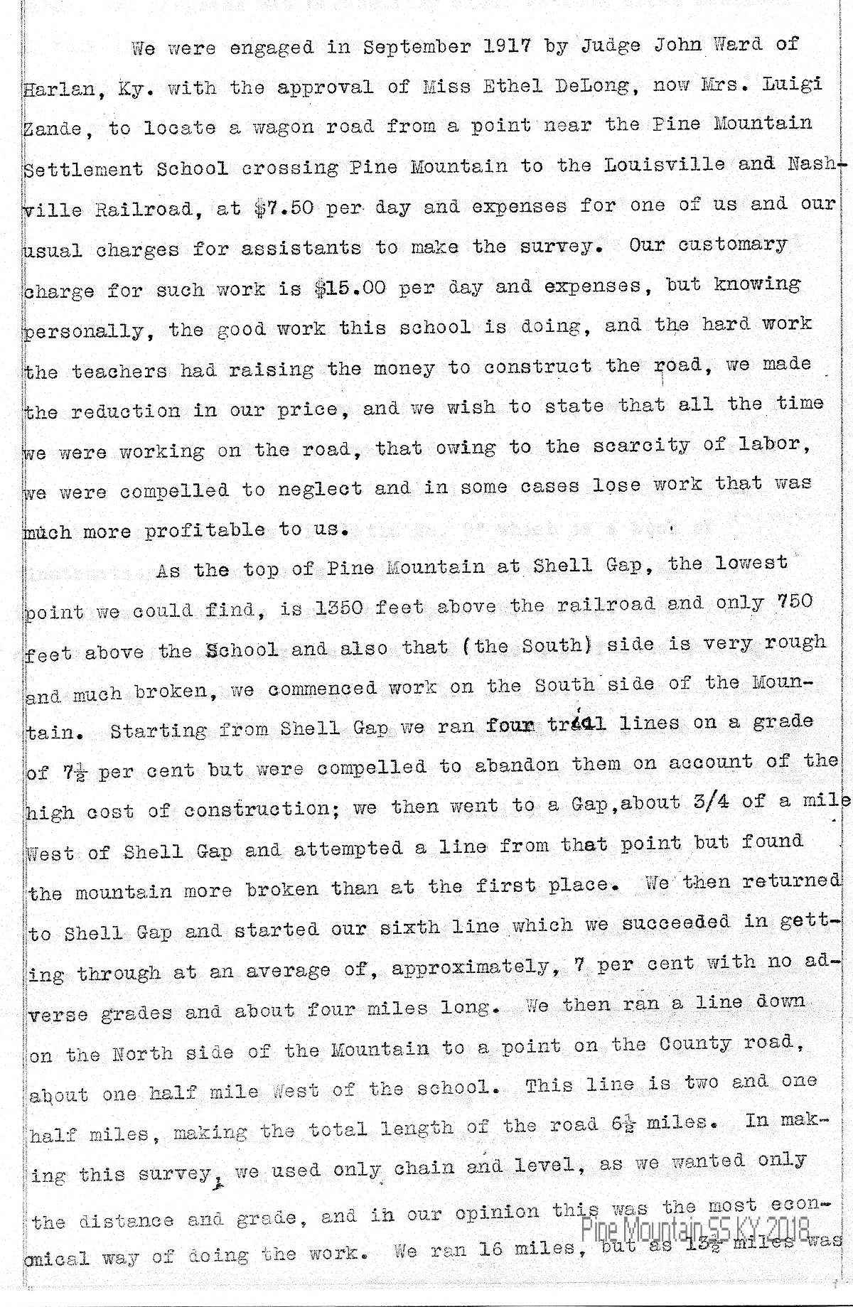We were engaged in September 1917 by Judge John Ward of Harlen, Ky. with the approval of Miss Ethel DeLong, now Mrs. Luigi Zande, to locate a wagon road from a point near the Pine Mountain Settlement School crossing Pine Mountain to the Louisville and Nashville Railroad, at $7.50 per day and expenses for one of us and our usual charges for assistants to make the survey. Our customary charge for such work is $15.00 per day and expenses, but knowing personally, the good work this school is doing, and the hard work the teachers had raising the money to construct the road, we made the reduction in our price, and we wish to state that all the time we were working on the road, that owing to the scarcity of labor, we were compelled to neglect and in some cases lose work that was much more profitable to us.