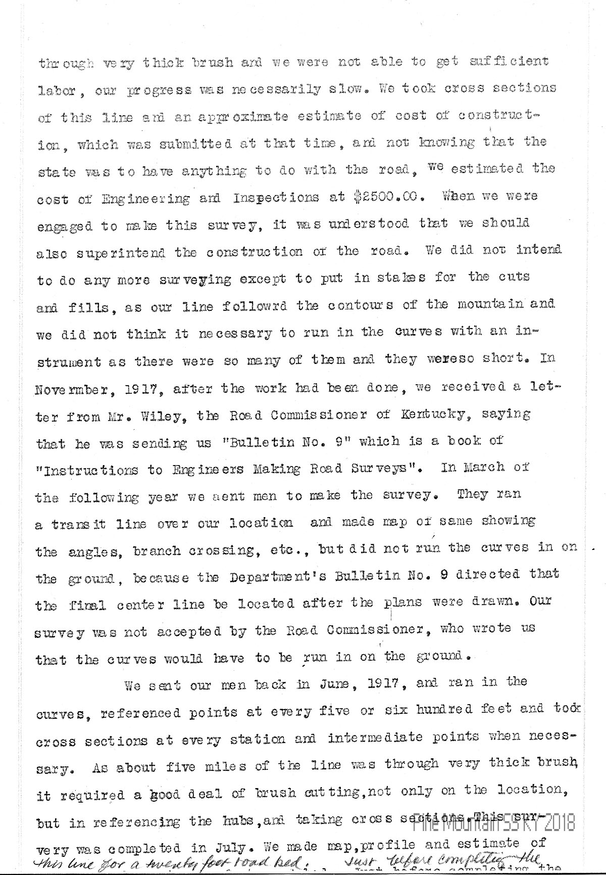 …through very thick bush and we were not able to get sufficient labor, our progress was necessarily slow. We took cross-sections of this line and an approximate estimate of cost of construction, which was submitted at that time, and not knowing that the state was to have anything to do with the road, we estimated the cost of Engineering and Inspections at $2500.00. When we were engaged to make this survey, it was understood that we should also superintend the construction of the road. We did not intend to do any more surveying except to put in stakes for the cuts and fills, as our line followed the contours of the mountain and we did not think it necessary to run in the curves with an instrument as there were so many of them and they were so short. In November, 1917, after the work had been done, we received a letter from Mr. Wiley, the Road Commissioner of Kentucky, saying that he was sending us “Bulletin No. 9” which is a book of “Instructions to Engineers Making Road Surveys”. In March of the following year we sent men to make the survey. They ran a transit line over our location and made map of same showing the angles, branch crossing, etc., but did not run the curves in on the ground, because the Department’s Bulletin No. 9 directed that the final center line be located after the plans were drawn. Our survey was not accepted by the Road Commissioner, who wrote us that the curves would have to be run in on the ground.