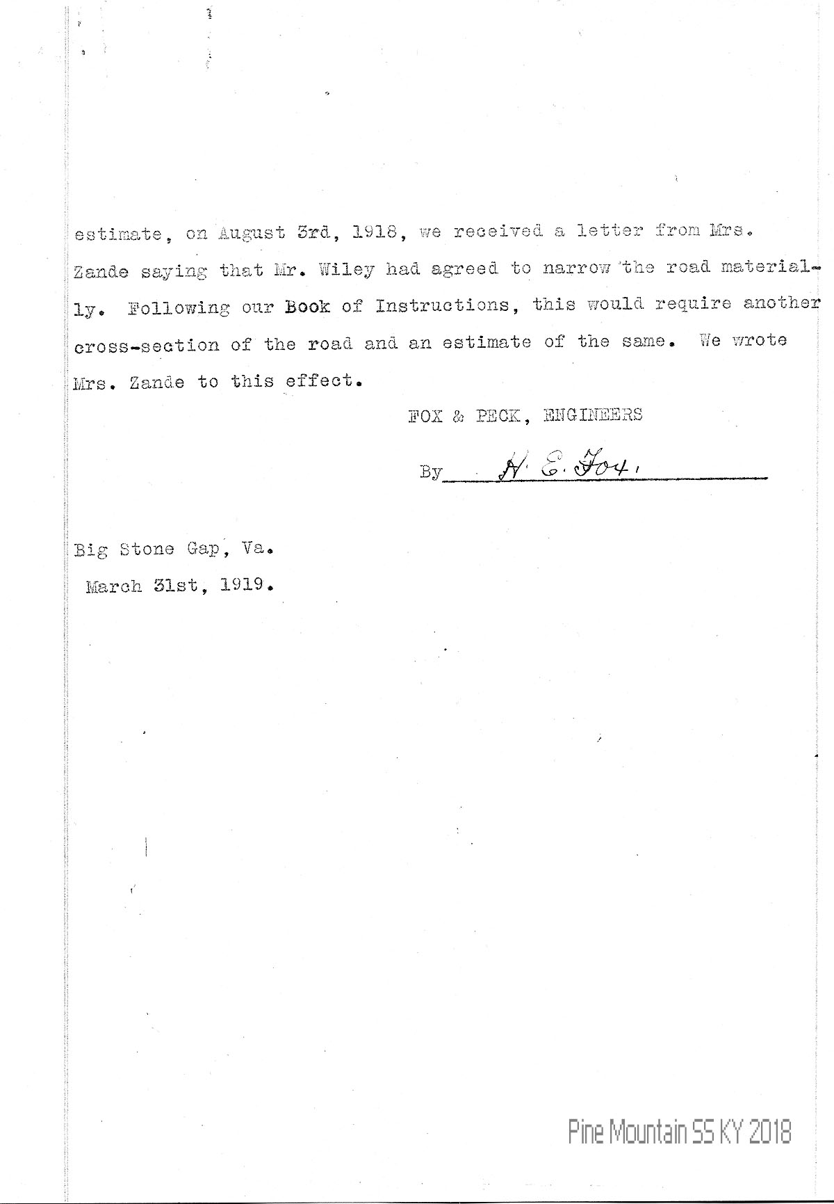 …estimate, on August 3rd, 1918, we received a letter from Mrs. Zande saying that Mr. Wiley had agreed to narrow the road materially. Following our Book of Instructions, this would require another cross-section of the road and an estimate of the same. We wrote Mrs. Zande to this effect.