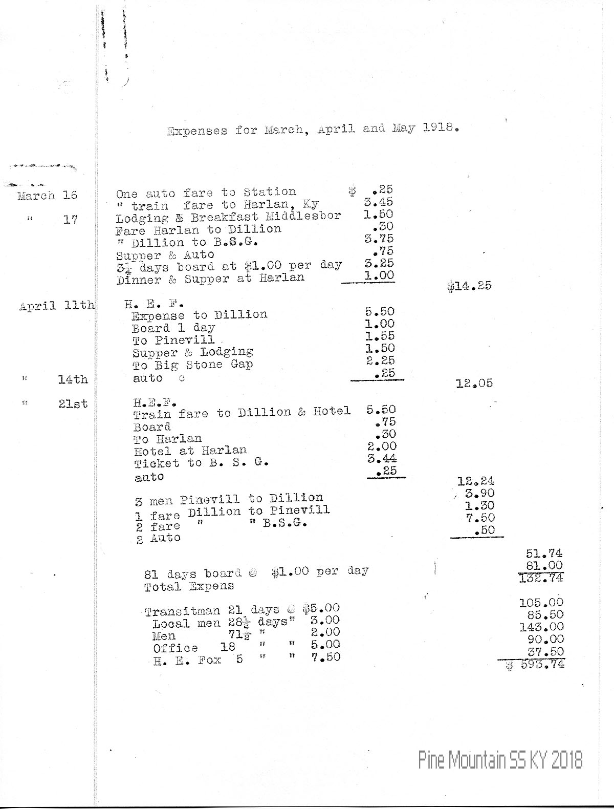 4 auto to station 4 fares to Dillion (sic, Dillon) 2 at Hotel Pineville 1 fare Pineville to Dillion 1 fare Dillion to Pineville H.E. Fox Dillion to B.S.G. Supper & auto Fox & two men Auto Station 3 fares to Dillion Hotel Pineville 1 fare Dillion to BGS Supper & auto H.E. Fox fare to Harlan Hotel Self & 3 men to Dillion 3 fares to Harlan 4 fares to B.S.G. 4 suppers 4 autos |