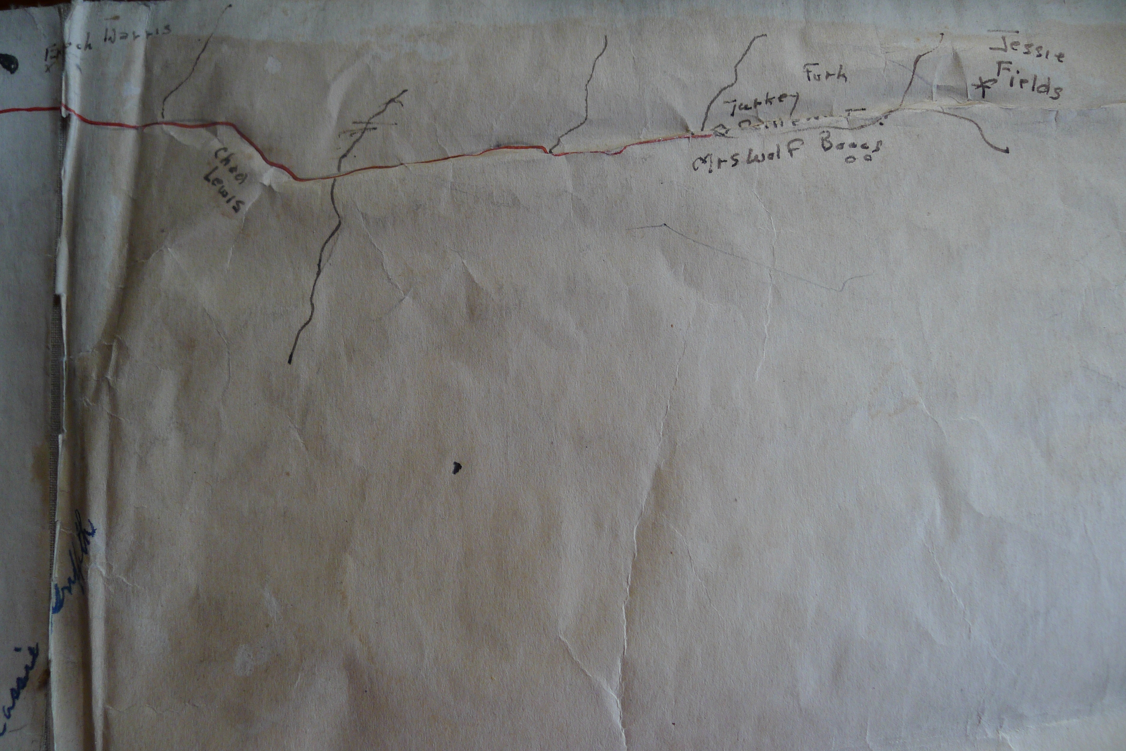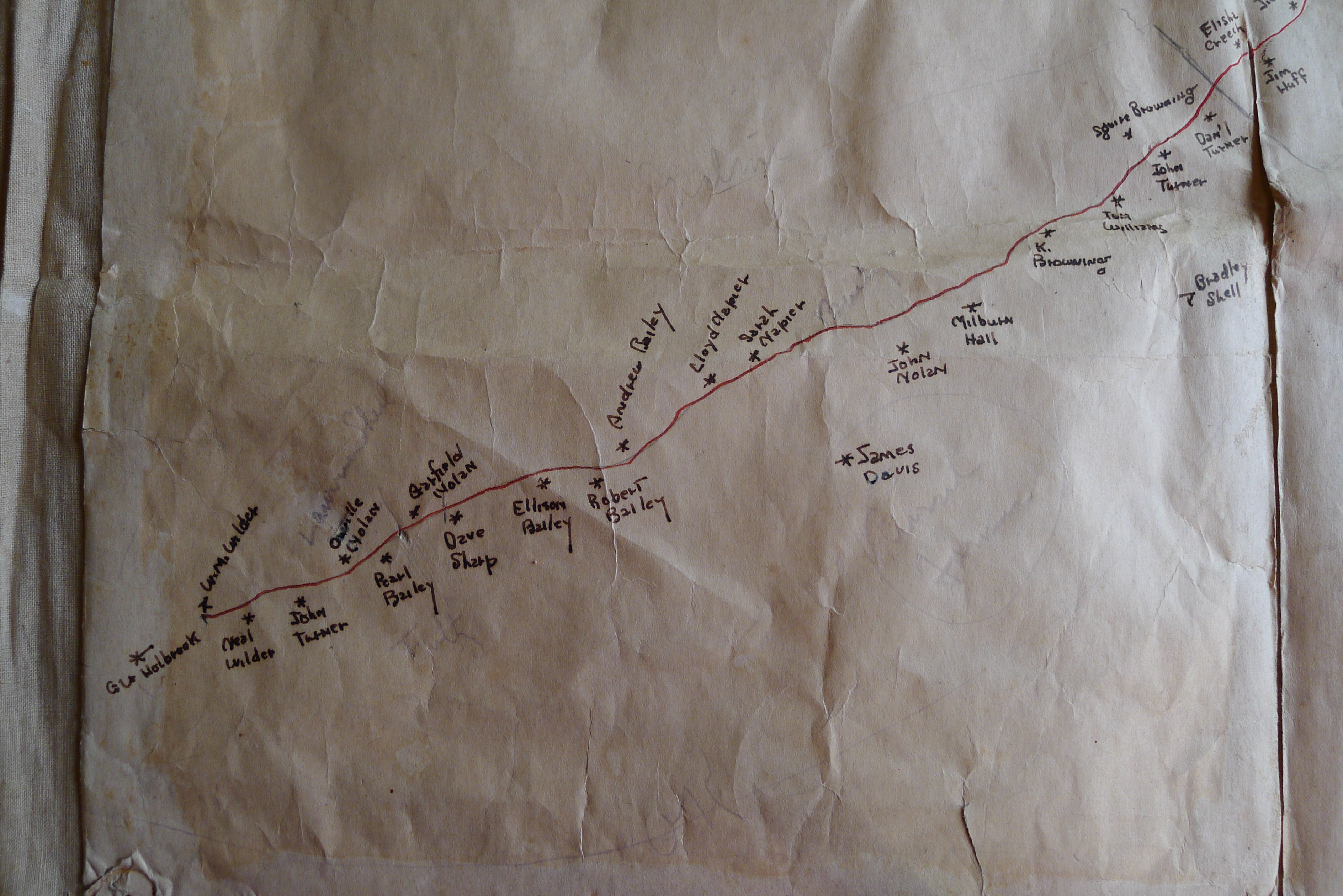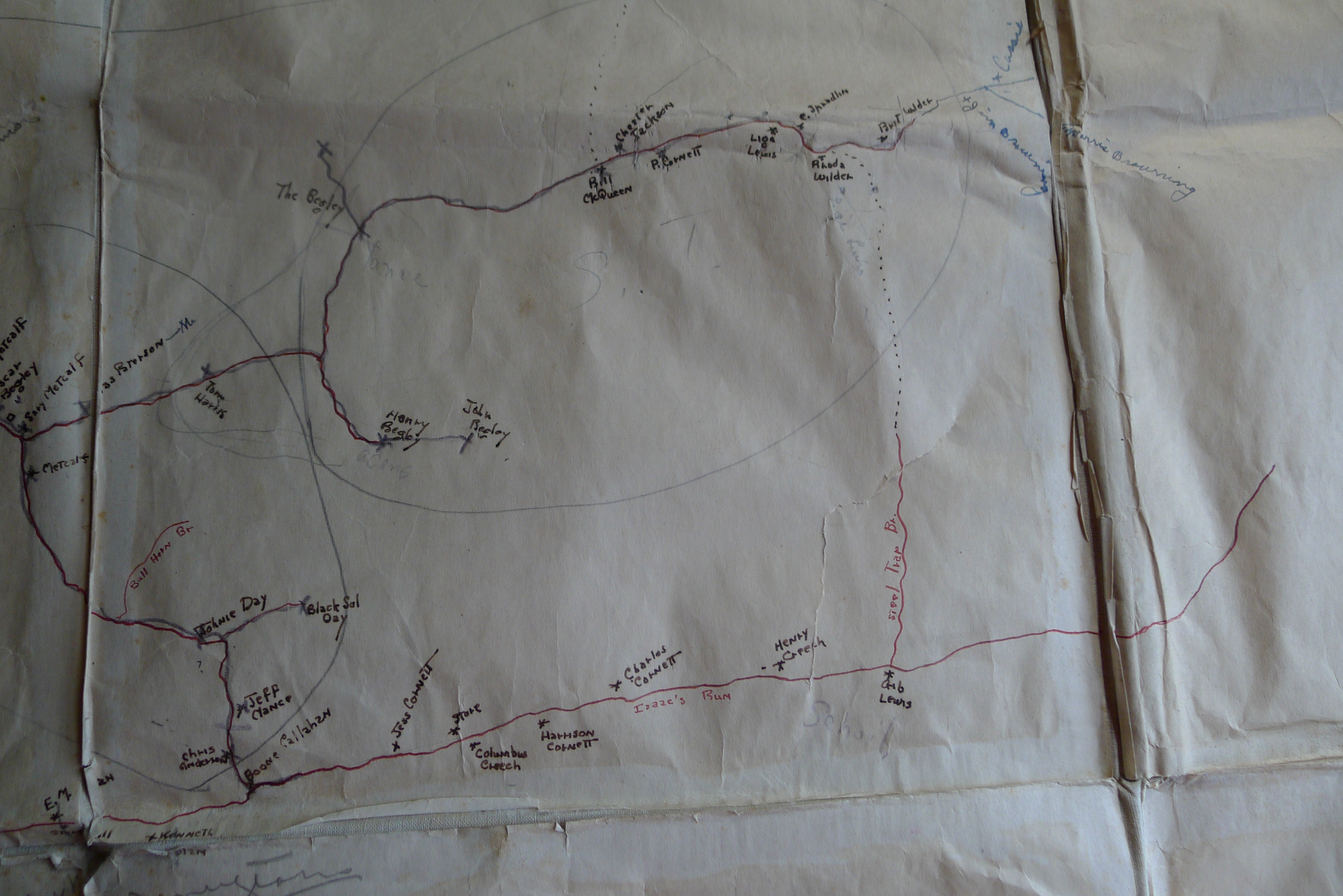 Accompanying the cards was a hand drawn map on oilcloth of the same area showing where each family lived along the various creeks.