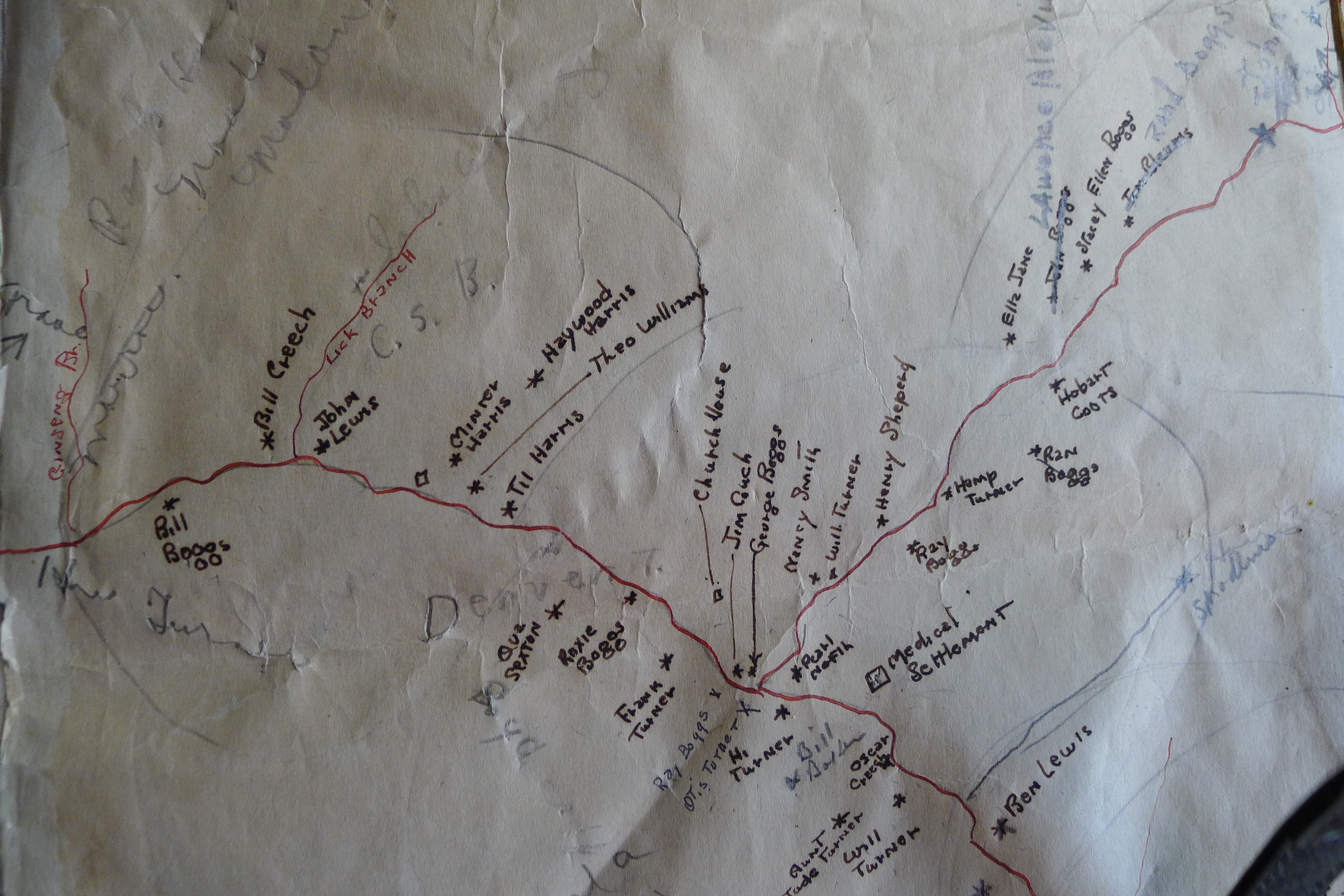 - Community Map of Pine Mountain valley – partial view of larger map showing families surrounding the Big Laurel Medical Settlement on Greasy Creek. Includes Lick Branch ad Ginseng Branch. [P1050595.jpg]