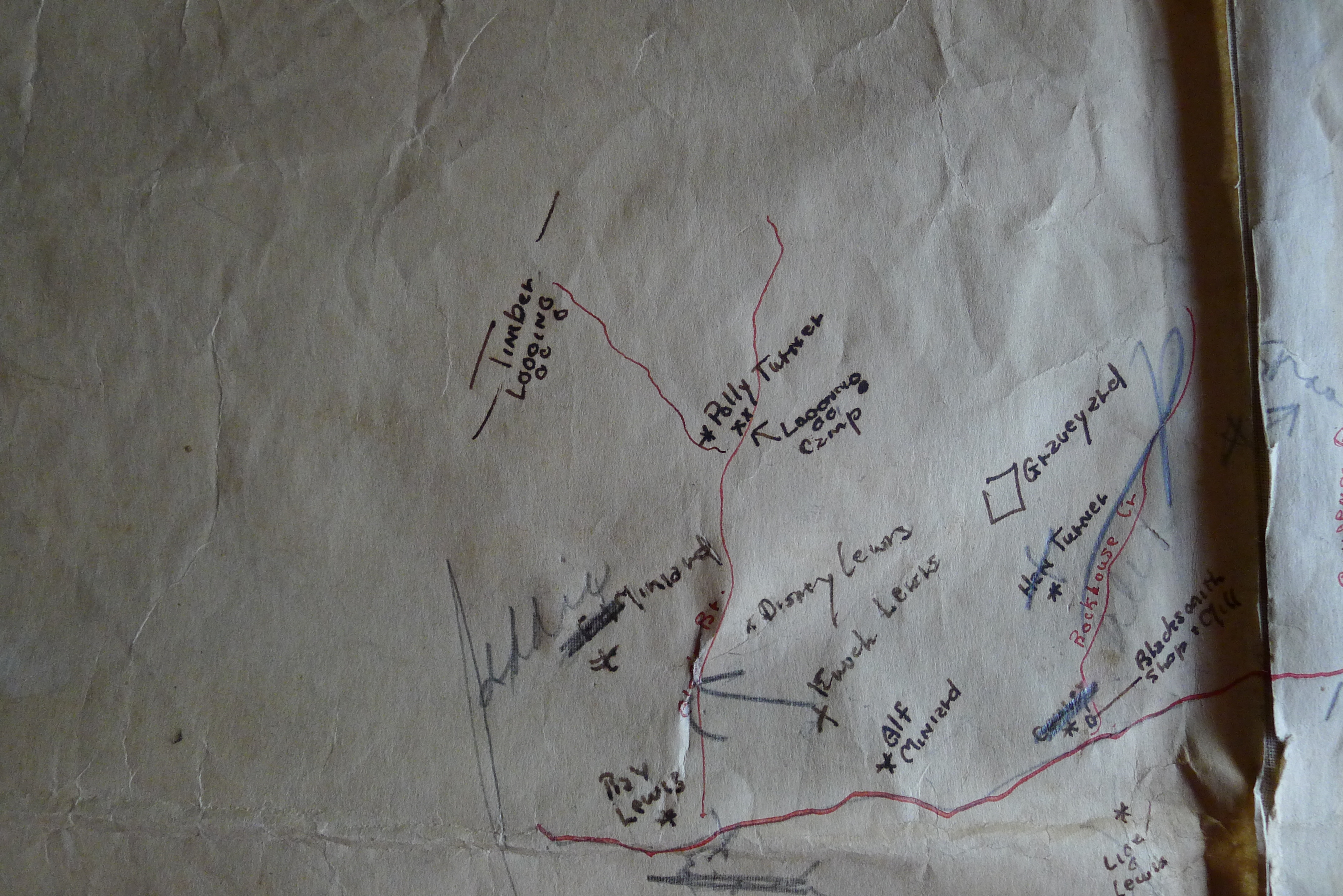 - Community Map of Pine Mountain Valley. Partial view of larger map with logging camp near Polly Turner’s and Rockhouse Creek, 1934-1942. [P1050596.jpg]