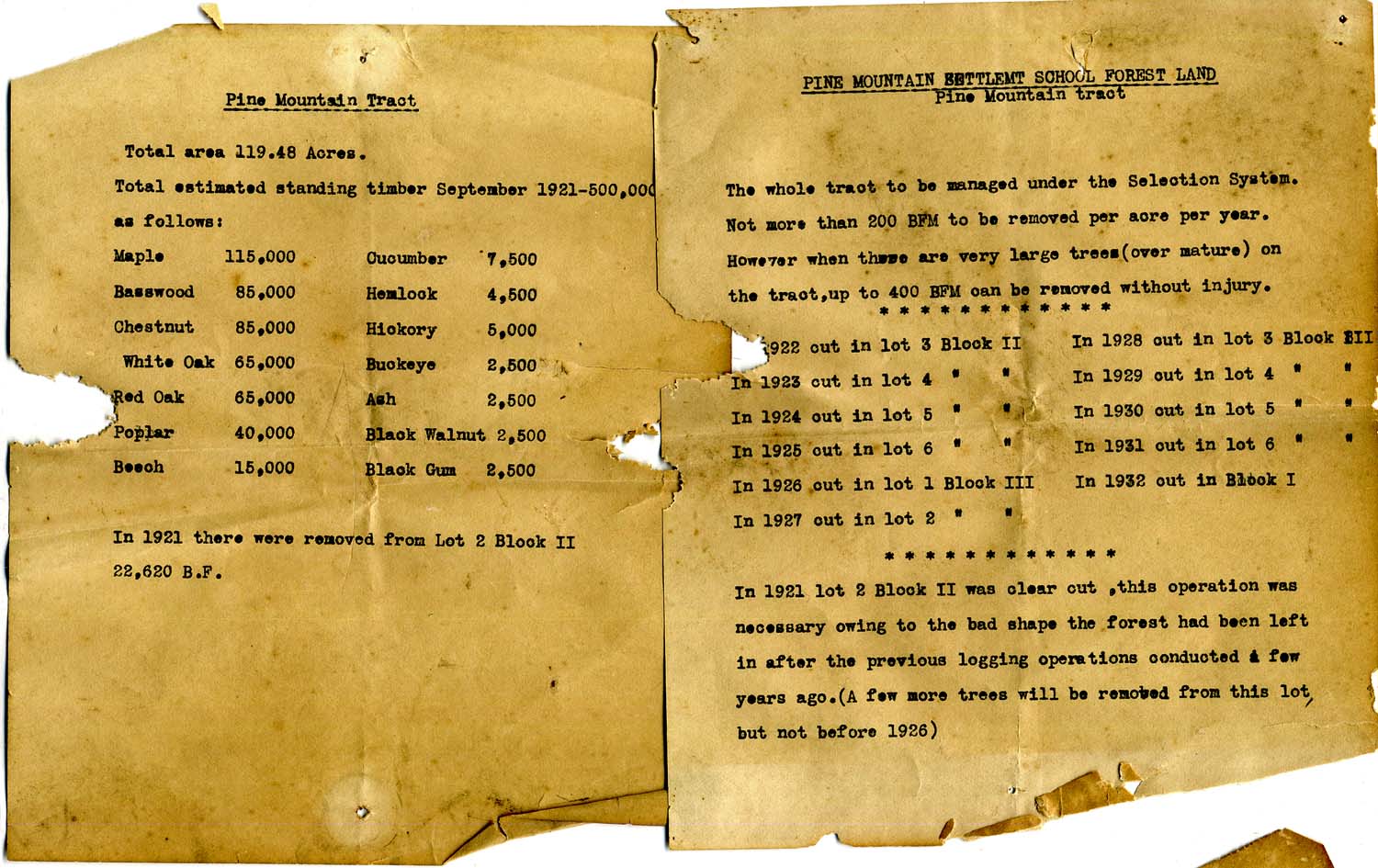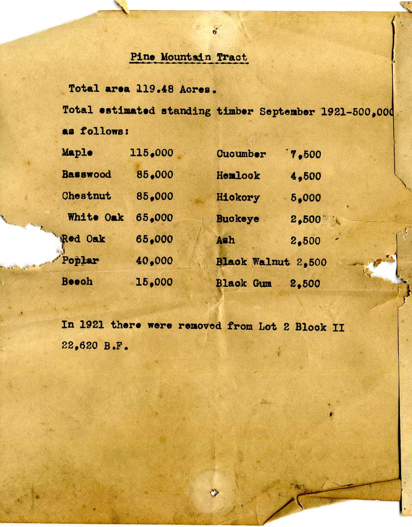 In 1921 there were removed from Lot 2 Block II 22,620 B.F. [Board Feet]