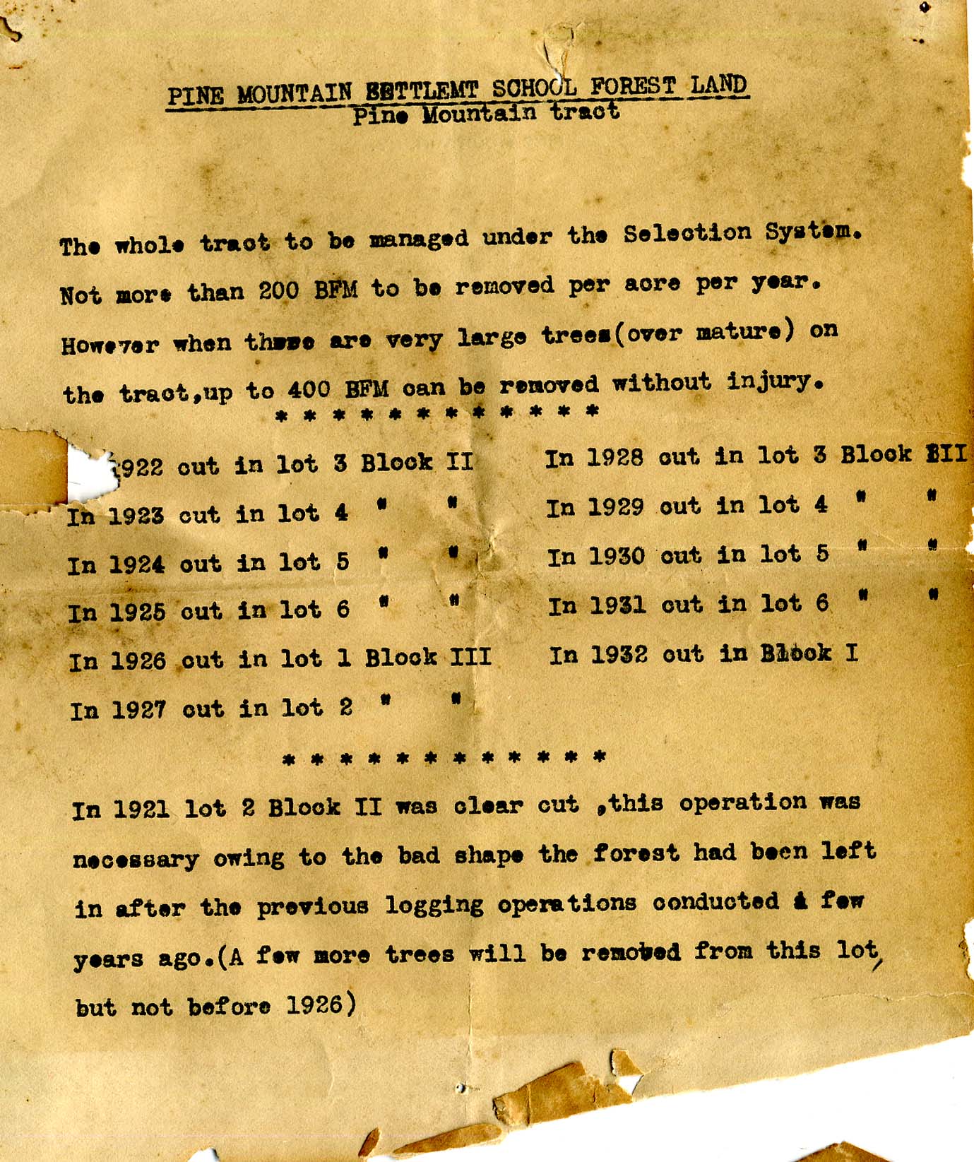 The whole tract to be managed under the Selection System. Not more than 200 BFM to be removed per acre per year. However, when there are very large trees (over mature) on the tract, up to 400 BFM can be removed without injury.