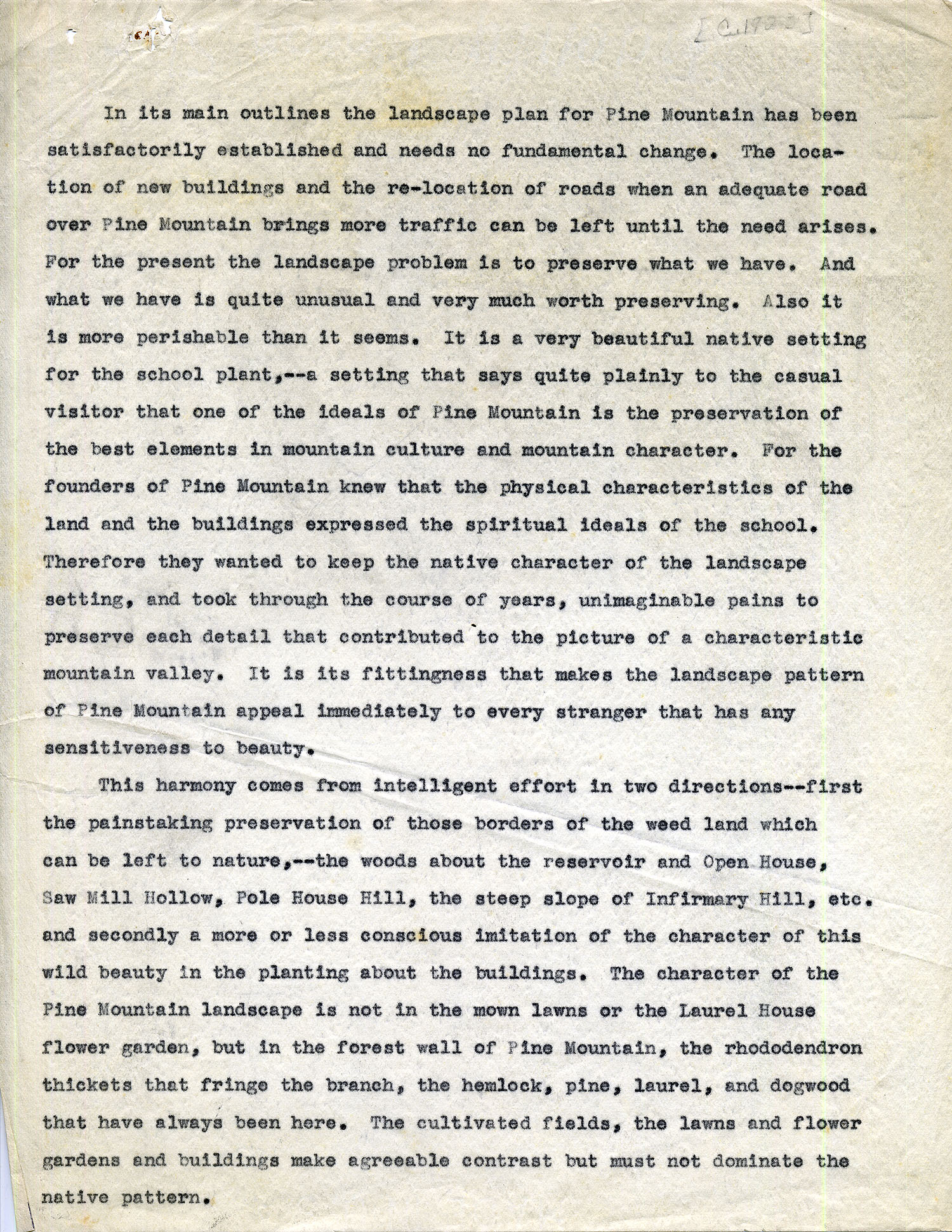 In its main outlines the landscape plan for Pine Mountain has been satisfactorily established and needs no fundamental change. The location of new buildings and the re-location of roads, when an adequate road over Pine Mountain brings more traffic, can be left until the need arises. For the present the landscape problem is to preserve what we have. And what we have is quite unusual and very much worth preserving, Also it is more perishable than It seems. It is a very beautiful native setting for the school plant — a setting that says quite plainly to the casual visitor that one of the Ideals of Pine Mountain is the preservation of the best elements in mountain culture and mountain character. For the founders of Pine Mountain knew that the physical characteristics of the land and the buildings expressed the spiritual ideals of the school. Therefore they wanted to keep the native character of the landscape setting and took, through the course of years, unimaginable pains to preserve each detail that contributed to the picture of a characteristic mountain valley. It is its fittingness that makes the landscape pattern of Pine Mountain appeal immediately to every stranger that has any sensitiveness to beauty.