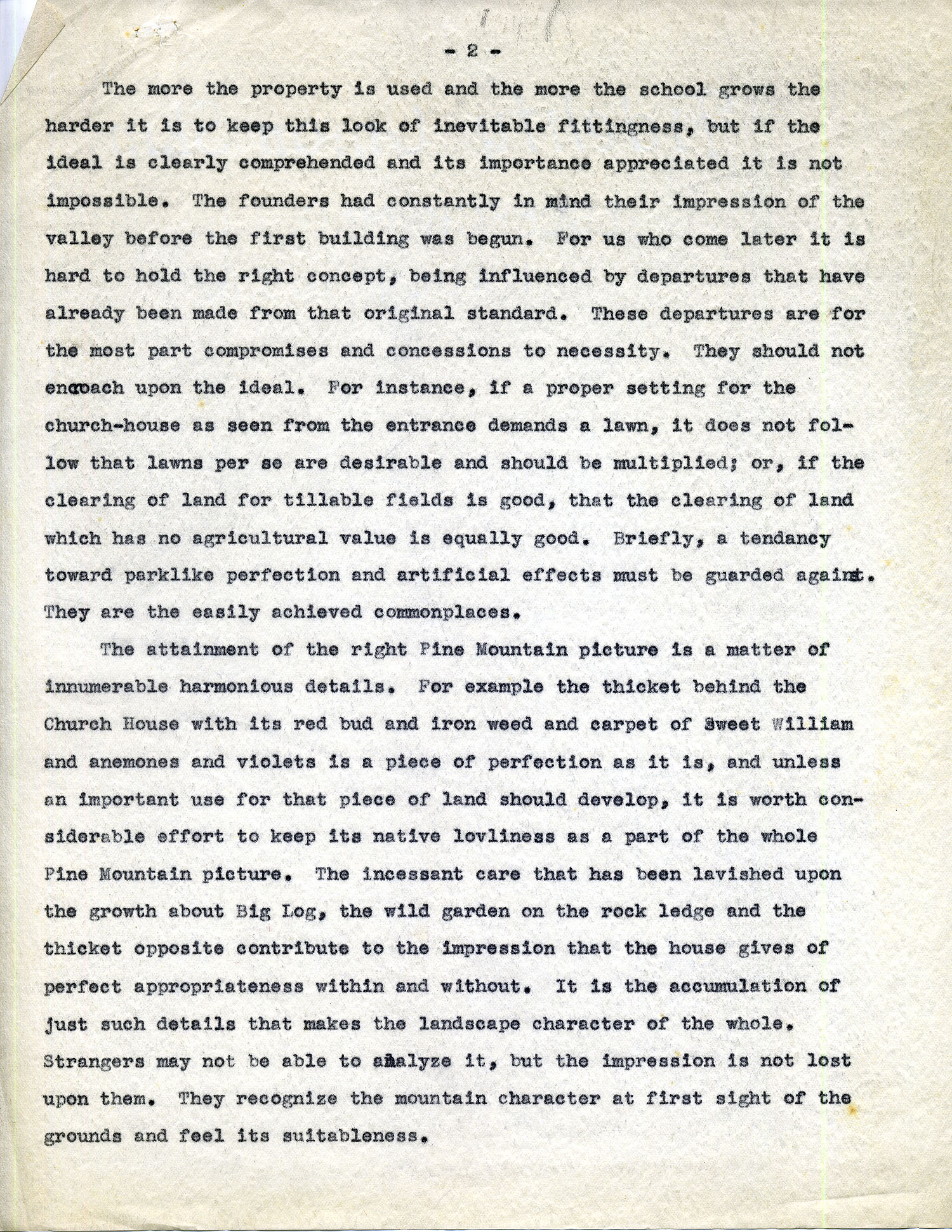 Landscape plan for Pine Mountain – landscape plan needs no fundamental change; must preserve what we have to reflect spiritual ideals of the school; must keep a natural setting; preserve weed land borders ; reflect wild beauty in foundation plantings ; cultivation must not dominate the native pattern; must follow founders’ ideals where possible; avoid artificial effects ; maintain harmony in the details ; [pages 1-3]