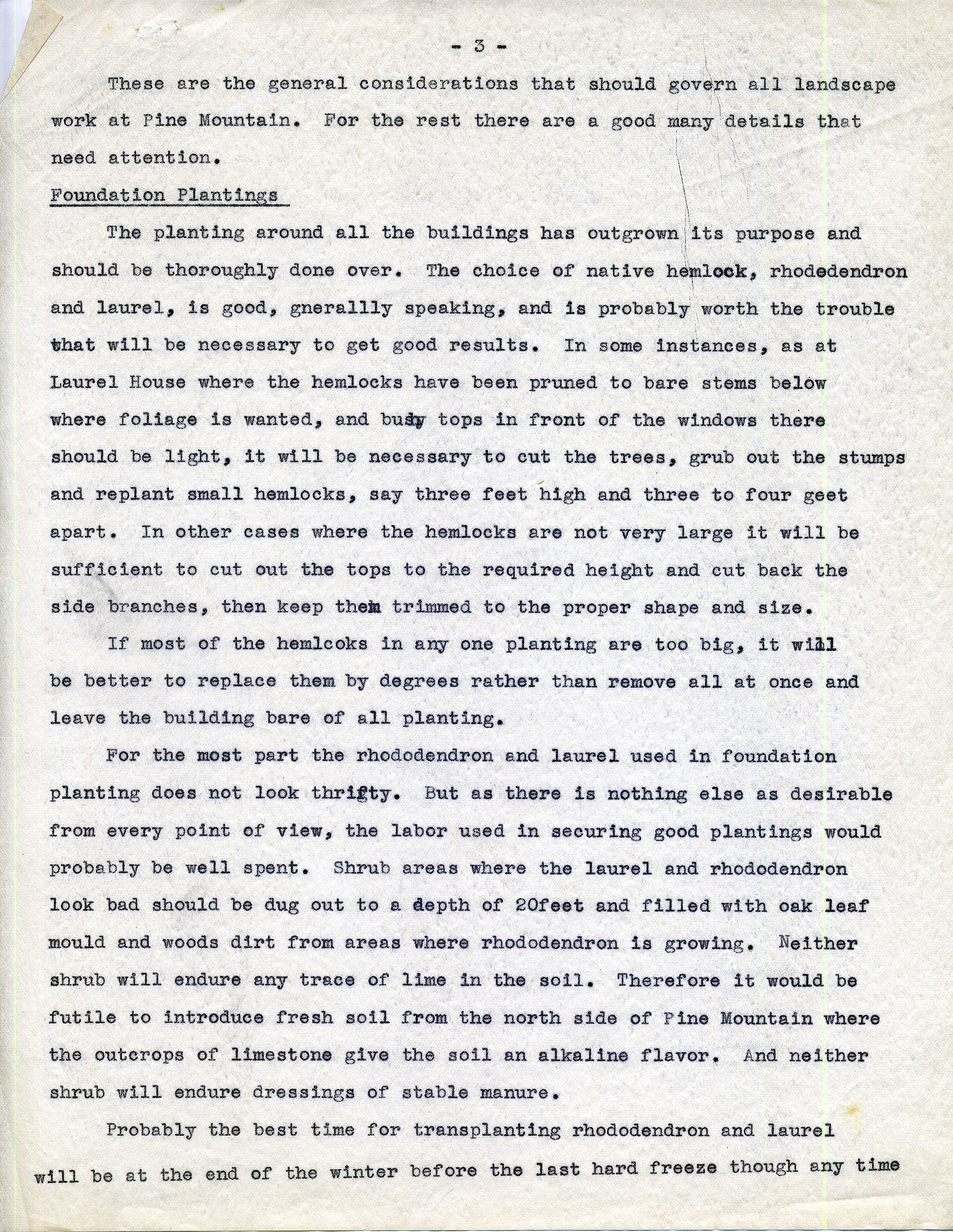 For the most part the rhododendron and laurel used in foundation planting does not look thrifty. But as there is nothing else as desirable from every point of view, the labor used In securing good plantings would probably be well spent. Shrub areas where the laurel and rhododendron look bad should be dug out to a depth of 20 feet and filled with oak leaf mould [sic] and woods dirt from areas where rhododendron is growing. Neither shrub will endure any trace of lime in the soil. Therefore it would be futile to introduce fresh soil from the north side of Pine Mountain where the outcrops of limestone give the soil an alkaline flavor. And neither shrub will endure dressings of stable manure.