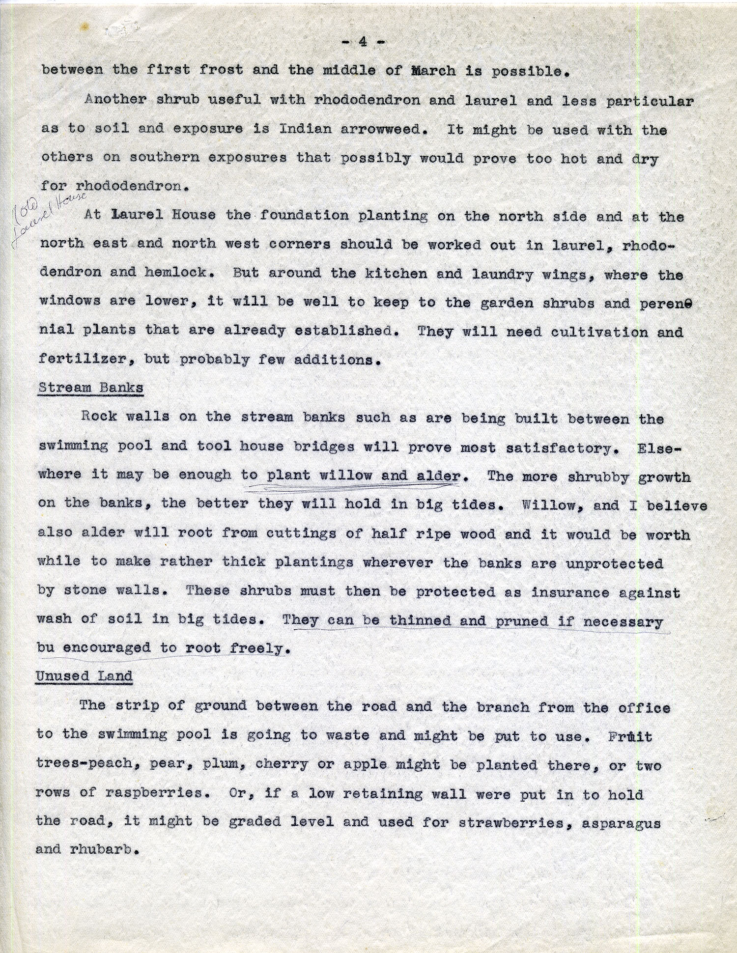 The thinning done last year on the steep slope of Infirmary Hill was a mistake. That slope, which is too steep for agricultural use, should be kept solid wild growth and the rhododendron, and pine and laurel that are there should be encouraged and added to, rather than removed. It could be made a particularly beautiful bit,—a sort of museum to preserve the loveliness that once was all through the valley and up and down Greasy,—much as Aunt Sal’s house preserves the old time pattern of indoor life. Mrs. [Lexine] Baird’s plantings last spring along the path to the Infirmary were an excellent start In this direction. Galax and arbutus, which will not grow in most parts of the grounds do well here and should be cultivated. And especially laurel and rhododendron should be planted along the path and wherever the growth looks at all thin.