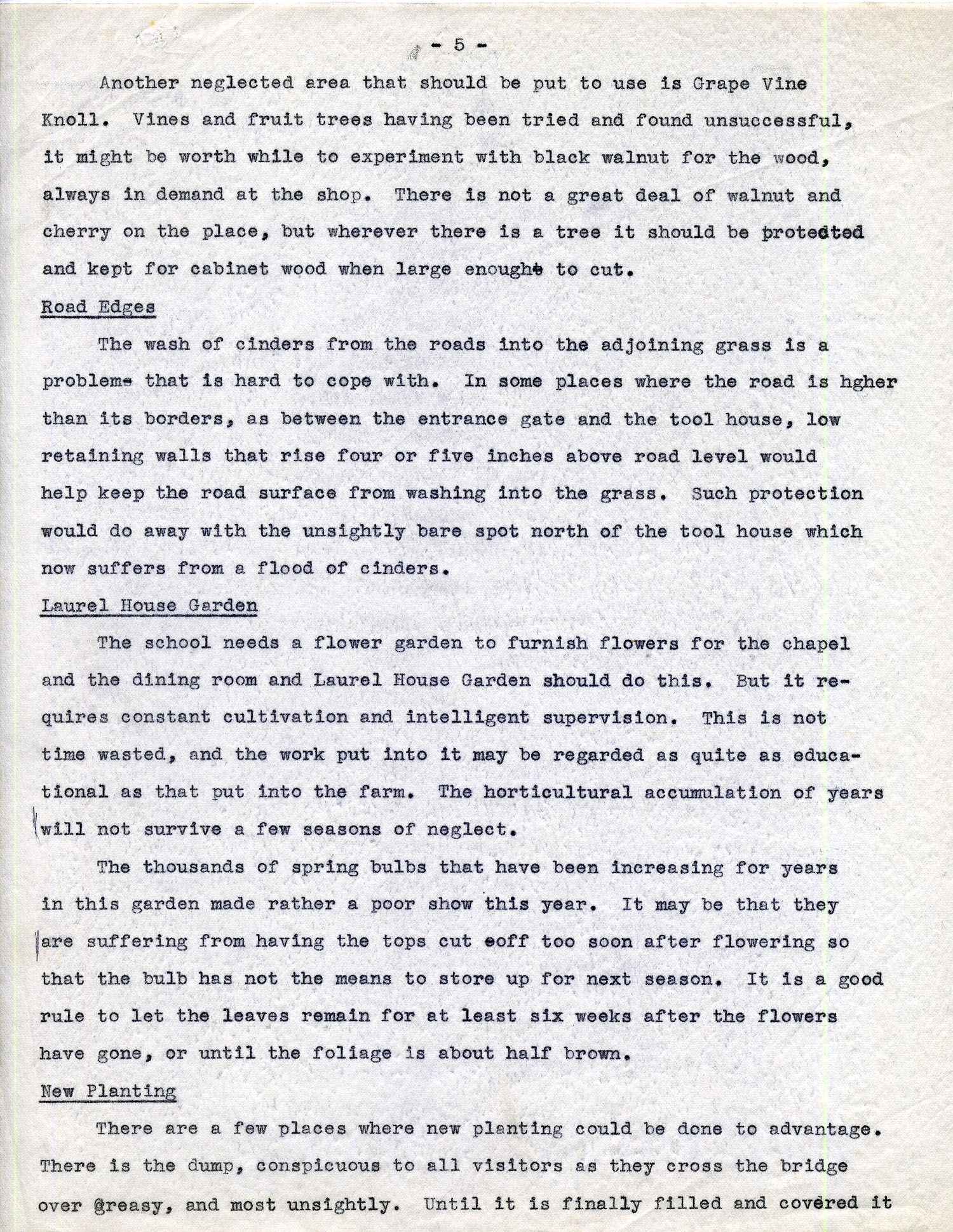 New Planting – need to mask the dump; nuisance of honeysuckle; preservation of grass; chapel plantings; Infirmary Hill should not be thinned; cultivate natural flower gardens; develop Snake Path; a possibility of outdoor theatre ; [pages 5-6]