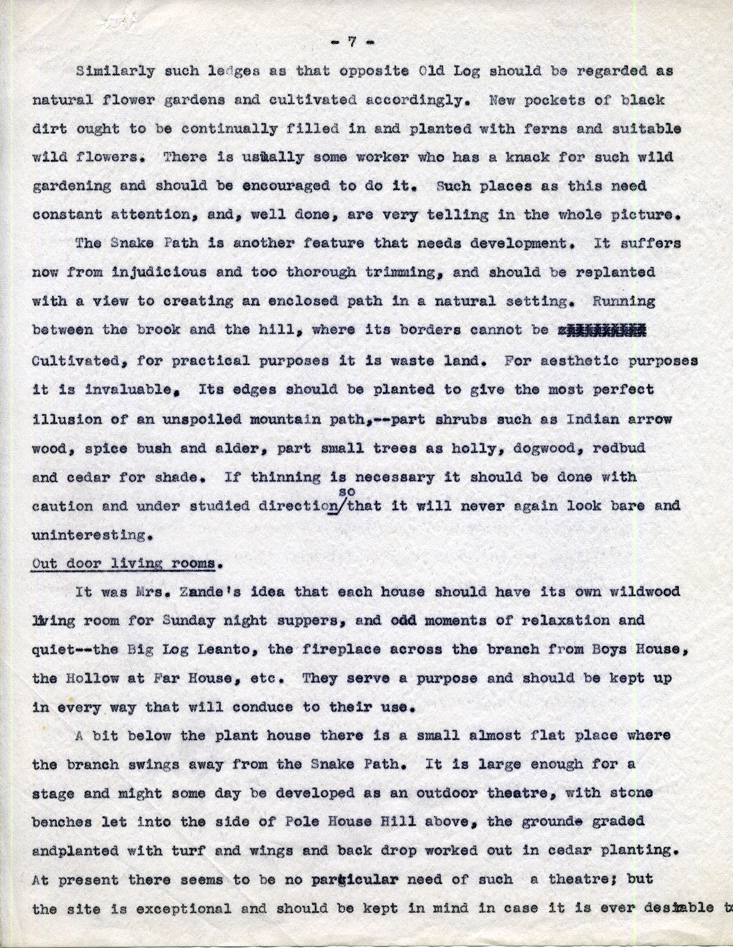 A bit below the plant house [Electrical Power House] there is a small almost flat place where the branch swings away from the Snake Path. It is large enough for a stage and might some day be developed as an outdoor theatre, with stone benches set into the side of Pole House Hill above, the ground graded and planted with turf and wings and back drop worked out in cedar planting. At present there seems to be no particular need of such a theatre but the site is exceptional and should be kept In mind in case it is ever desirable to…