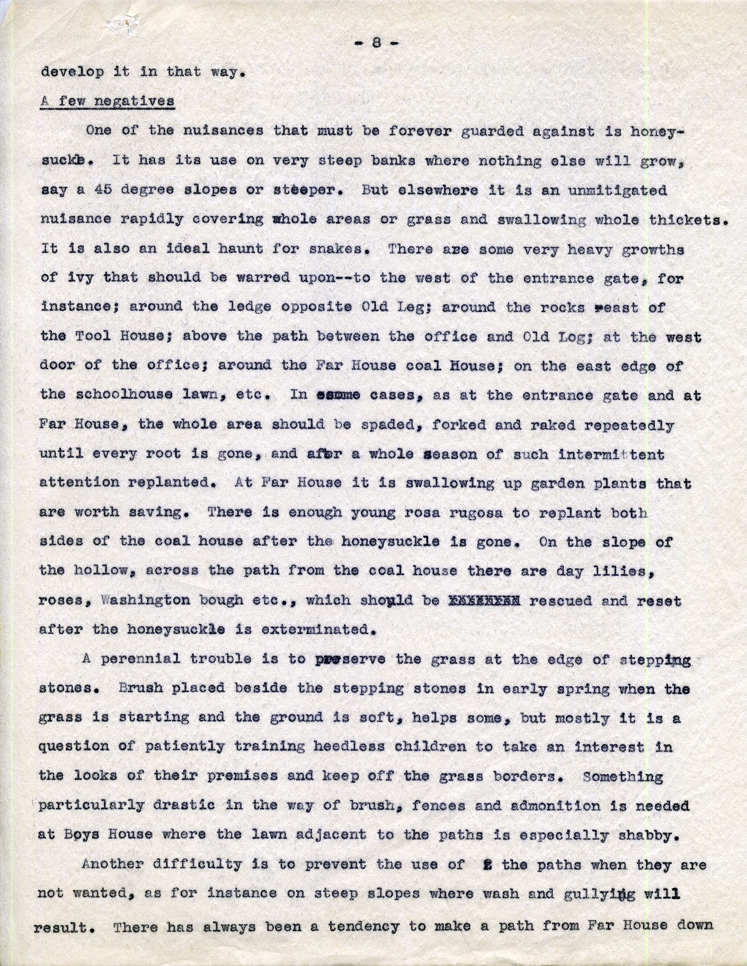 One of the nuisances that must be forever guarded against is honeysuckle. It has its use on very steep banks where nothing else will grow, say a 45 degree slopes or steeper. But elsewhere it is an unmitigated nuisance rapidly covering whole areas or grass and swallowing whole thickets It is also an ideal haunt for snakes. There is some very heavy growths of ivy that should be warred upon—to the west of the entrance gate, for instance, around the ledge opposite Old Log; around the rocks past of the Tool House; above the path between the Office and Old Log; at the west door of the Office; around the Far House coal house; on the east edge of the schoolhouse lawn, etc. In some cases, as at the entrance gate and at Far House, the whole area should be spaded, forked and raked repeatedly until every root Is gone, and after a whole season of such intermittent attention, replanted. At Far House it is swallowing up garden plants that are worth saving. There is enough young rosa rugosa to replant both sides of the coal house after the honeysuckle is gone. On the slope of the hollow, across the path from the coal house there are day lilies, roses, Washington bough etc., which should be rescued and reset after the honeysuckle is exterminated,