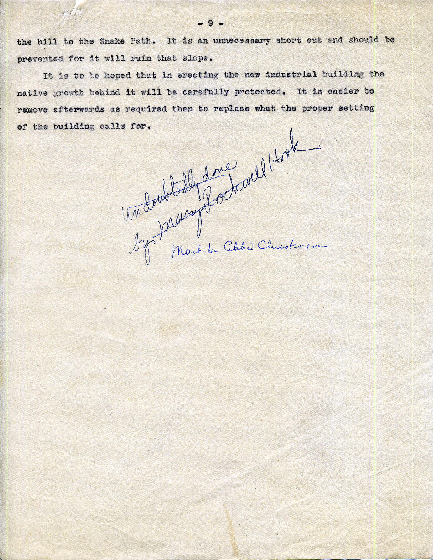 …the hill to the Snake Path. It is an unnecessary short cut and should be prevented for it will ruin that slope. It is to be hoped that in erecting the new Industrial building [Draper Industrial Building] the native growth behind it will be carefully protected. It is easier to remove afterwards as required, than to replace what the proper setting of the building calls for.