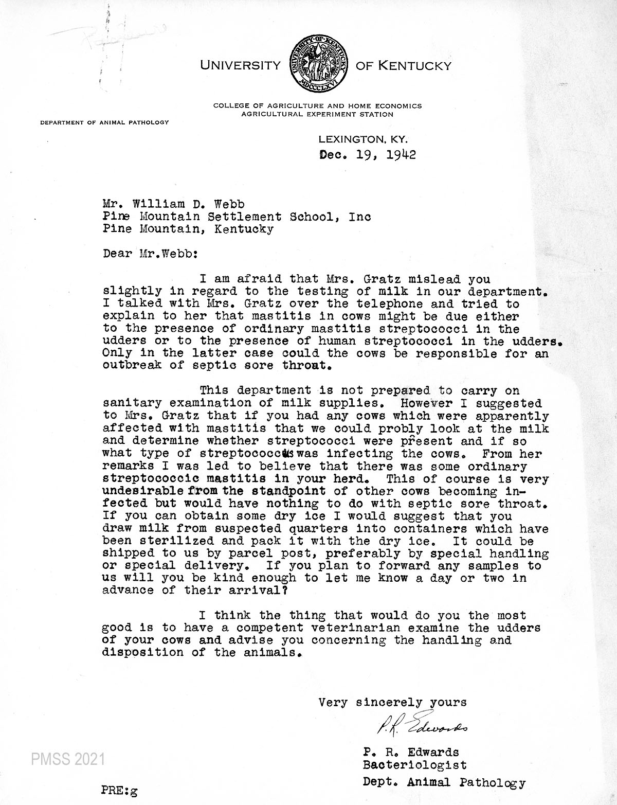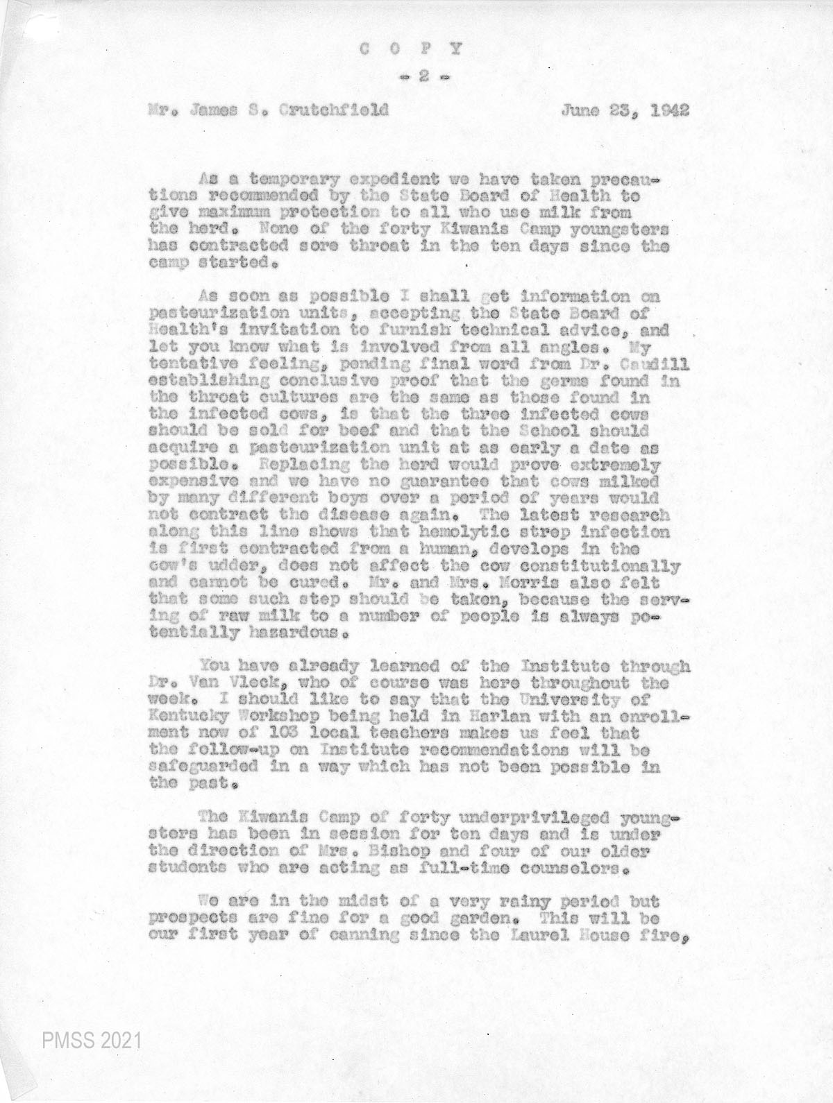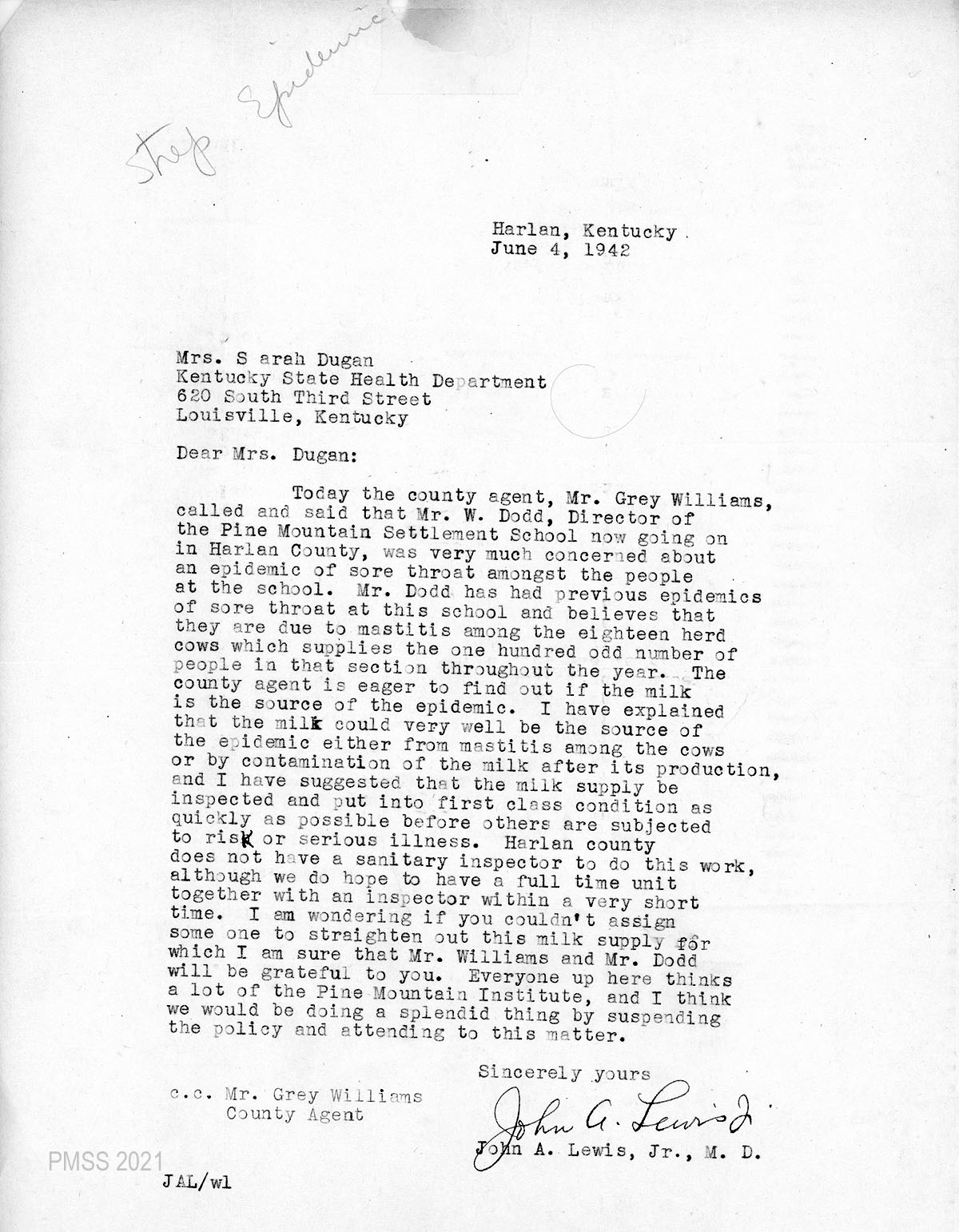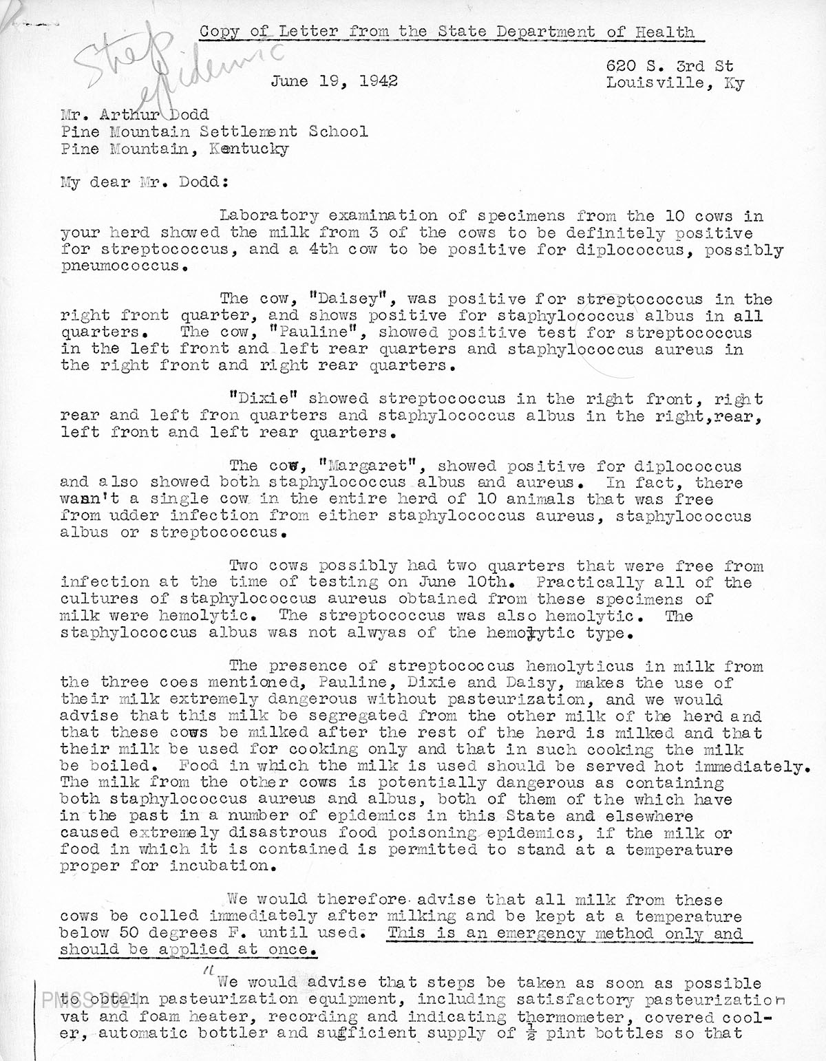 On June 4, 1942, Arthur Dodd, who was acting as an interim Director, contacted Mr. Grey Williams, the County Agent in Harlan County, alerting him of a break-out of multiple sore throats at the School. It was not the first of the break-outs and Mr. Dodd, suspecting the infection was due to mastitis among the cow herd, called for an inspection to correct the situation.