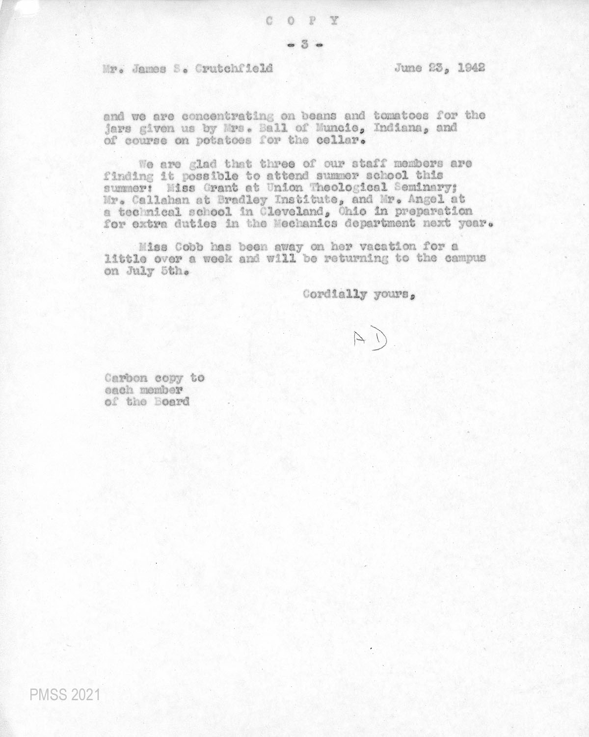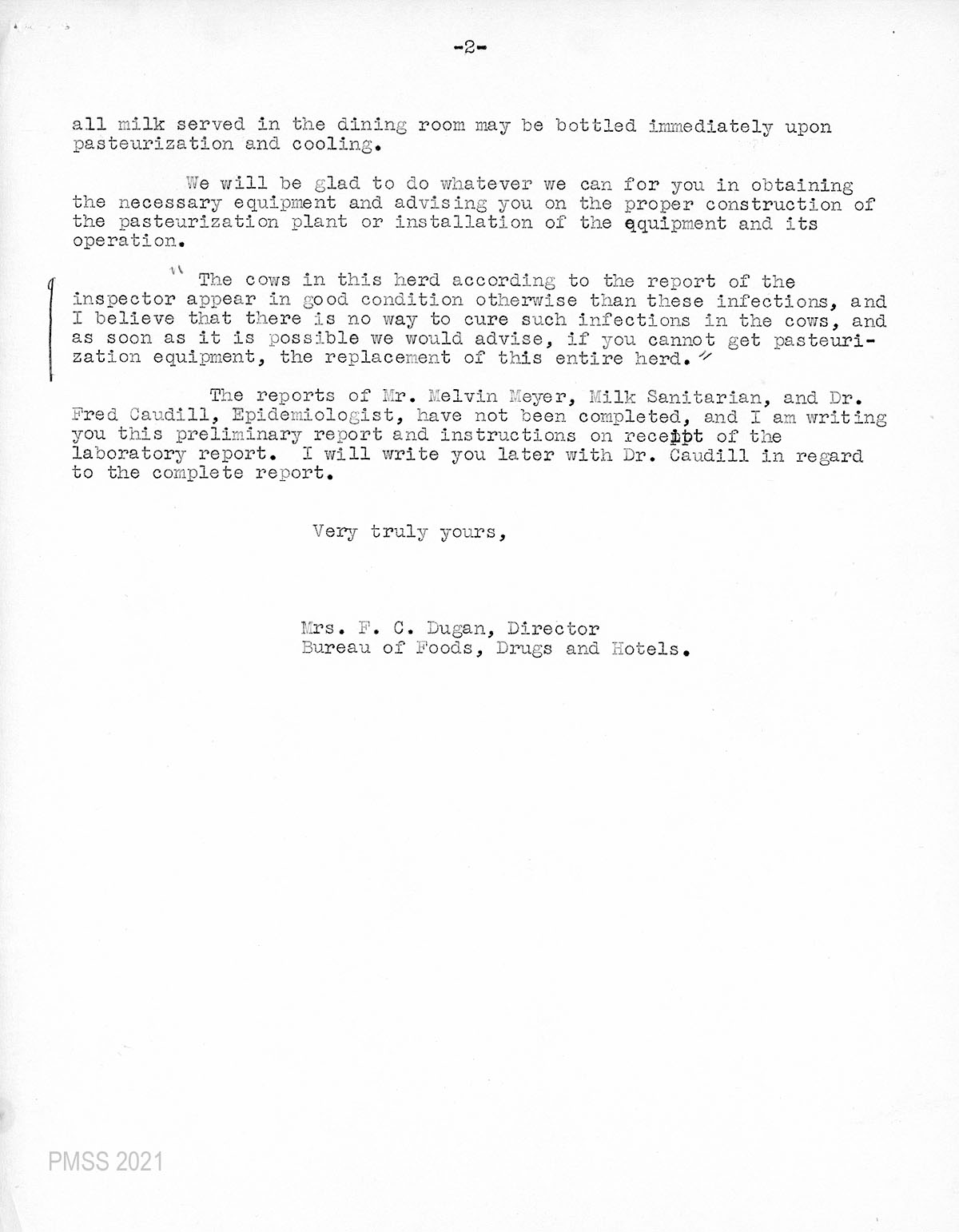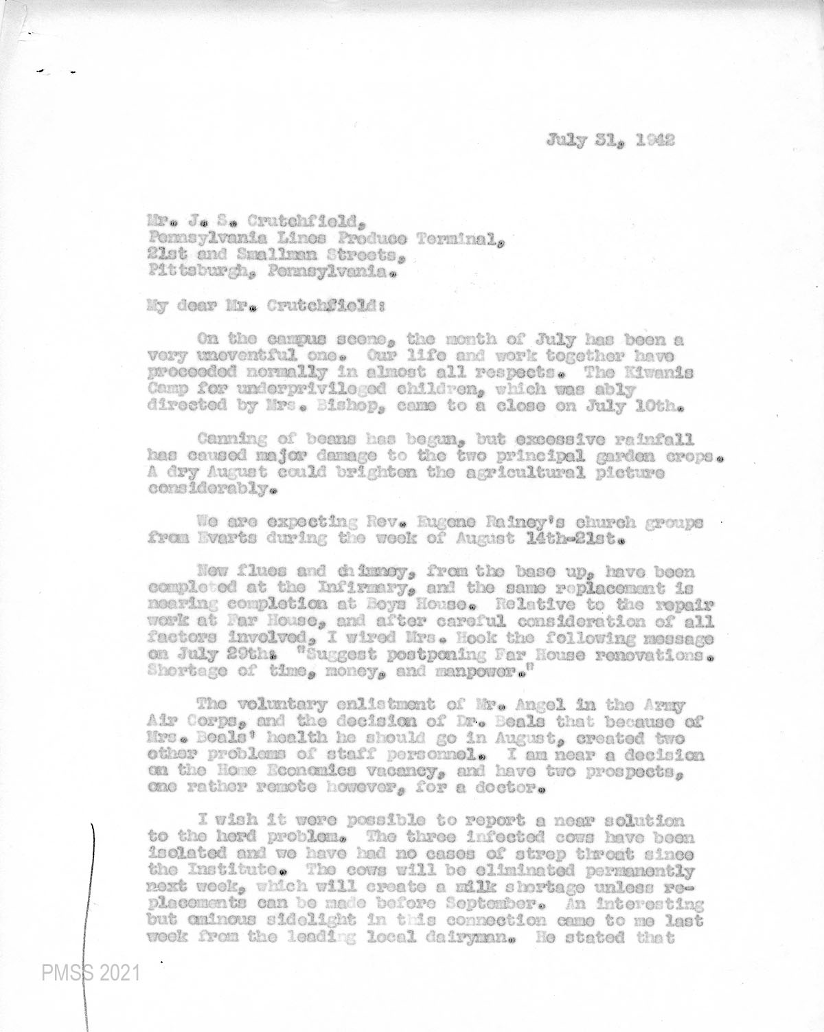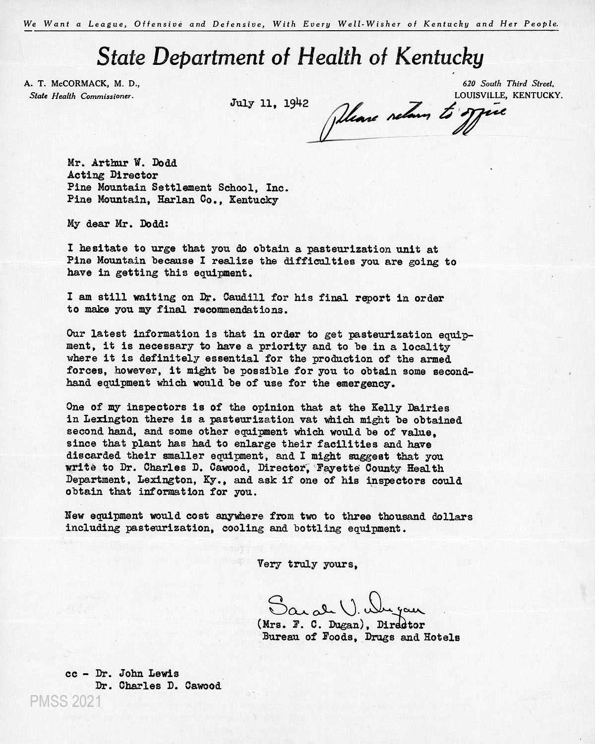Mrs. Sarah Dugan followed up on July 11 regarding the pasteurization equipment and cautioned that because of the war (WWII) that the School would be competing with the needs for essential equipment for the armed forces. Further, she cautioned that the cost might be from two to three thousand dollars for new equipment. She then offered that it might be possible to obtain second-hand equipment and supplied the names of contacts.