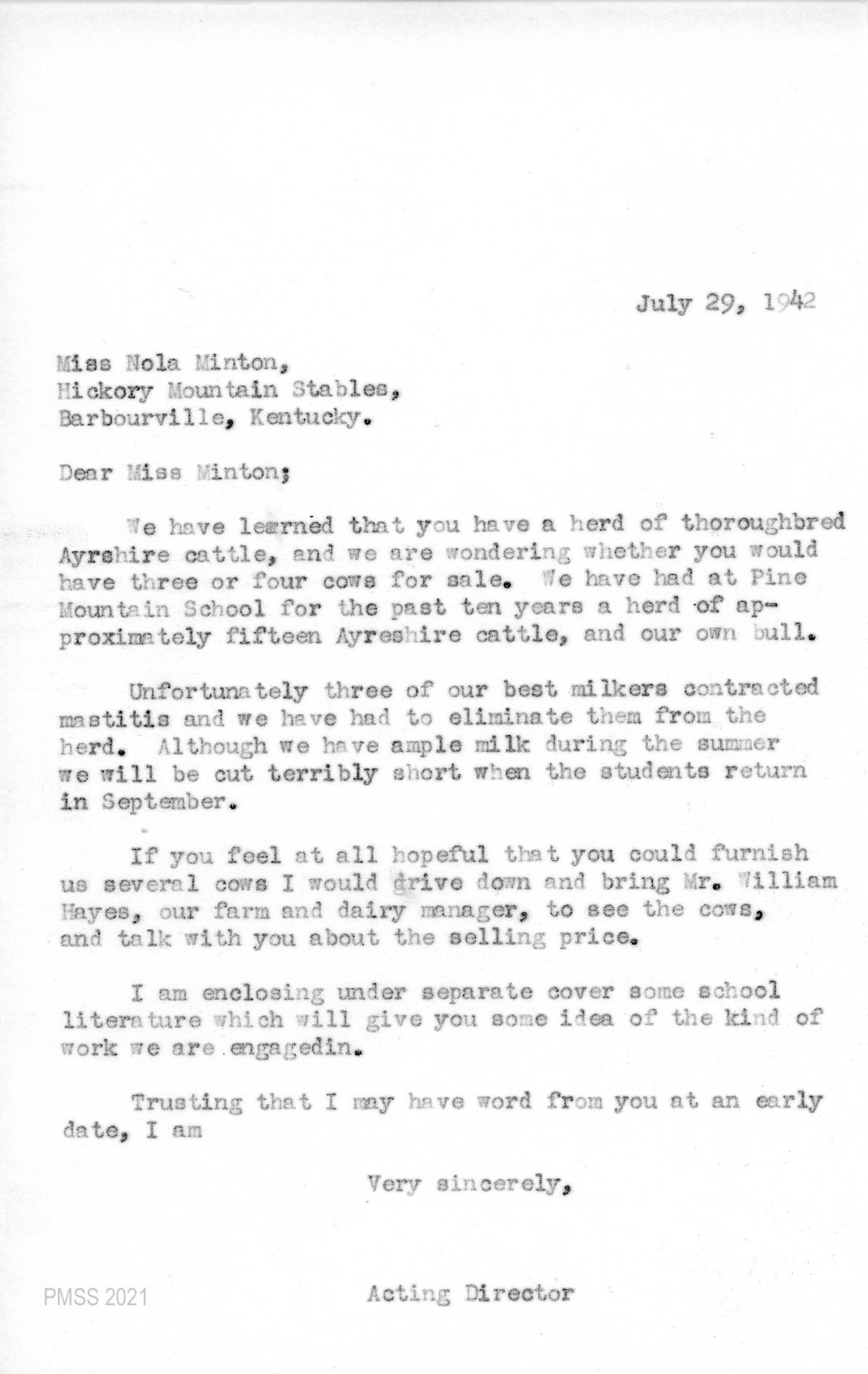 On July 29th there was then an immediate scramble to replace the infected cows to counter the steep cost to obtain a pasteurization unit. A letter was written by Dodd to Miss Nola Minton in Barbourville, Kentucky, on July 29, asking if she might have three Ayrshire for sale. Also, BOT Chair J.S. Crutchfield was notified of the emergency,and copies of the notification were sent to the remaining BOT members.