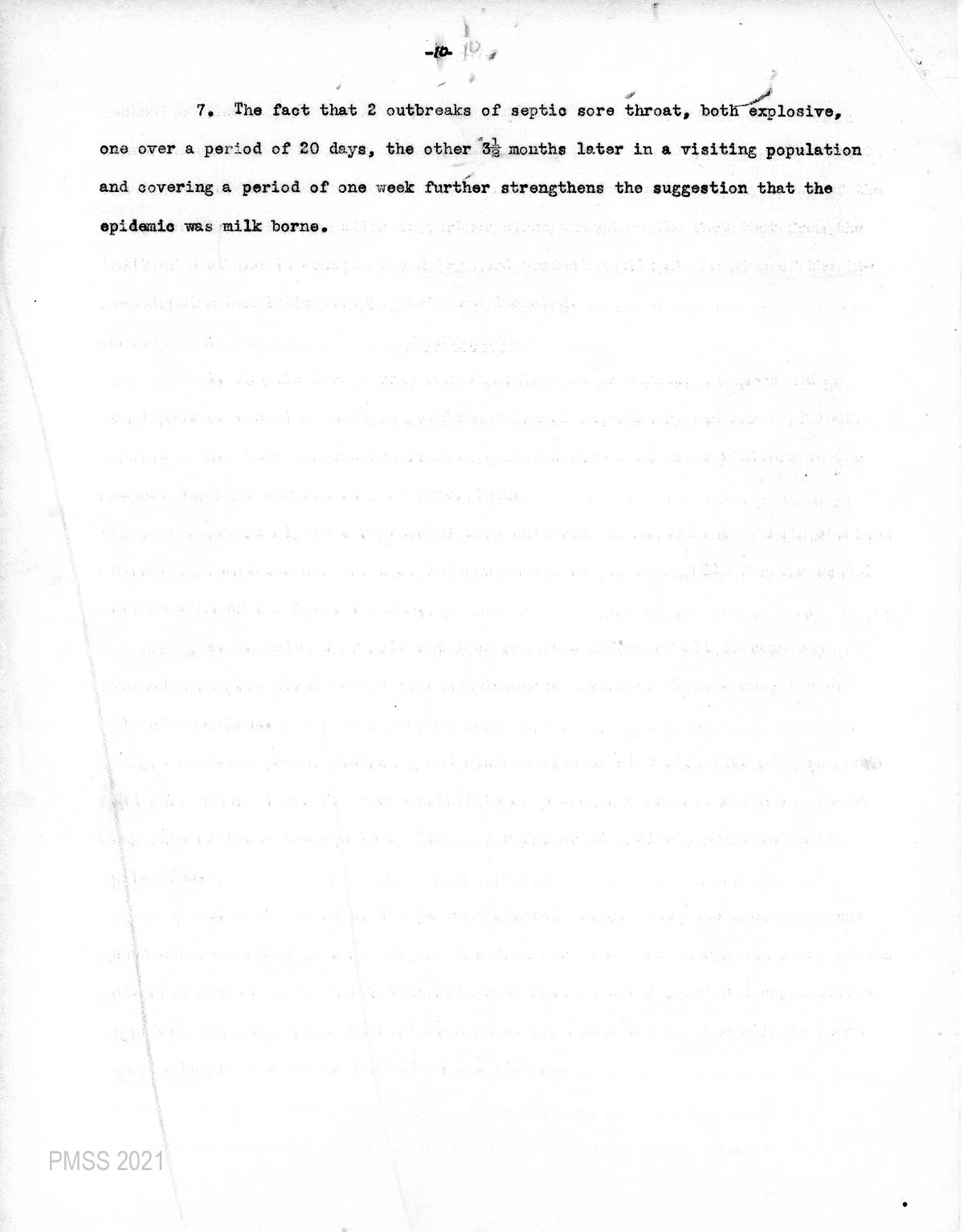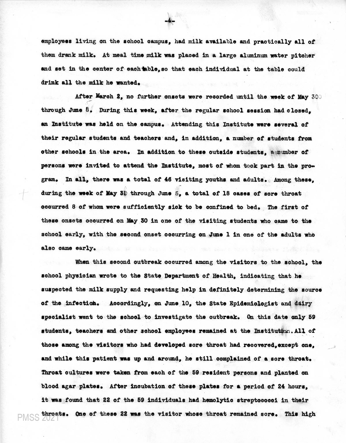 A comprehensive study and report of the sore throat epidemics at the School were made and an 8-page analysis was compiled of the events surrounding the outbreaks. Also, a list of conclusions was drawn from the sequence of events. [strep_throat_epidemic_010 -010h]