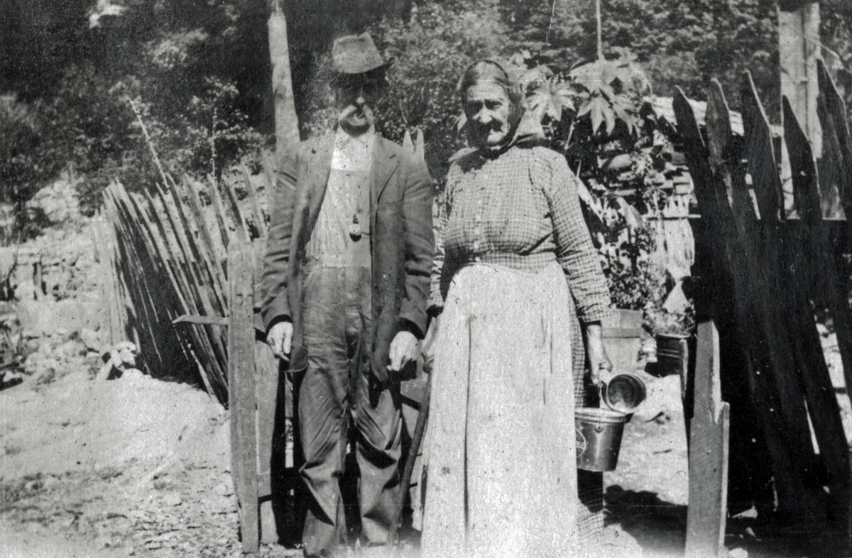 - 051 Uncle John Fiddler and Aunt Luisa; A log from Sawmill goes past Big Log House.