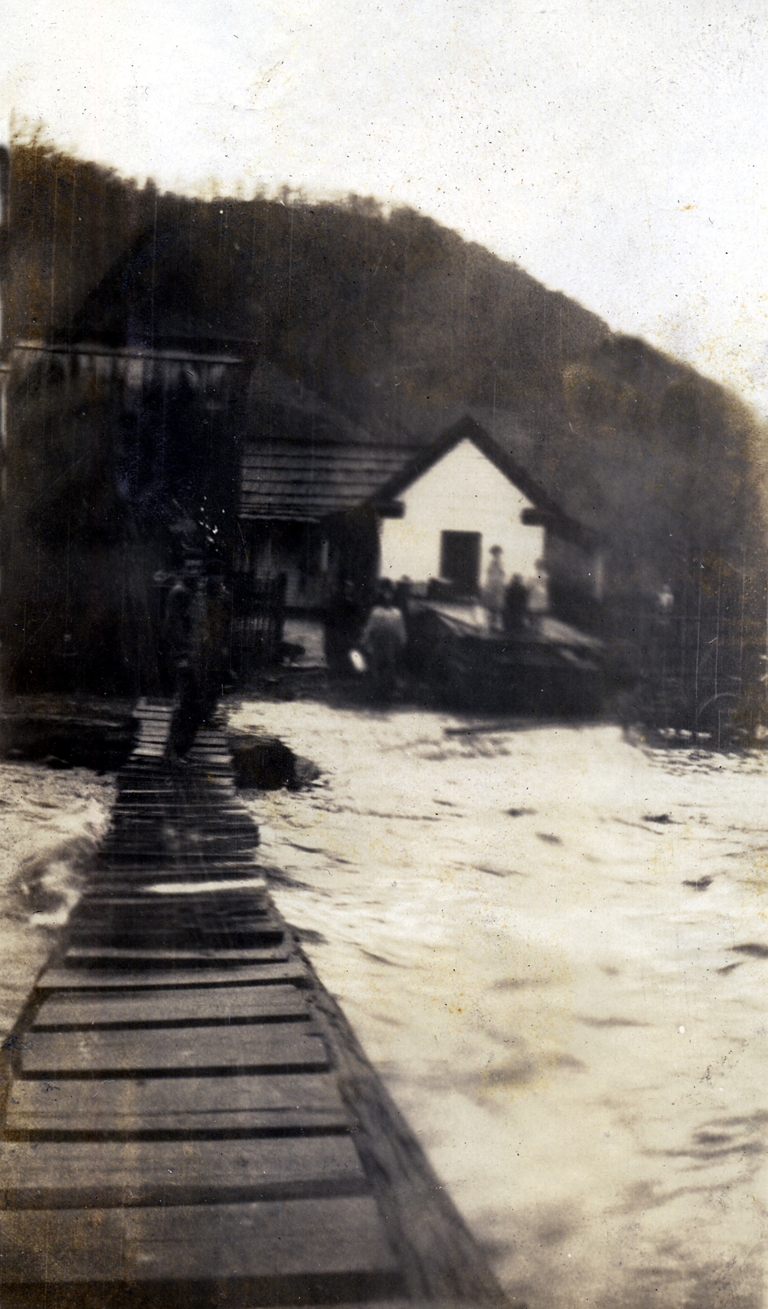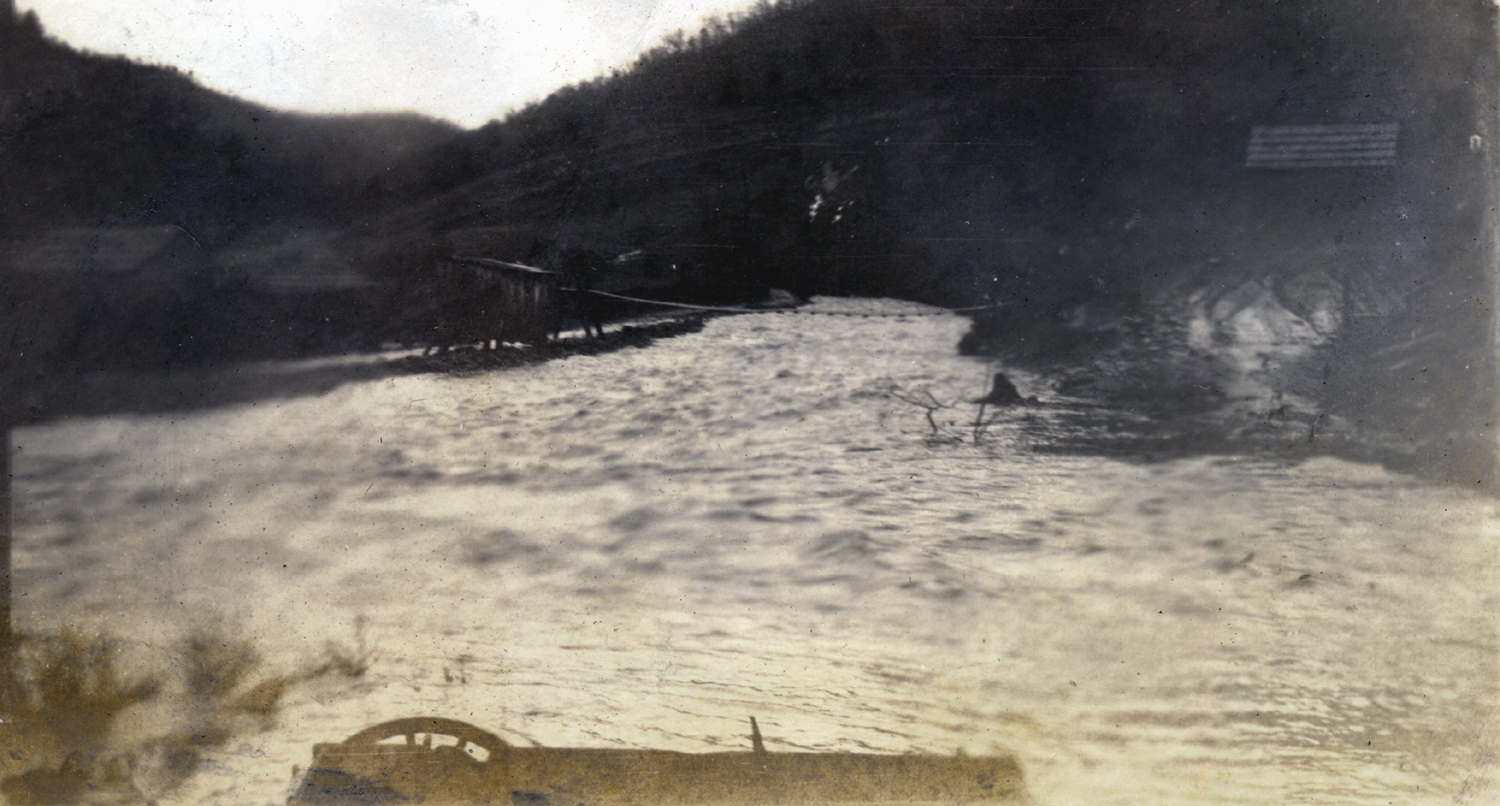 - Near Medical Settlement, Big Laurel. “Footlog across Greasy Five Feet [creek] and covering in high water. December 1924.”nesb_017_mod.jpg