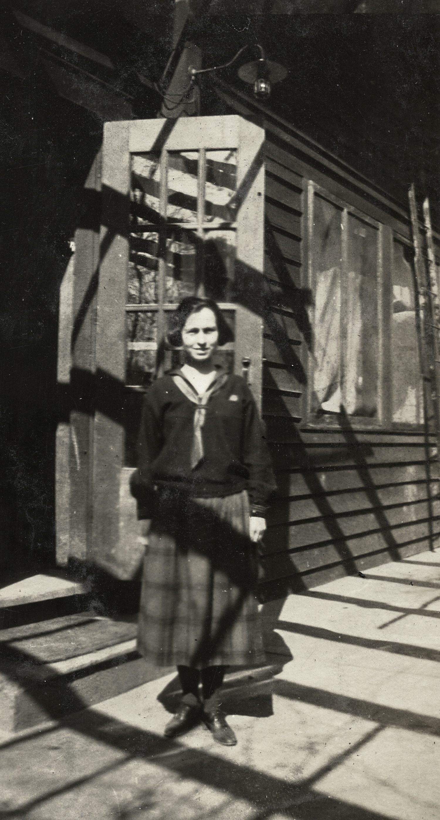 - Aileene Lewis standing on steps of the Office at Pine Mountain [damaged photograph] [nesb_040_mod.jpg]