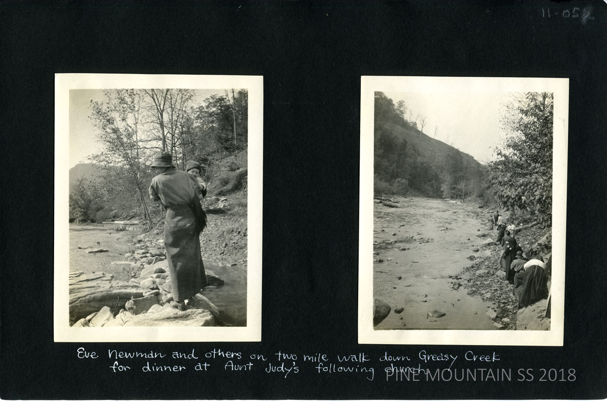 - 086 Eve Newman and others on two-mile walk down Greasy Creek for dinner at Aunt Judy’s following church.