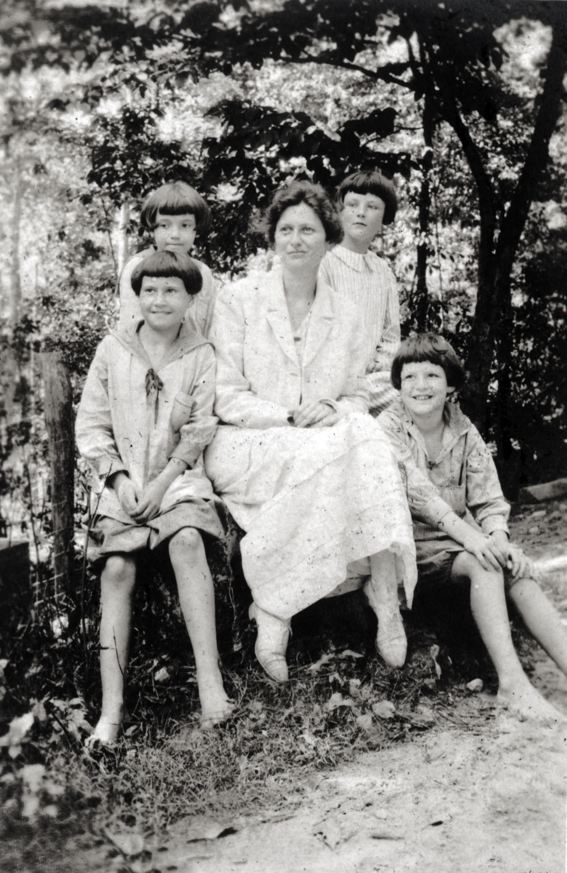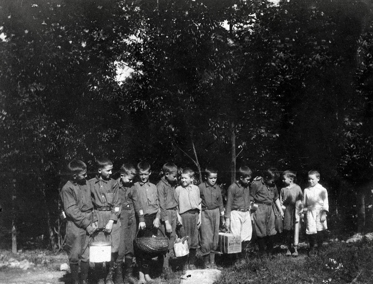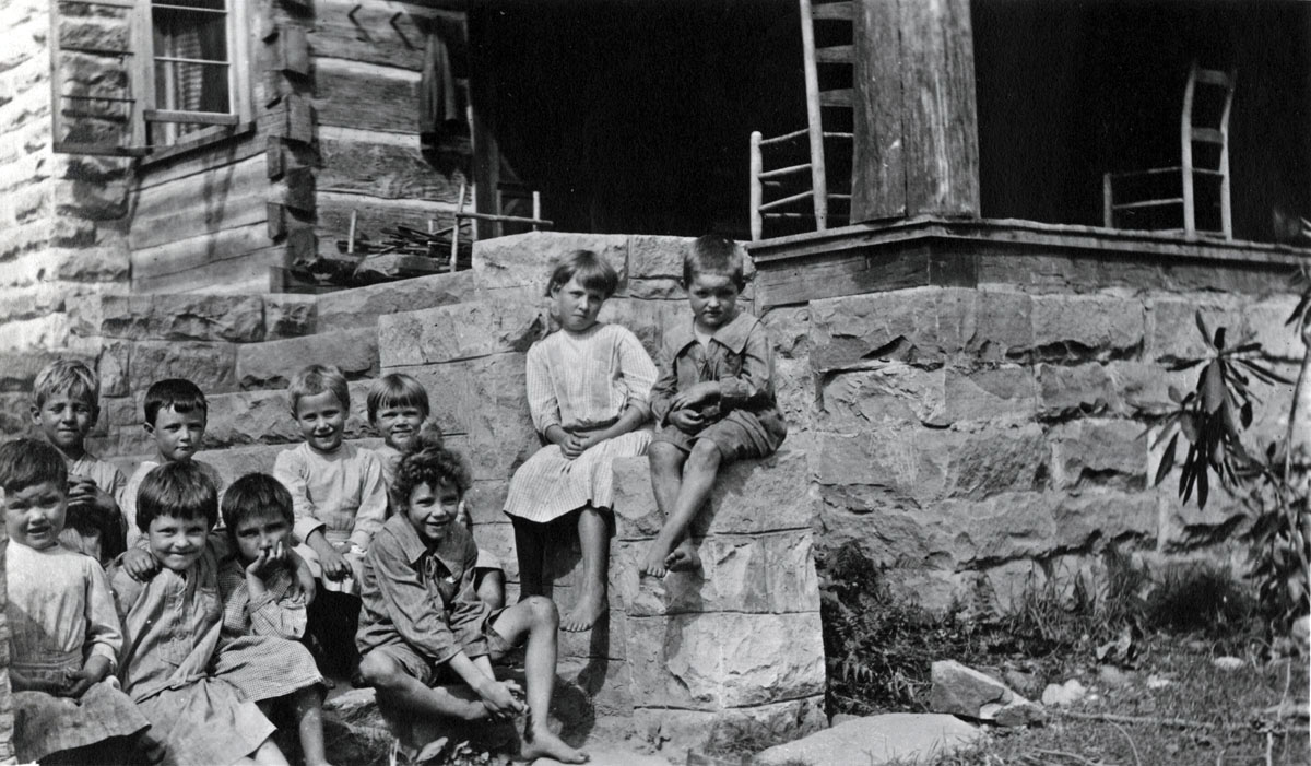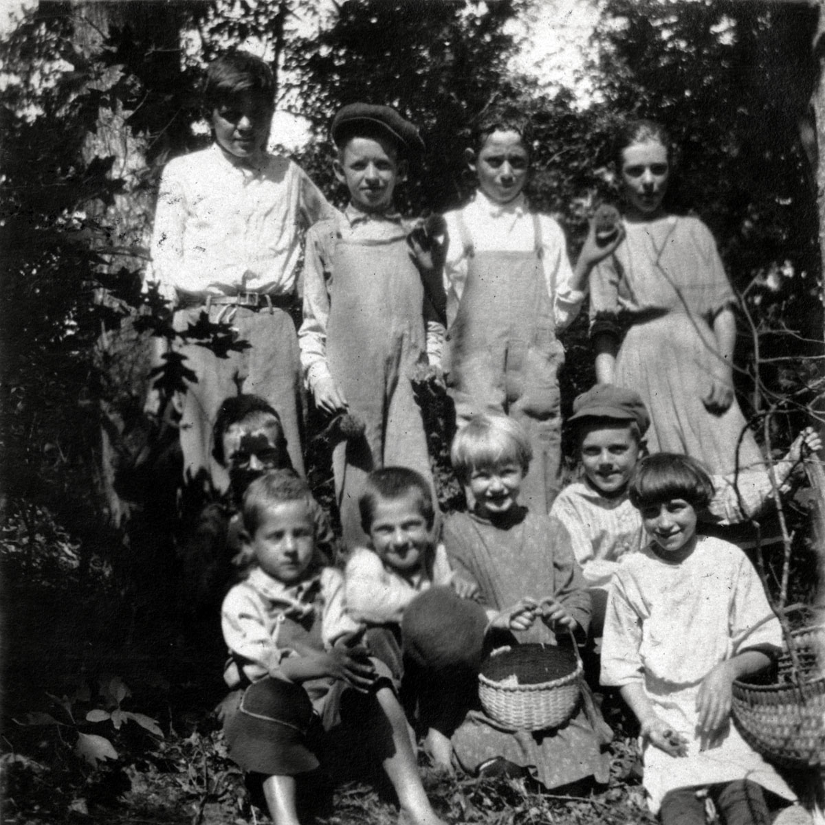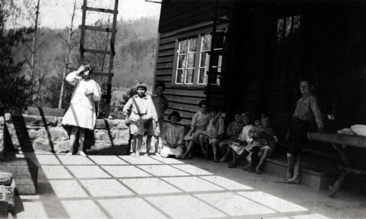 - 124 [Two women and man (possibly Philip Roettinger) with large group of children and cabin behind; Ethel McCulough seated on steps of Old Log with children and cats. Wilson Lewis, one of the boys; Minnie Callahan; [May Day and children winding maypole; [Laurel House I]